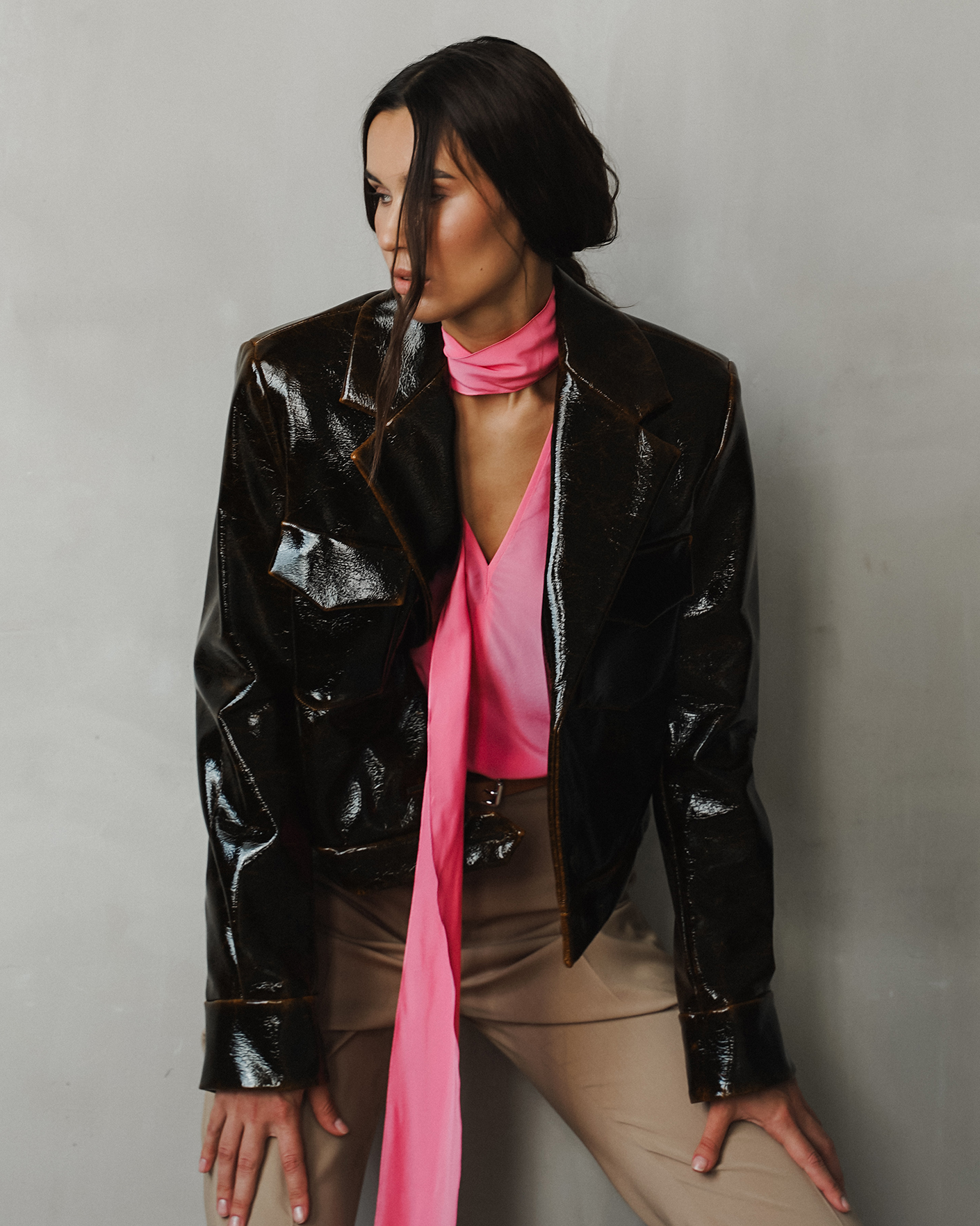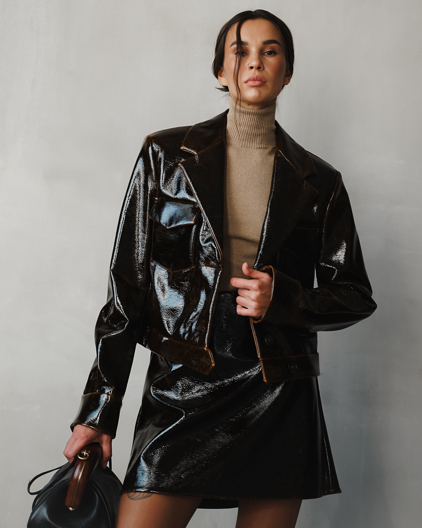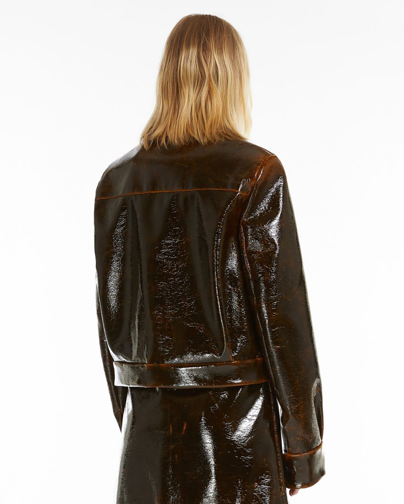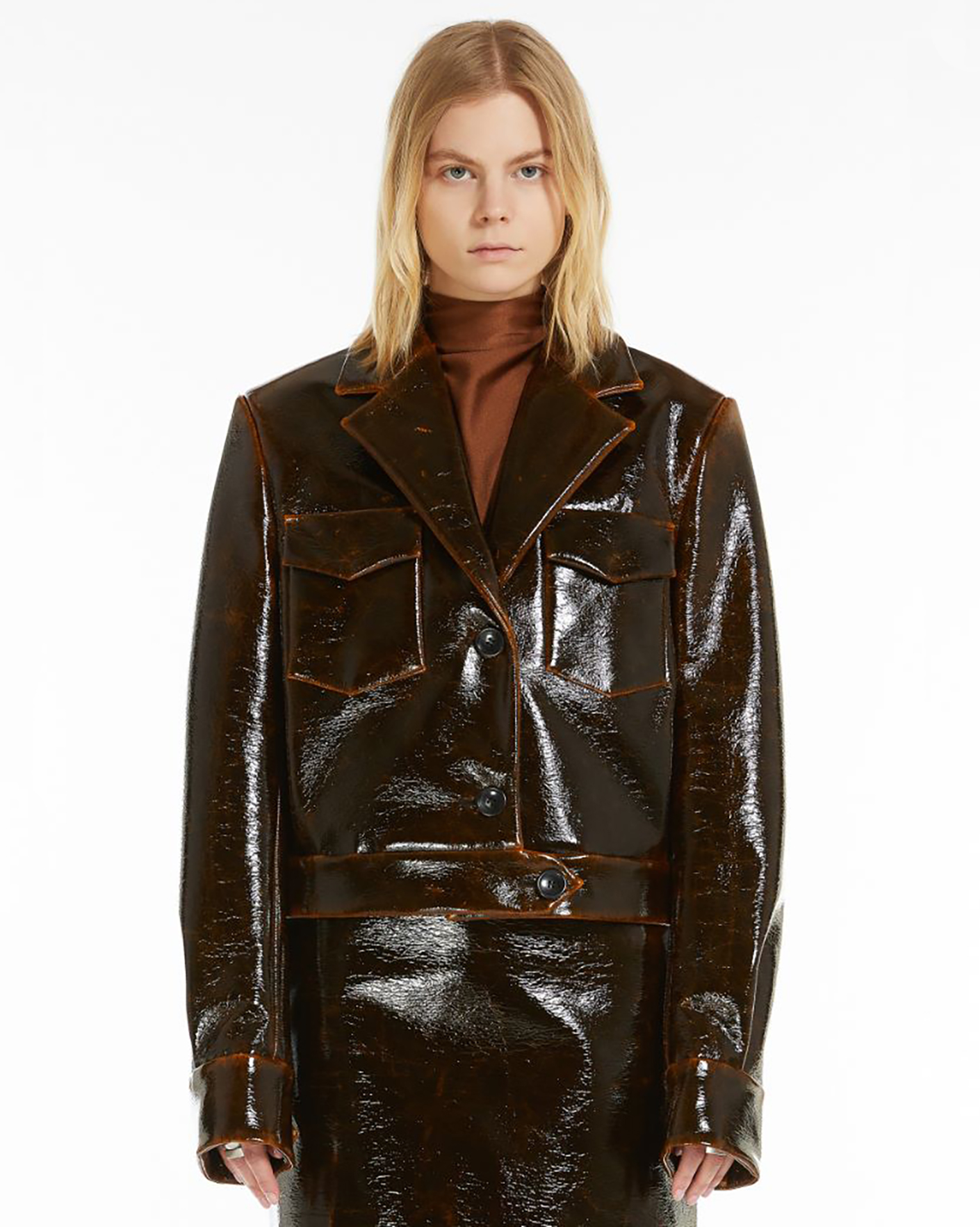 Стильная куртка Sportmax коричневого цвета с покрытием. Укороченная модель с лацканами, застежка на пуговицы, имеются накладные карманы с клапанами. Куртка станет фаворитом вашего гардероба.