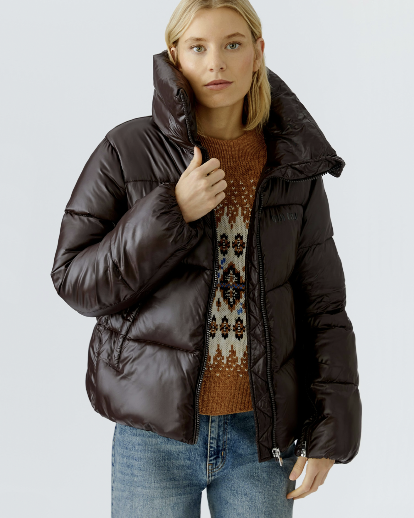 Утепленная куртка OUI темно-коричневого цвета с блеском. Укороченная модель с воротником-стойка, застежка на молнию, боковые карманы, а также ширина рукава регулируется с помощью молнии сбоку. Куртка станет незаменимым спутником на каждый день.