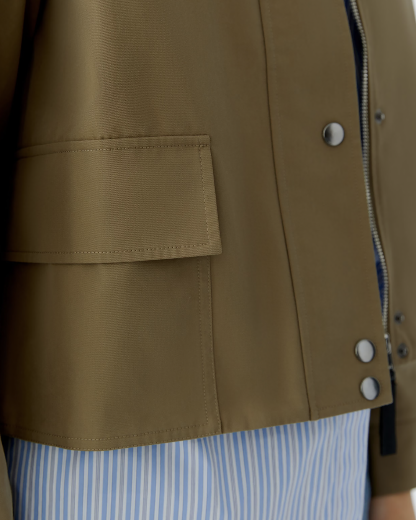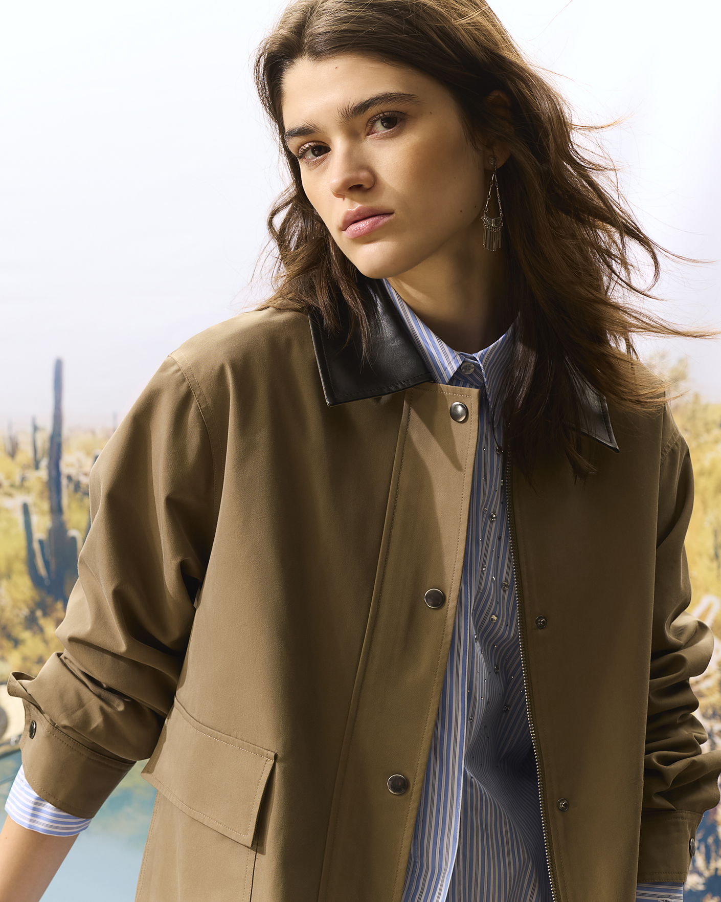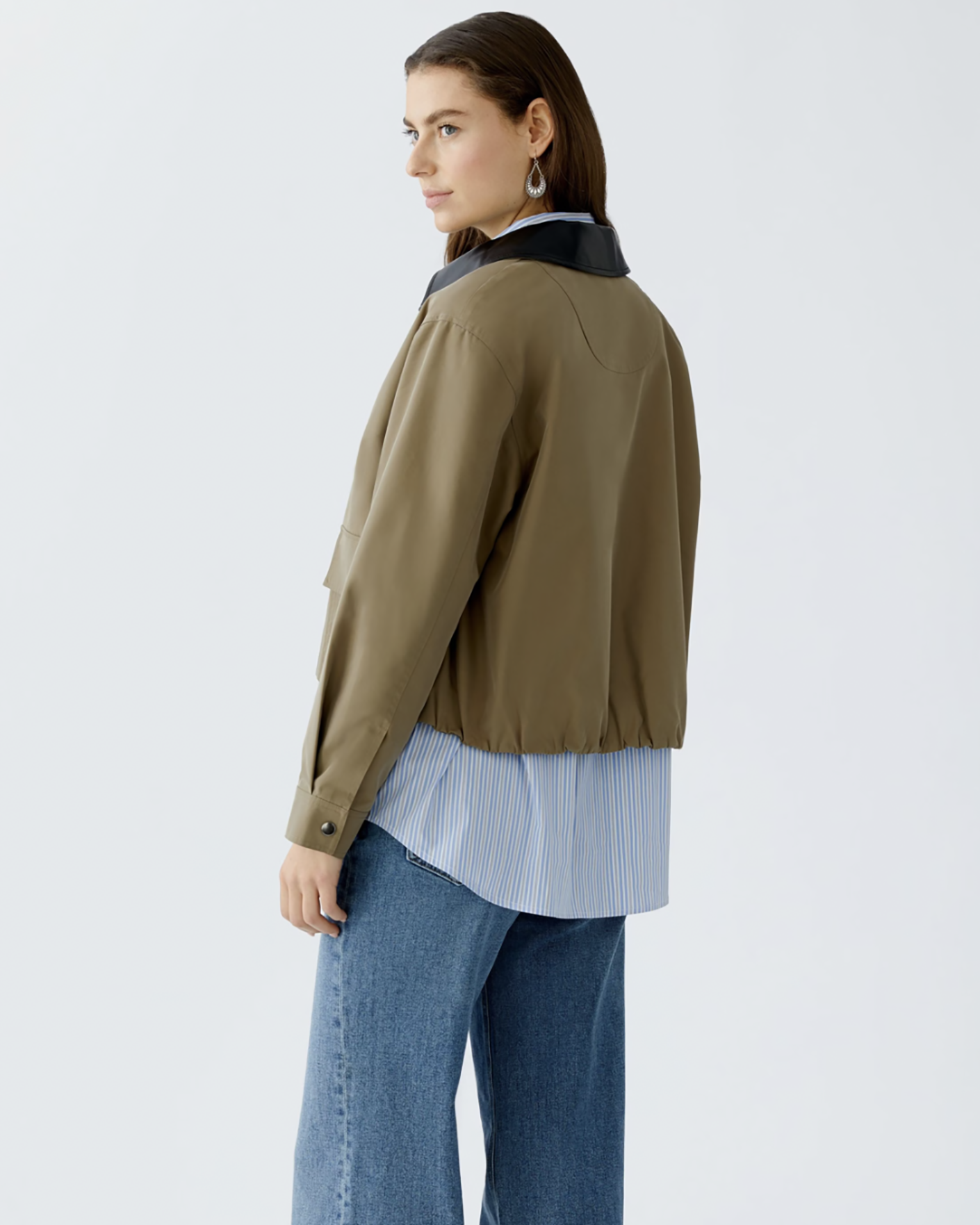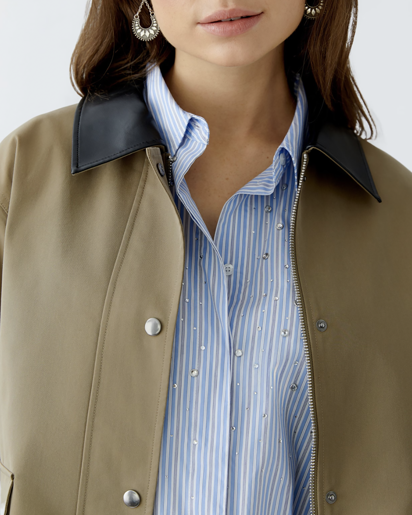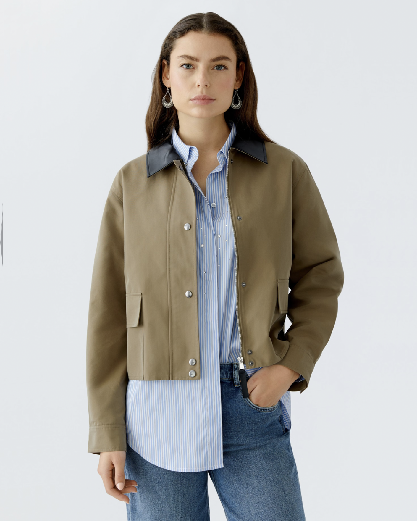 Стильная ветровка OUI бежевого цвета. Модель с контрастным отложным воротником, застежка на скрытую молнию и планку на кнопки, накладные карманы с клапанами по бокам. А также низ по спинке на резинке. Ветровка станет фаворитом вашего гардероба.