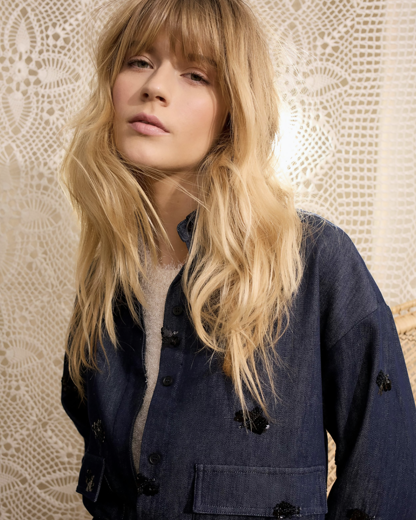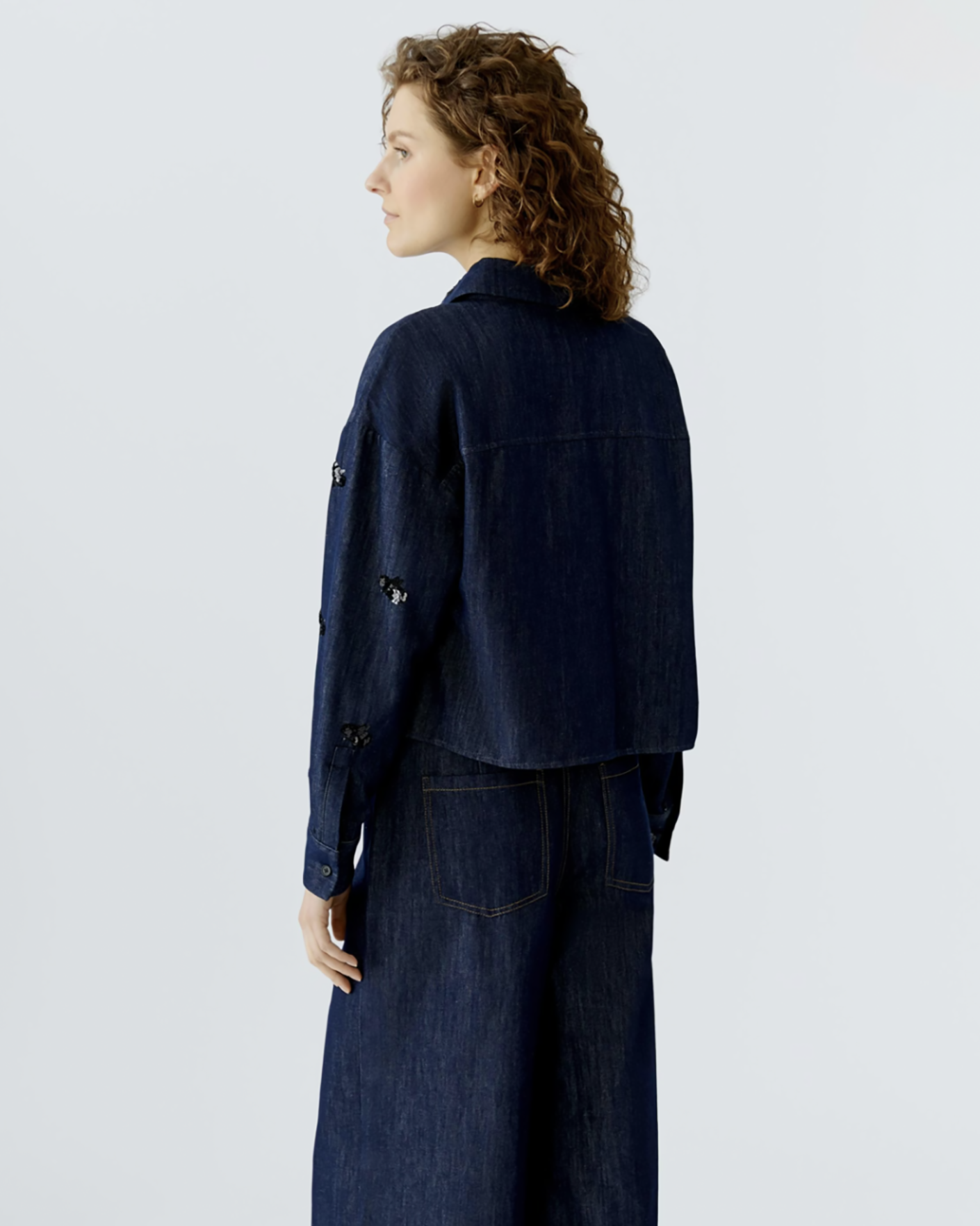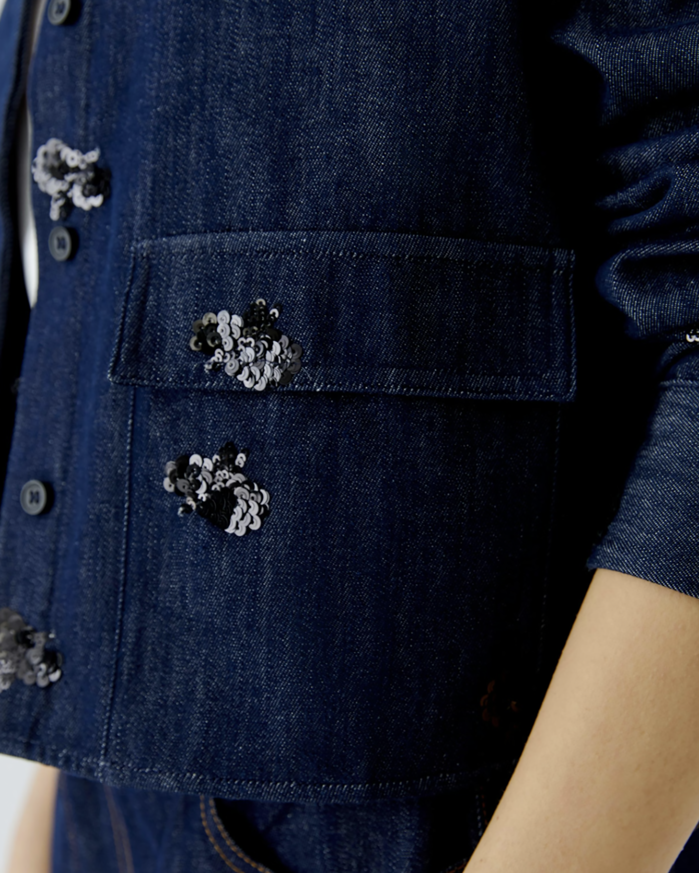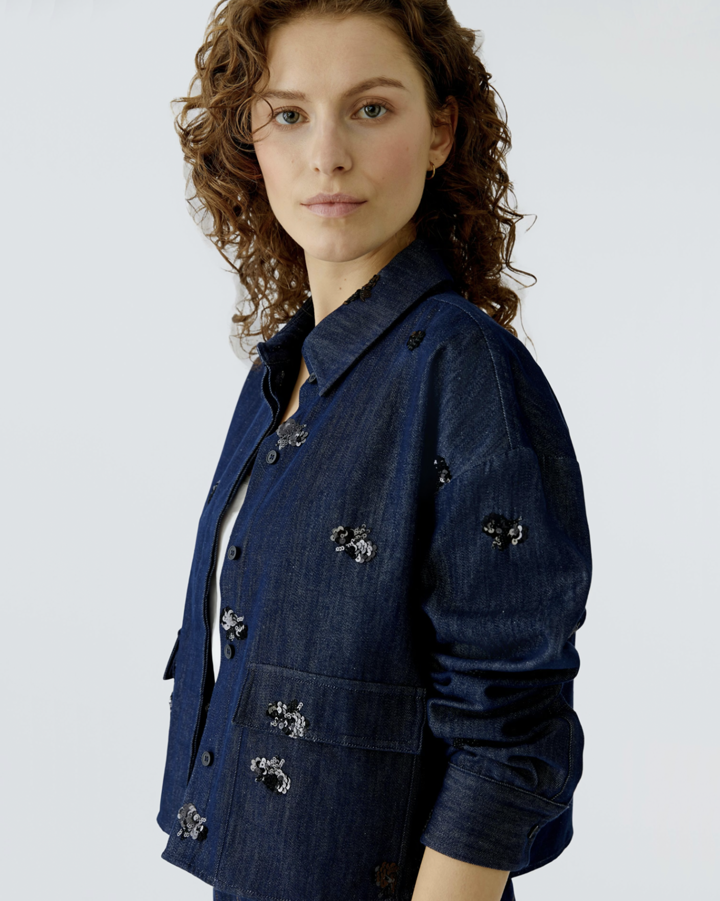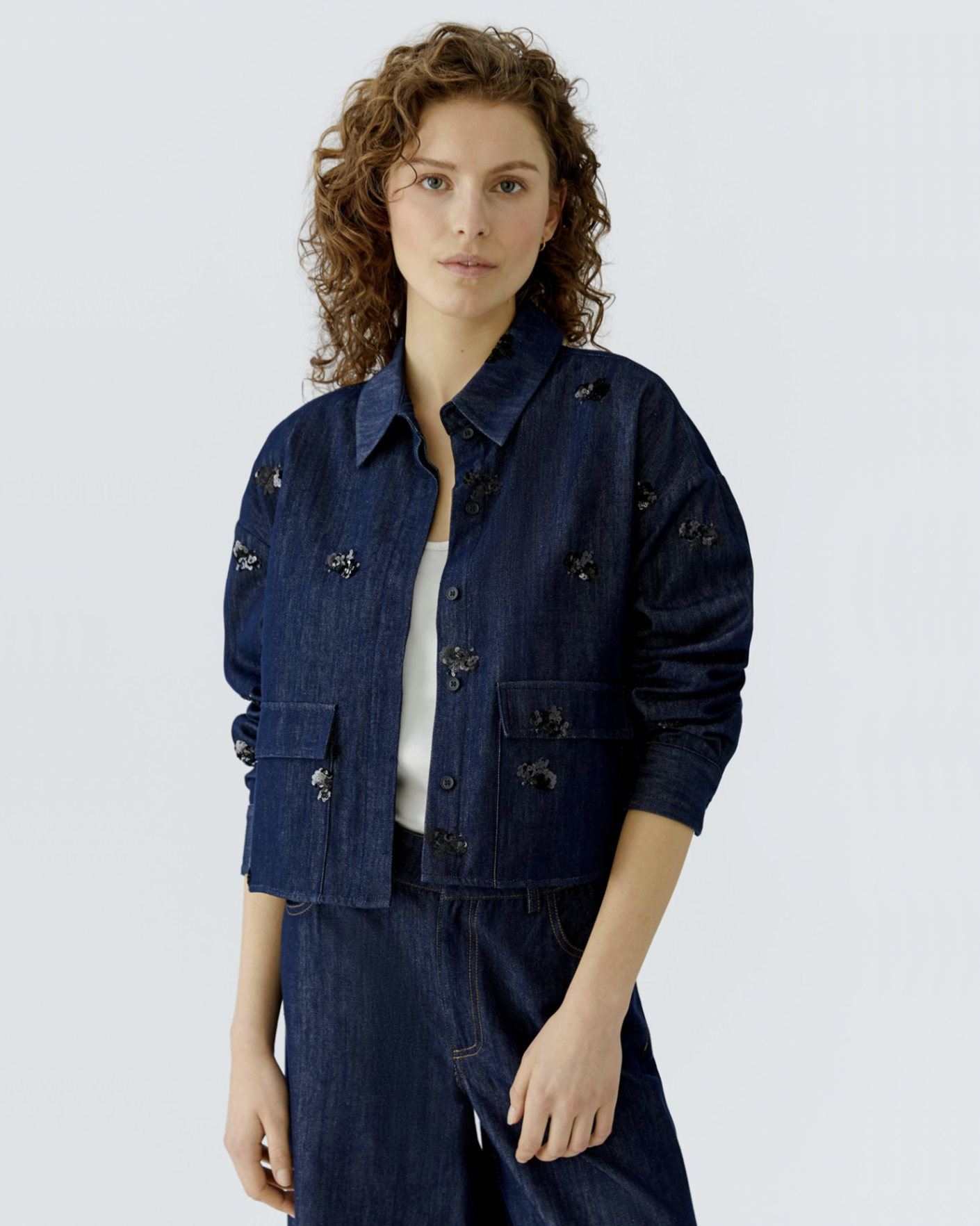 Джинсовый жакет-рубашка OUI темно-синего цвета с декором в виде пайеток. Хлопковая модель с отложным воротником, скрытая застежка на пуговицы, имеются карманы с клапанами по бокам. Стильный жакет-рубашка можно сочетать с топом, майкой, футболкой, рубашкой, юбкой и джинсами.