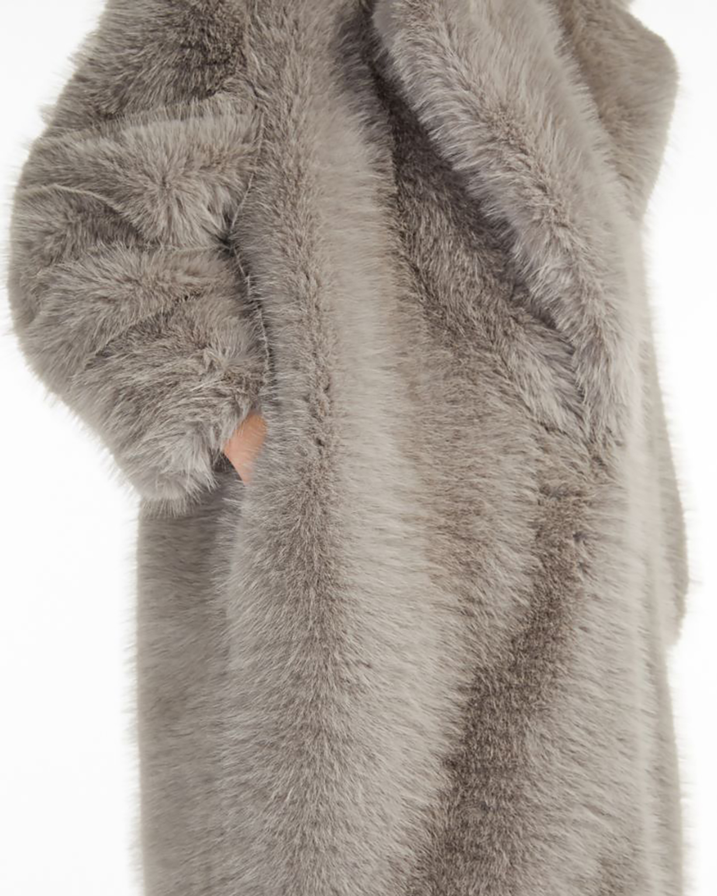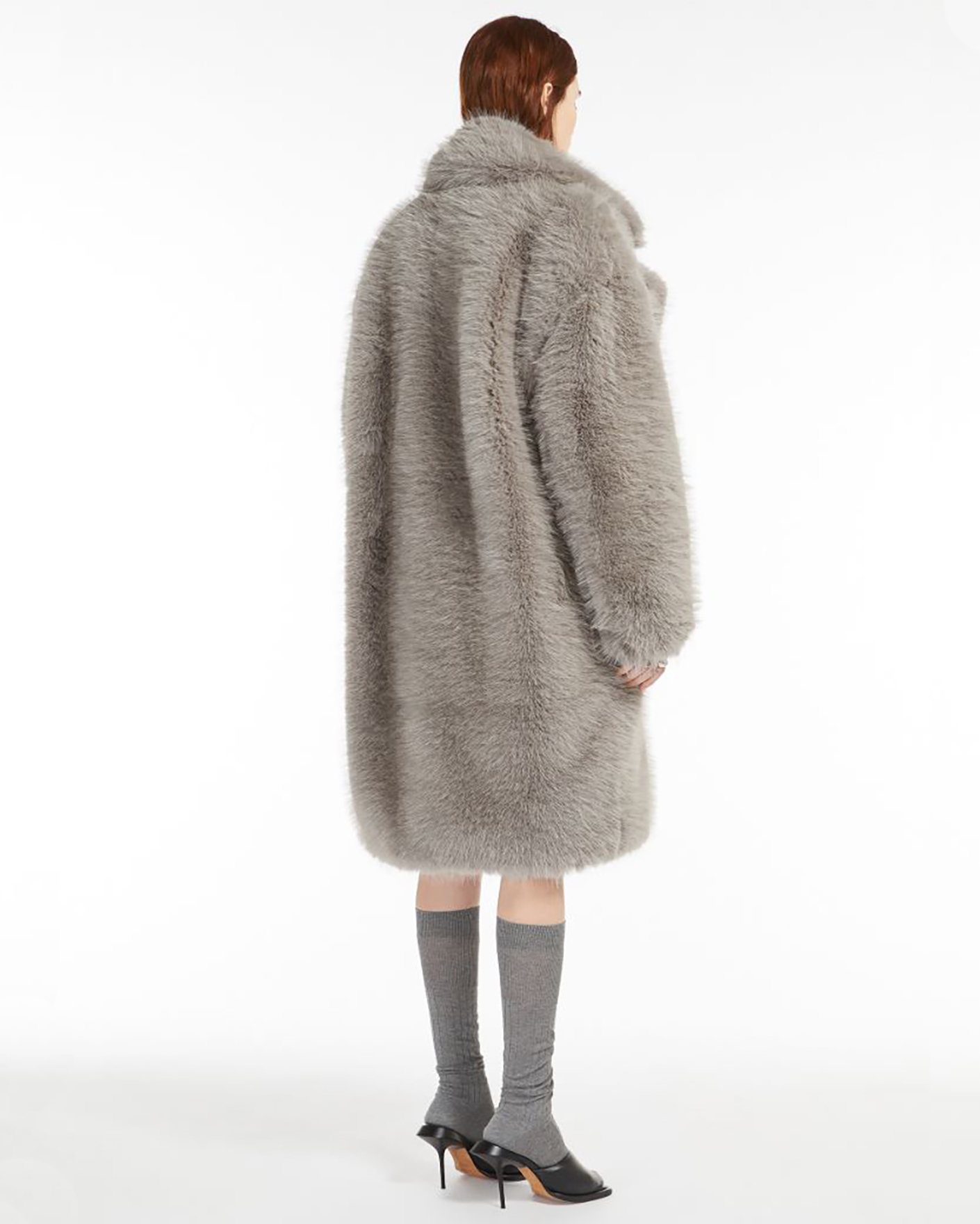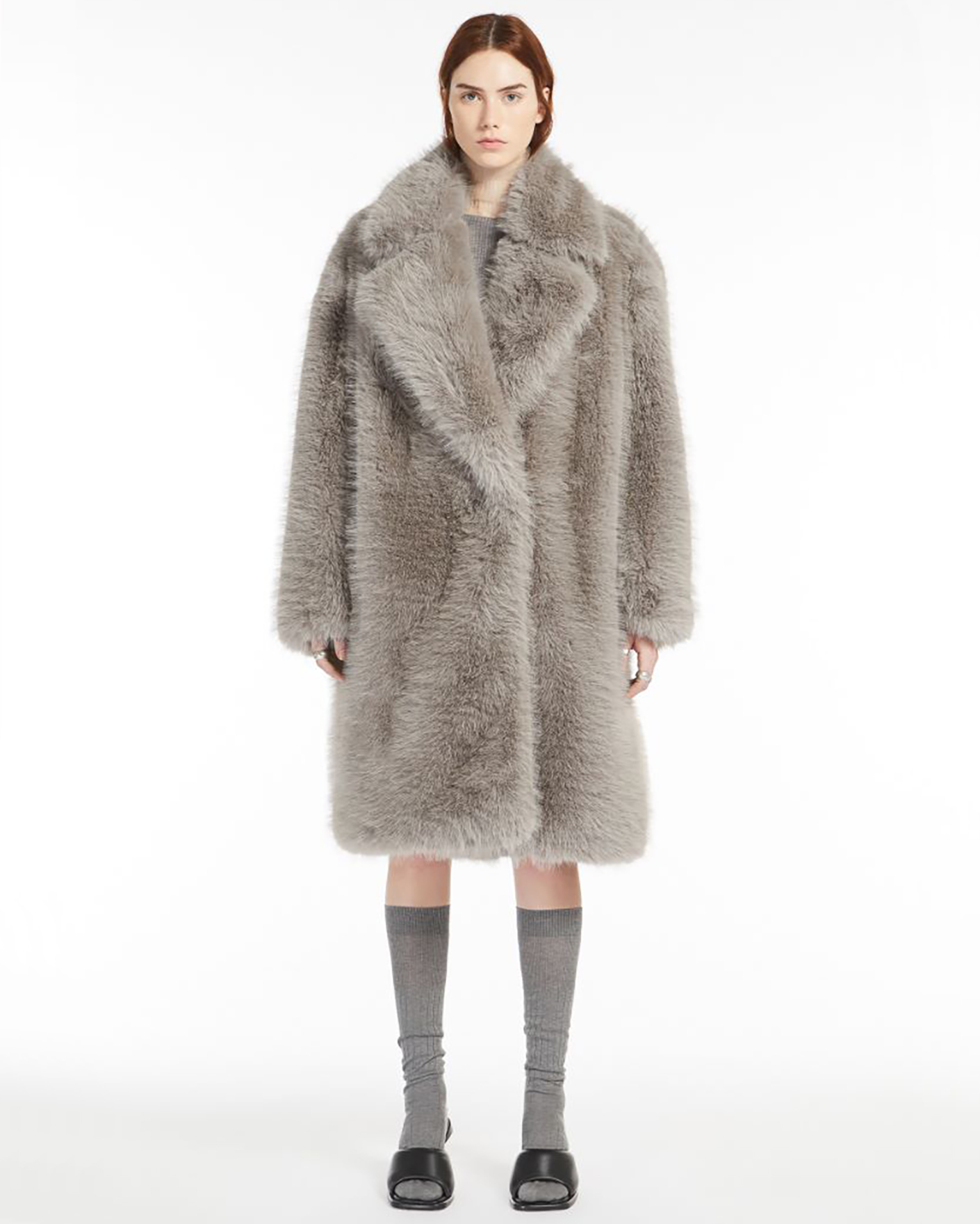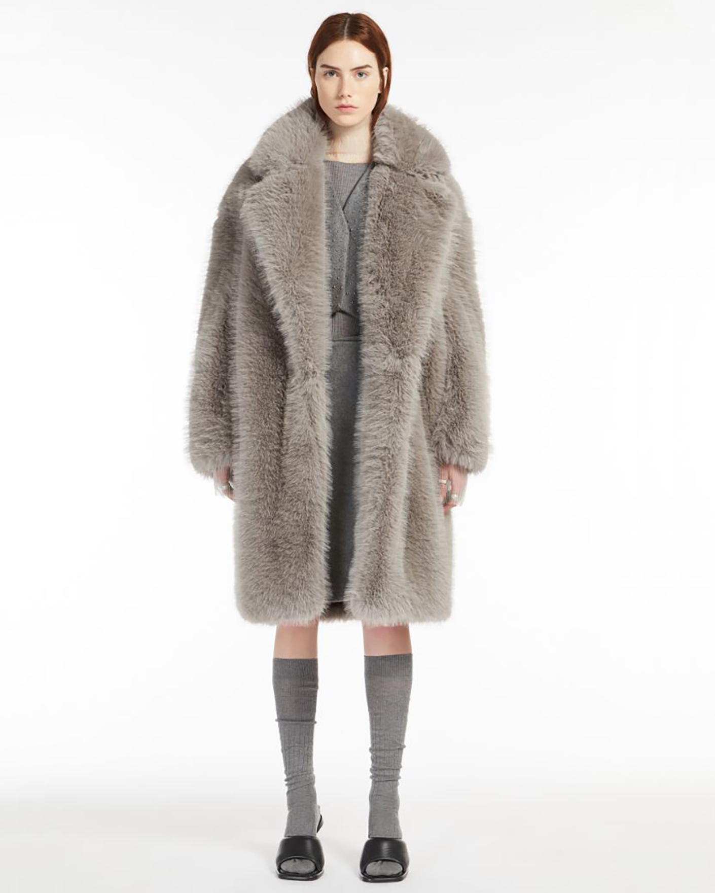 Пальто Sportmax серого цвета из ткани, имитирующей искусственный мех. Модель на запахе с отложным воротником и лацканами, скрытая застежка. Стильное пальто станет акцентной вещью на каждый день.