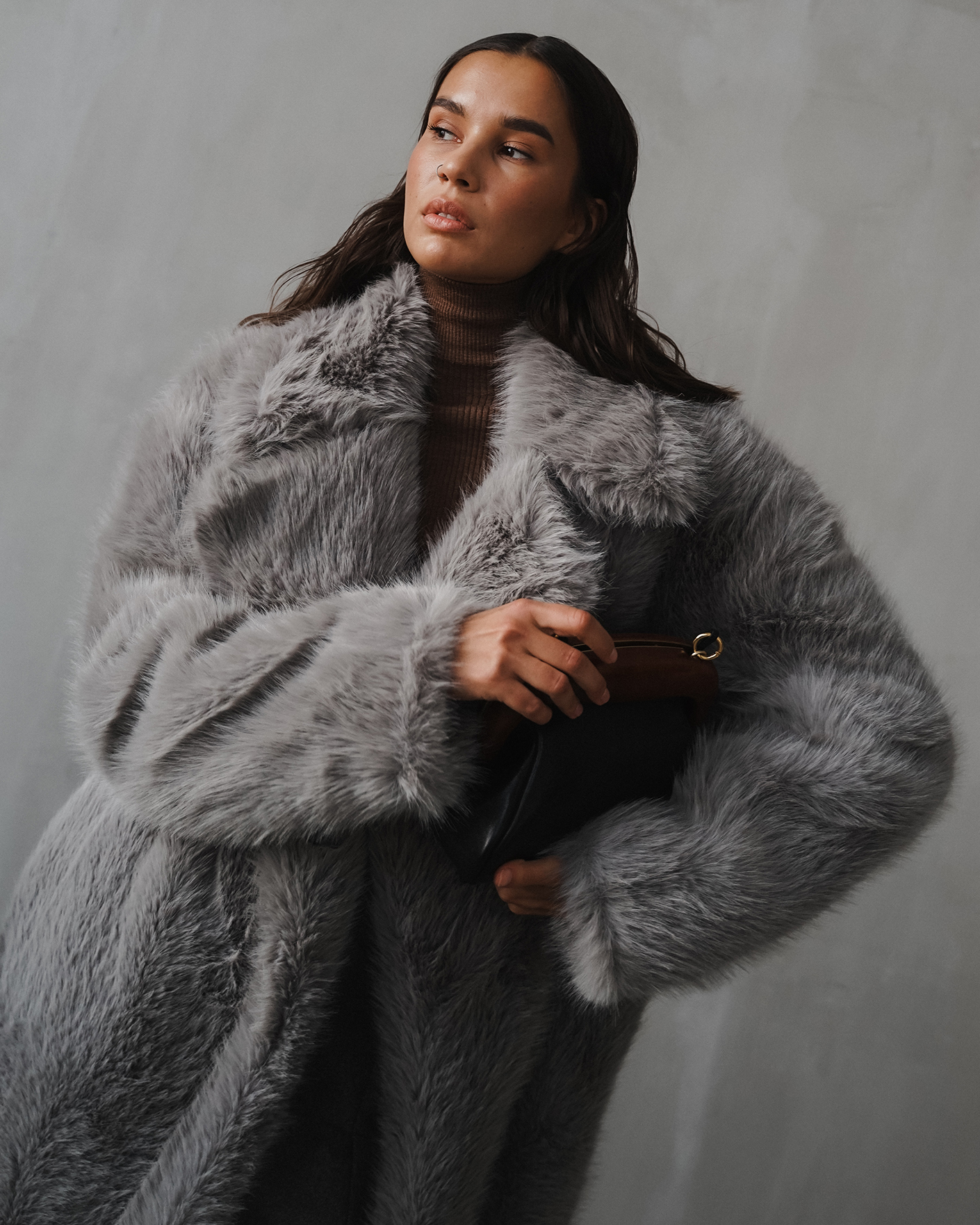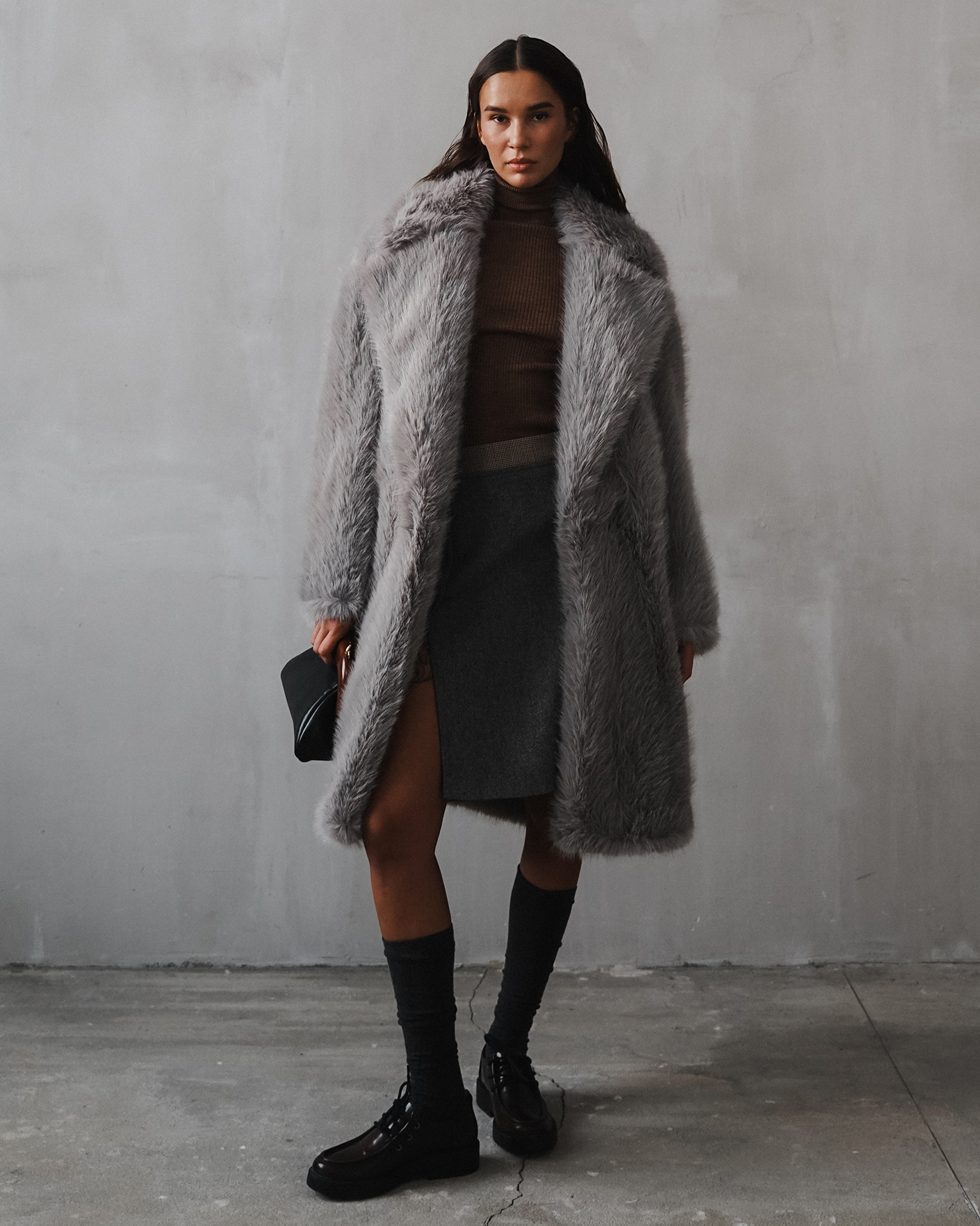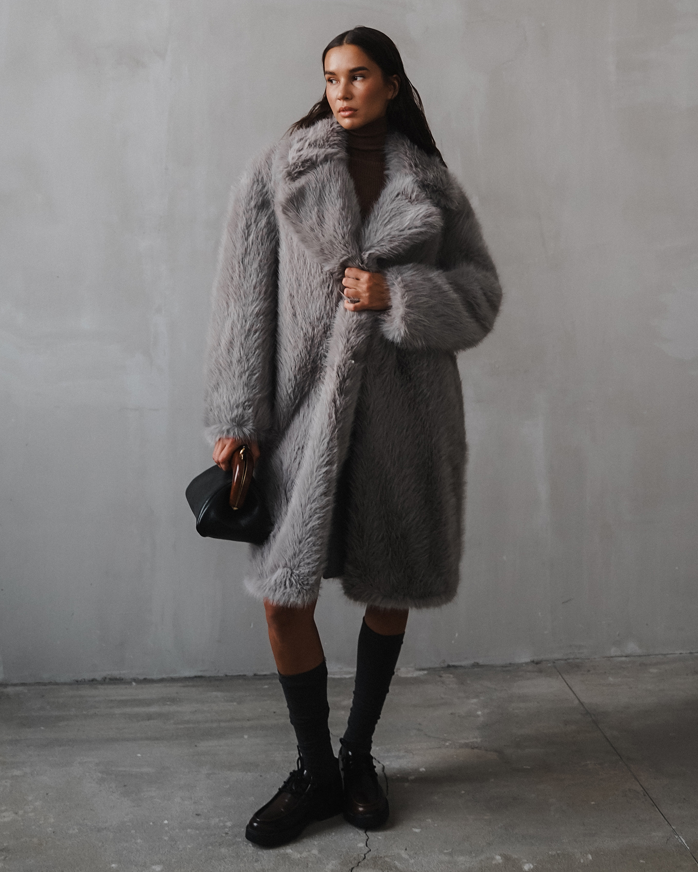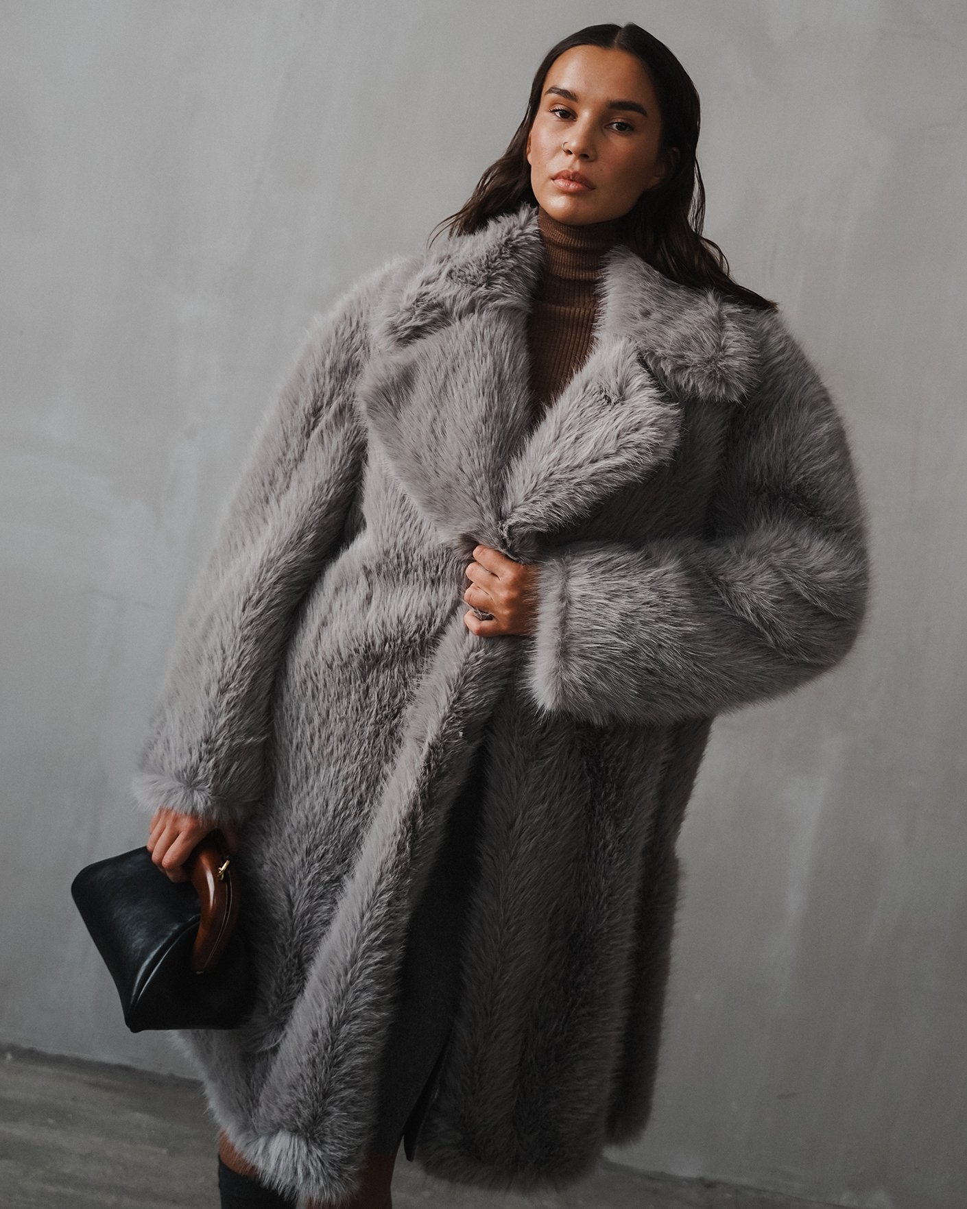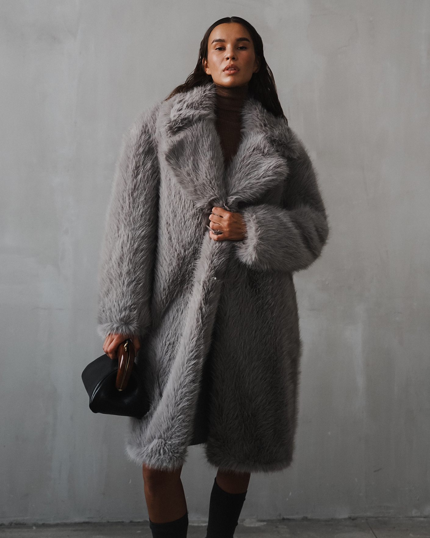 Пальто Sportmax серого цвета из ткани, имитирующей искусственный мех. Модель на запахе с отложным воротником и лацканами, скрытая застежка. Стильное пальто станет акцентной вещью на каждый день.