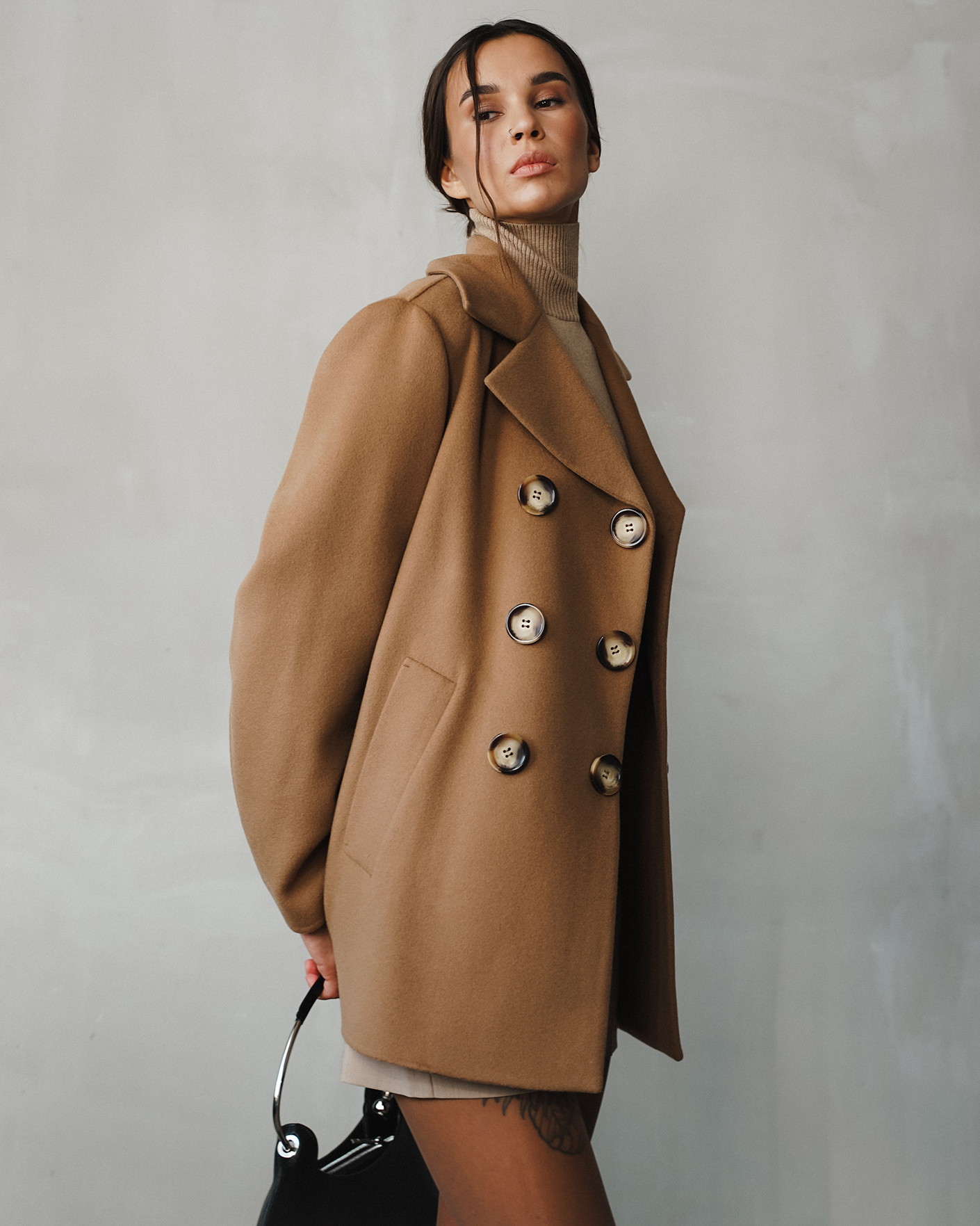 Двубортное полупальто Sportmax бежевого цвета. Модель А-силуэта, широкий отложной воротник с лацканами, застежка на крупные шесть кнопок в виде пуговиц, врезные карманы по бокам. Полупальто - стиль на каждый день.
