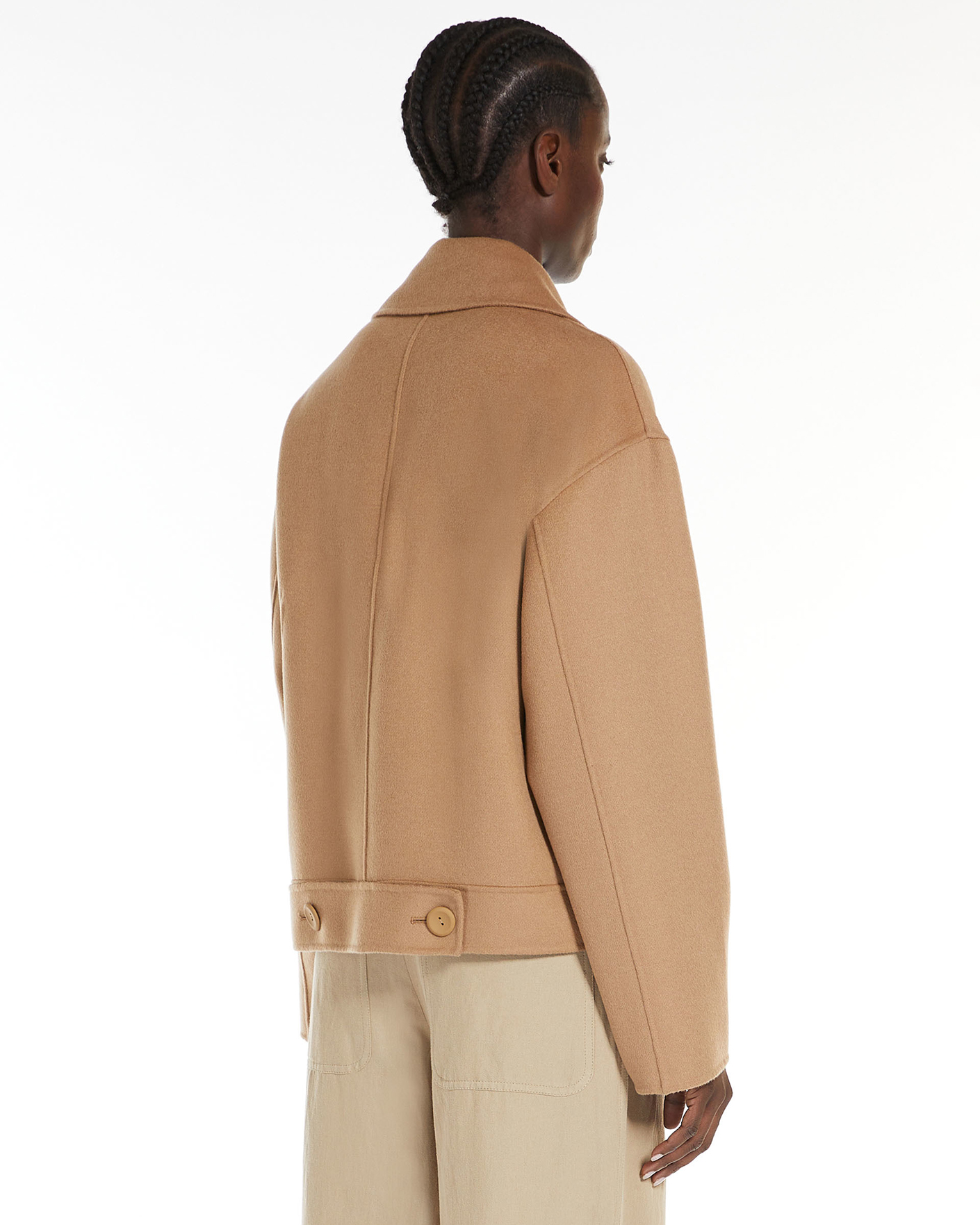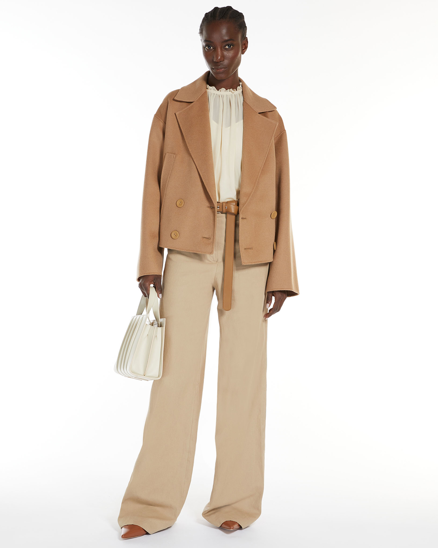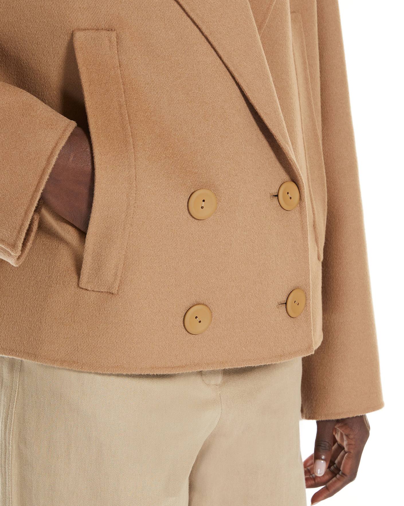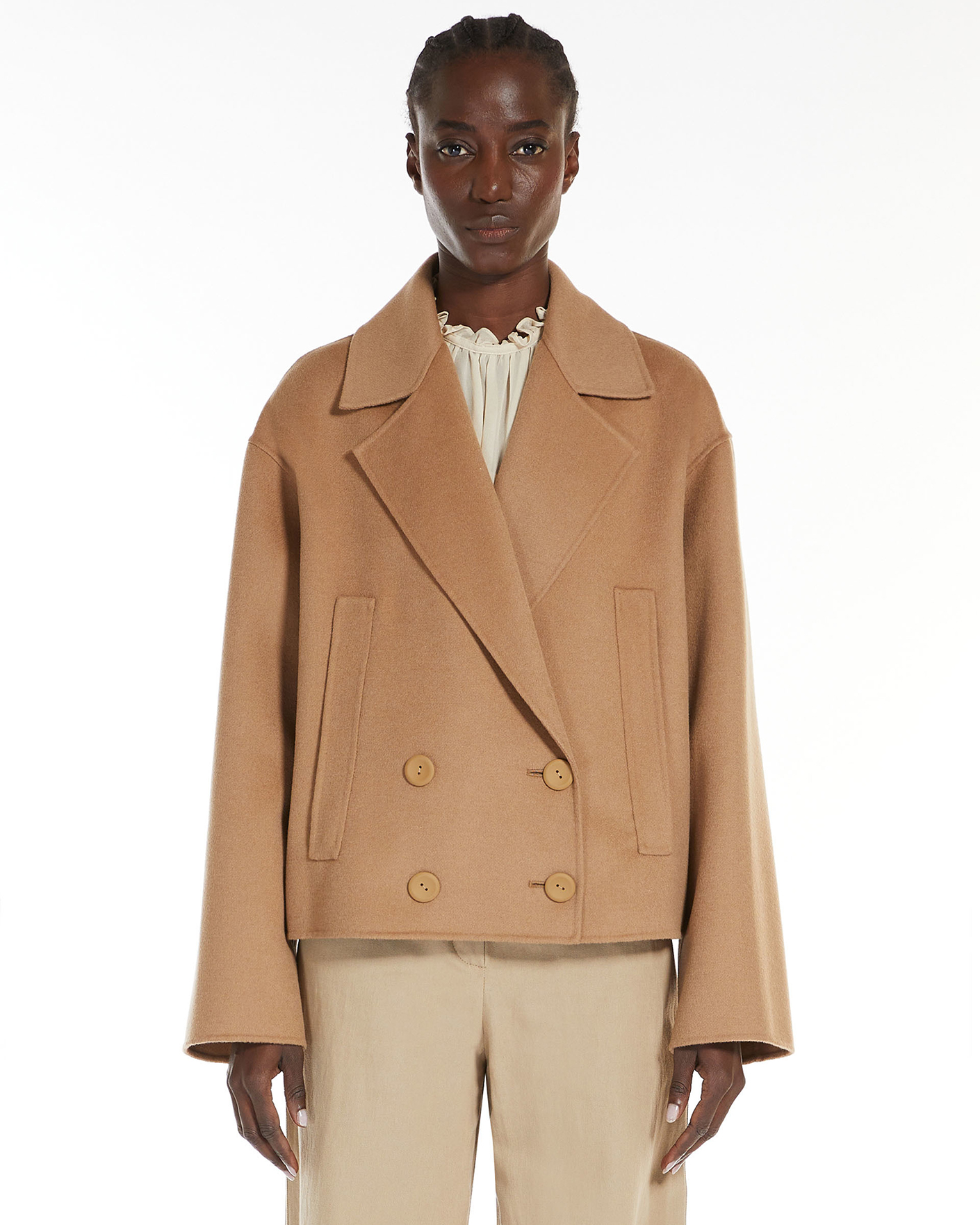 Двубортное полупальто Max Mara Studio бежевого цвета. Укороченная модель выполнена из высококачественно шерсти с добавлением шелка и кашемира. Отложной ворот с широкими лацканками, застежка на пуговицы в тон, имеются врезные карманы по бокам. Полупальто станет идеальным спутником в прохладный день.