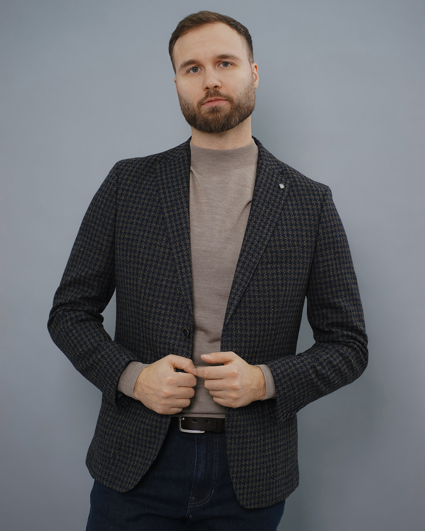Пиджак Digel зелено-синего цвета в рисунок гусиные лапки. Шерстяная модель с лацканами, застежкой на пуговицы и накладными карманами по бокам. Пиджак можно сочетать с рубашкой, тонкой водолазкой, джемпером и брюками.