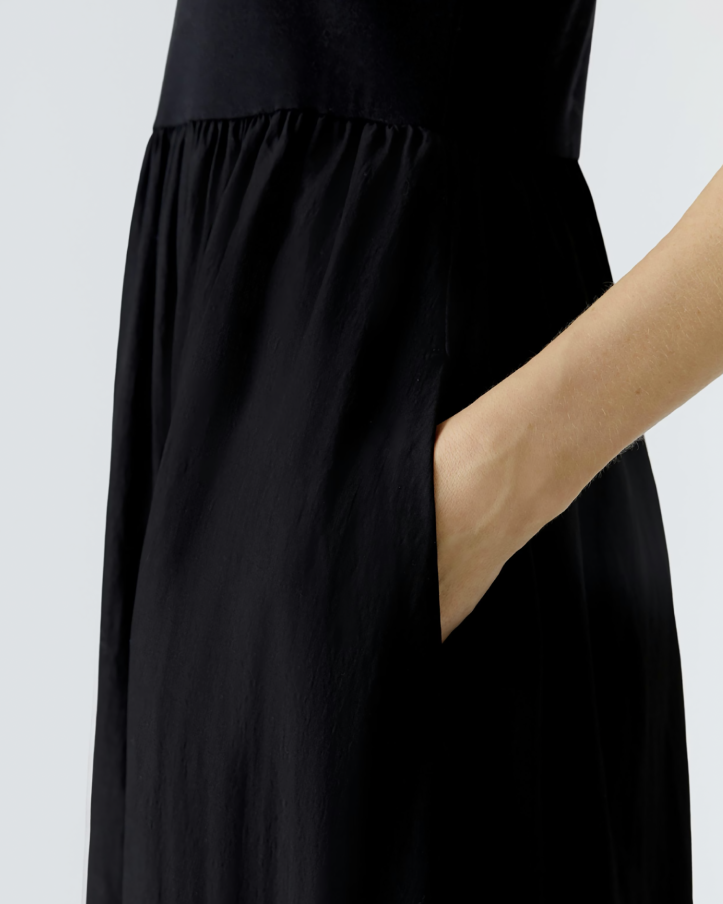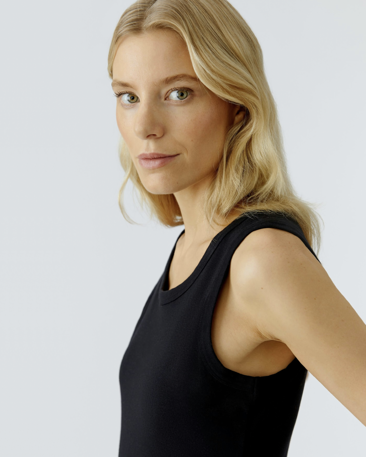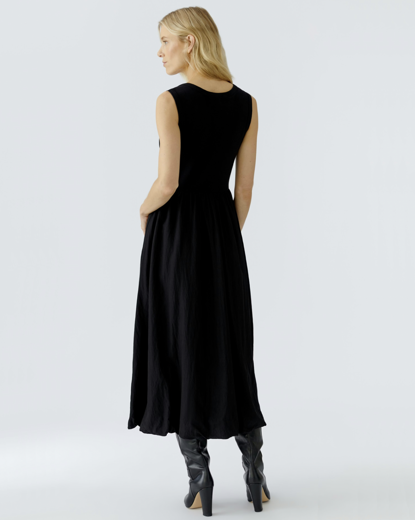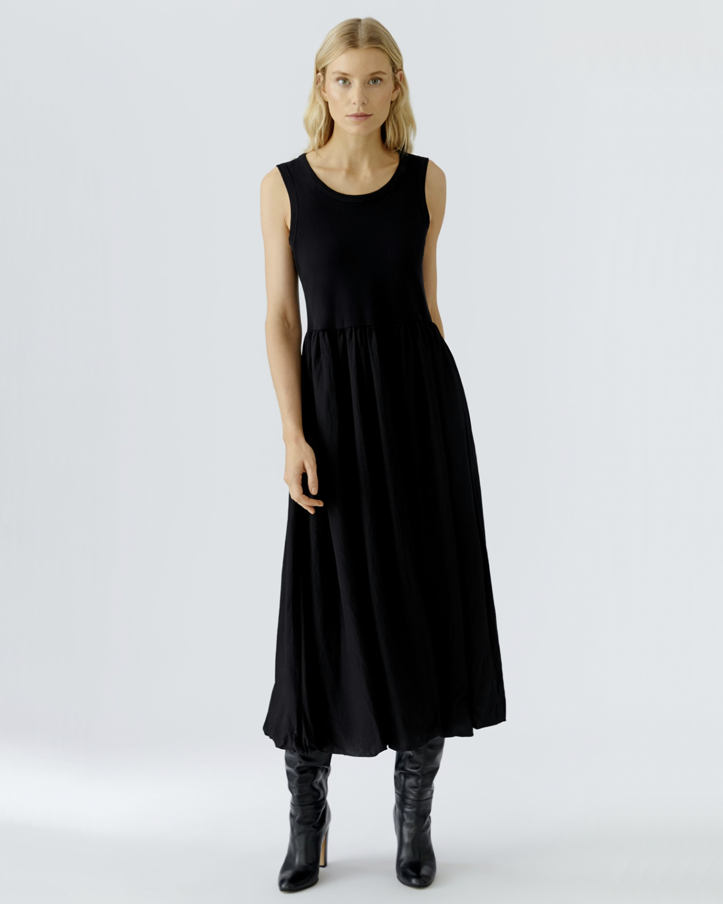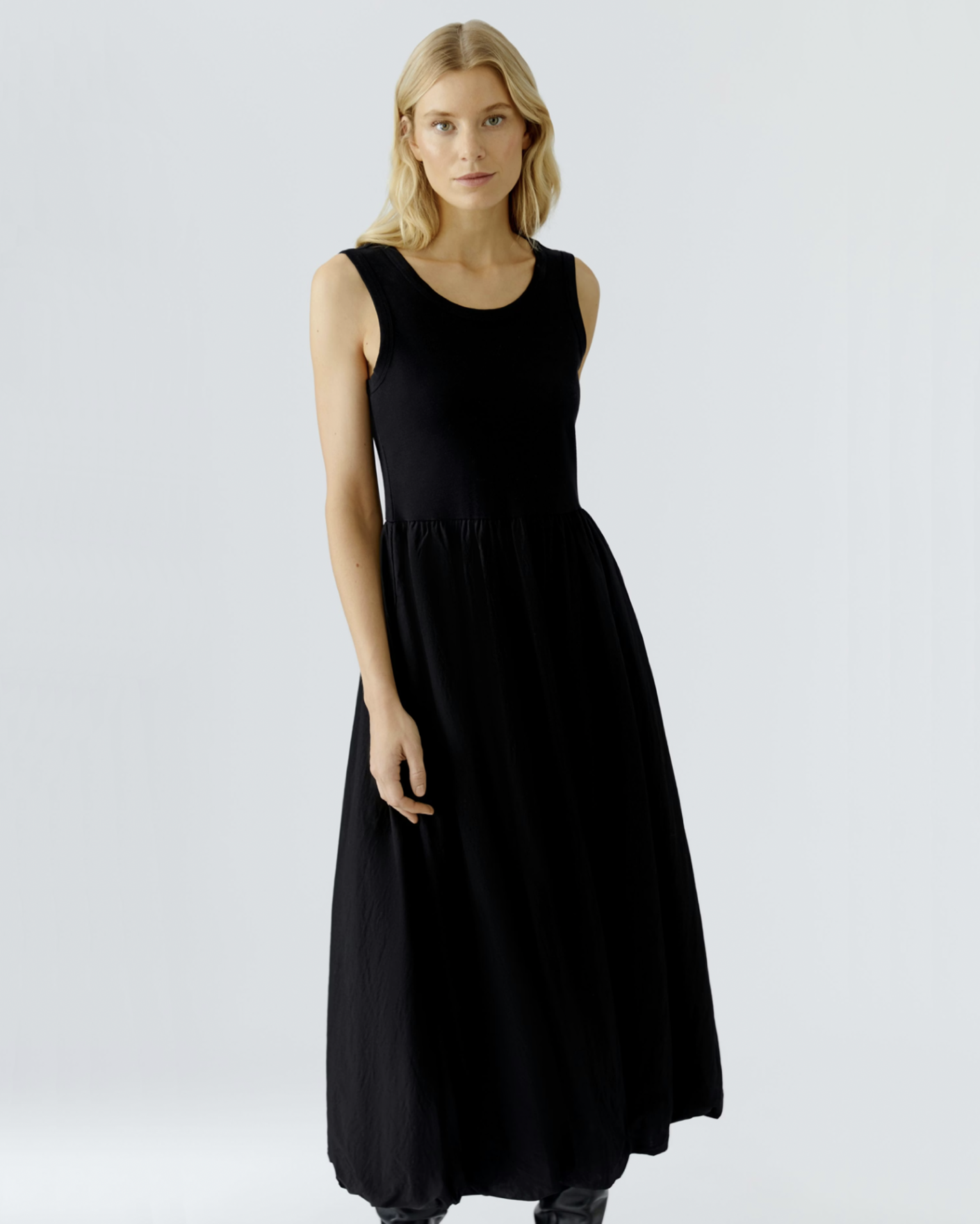 Платье-майка OUI черного цвета. Хлопковая модель с круглым вырезом, широкие лямки, без рукавов, аккуратная сборка вокруг линии талии и с расклешенной юбкой, длина миди. Платье-майка отлично сочетается с жакетом, пуловером, кардиганом, джемпером.