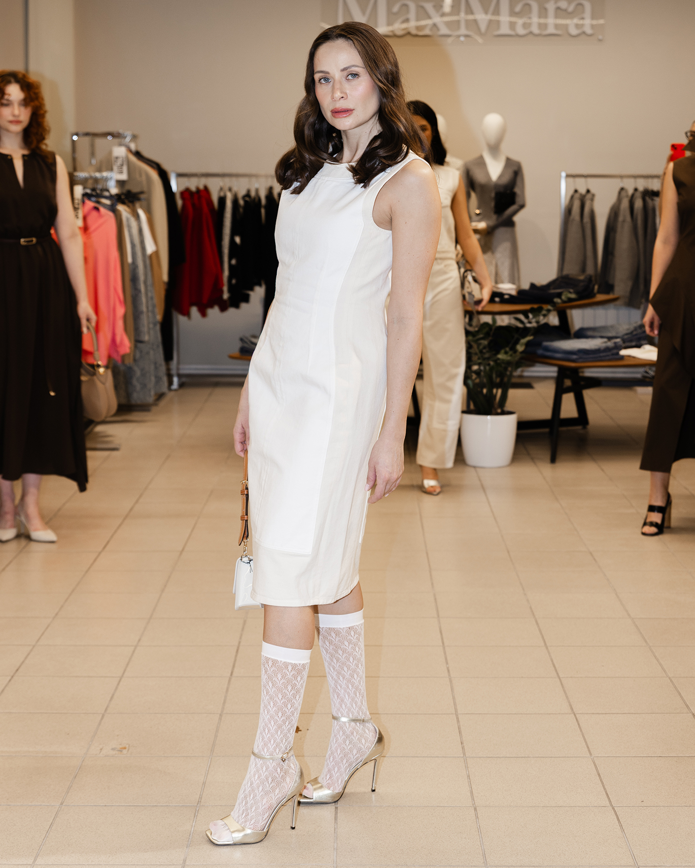 Платье-футляр Sportmax бело-бежевого цвета. Модель из 100% хлопка, круглый вырез, без рукавов, застежка на молнию по спинке. Стильное платье-футляр станет незаменимой вещью на каждый день.