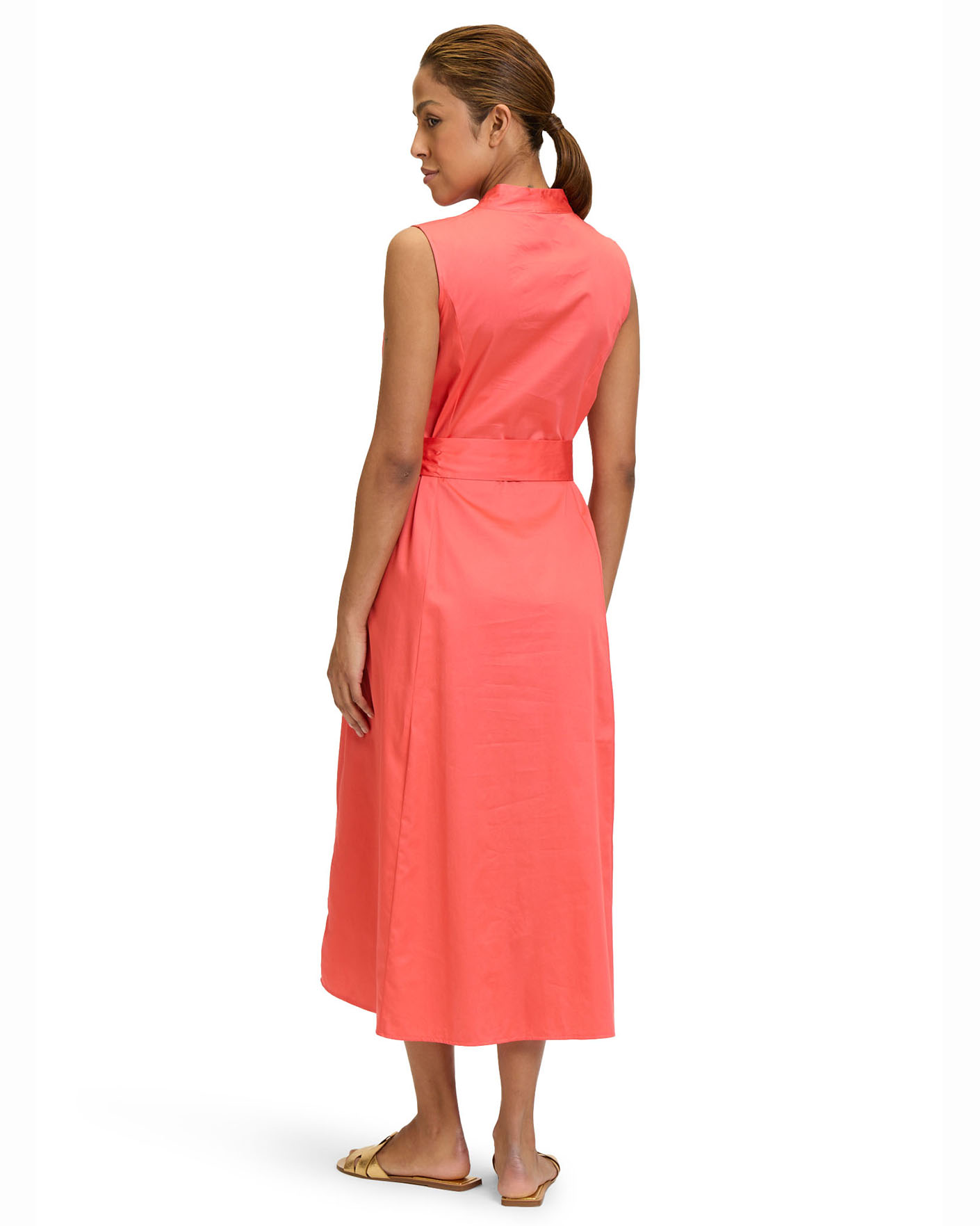 Летнее платье-рубашка Betty Barclay кораллового цвета. Модель из 100% хлопка без рукавов, воротник-стойка, застежка на пуговицы по всей длине, врезные карманы по бокам, а также пояс в тон. Платье-рубашка - идеальный вариант для жаркого лета.