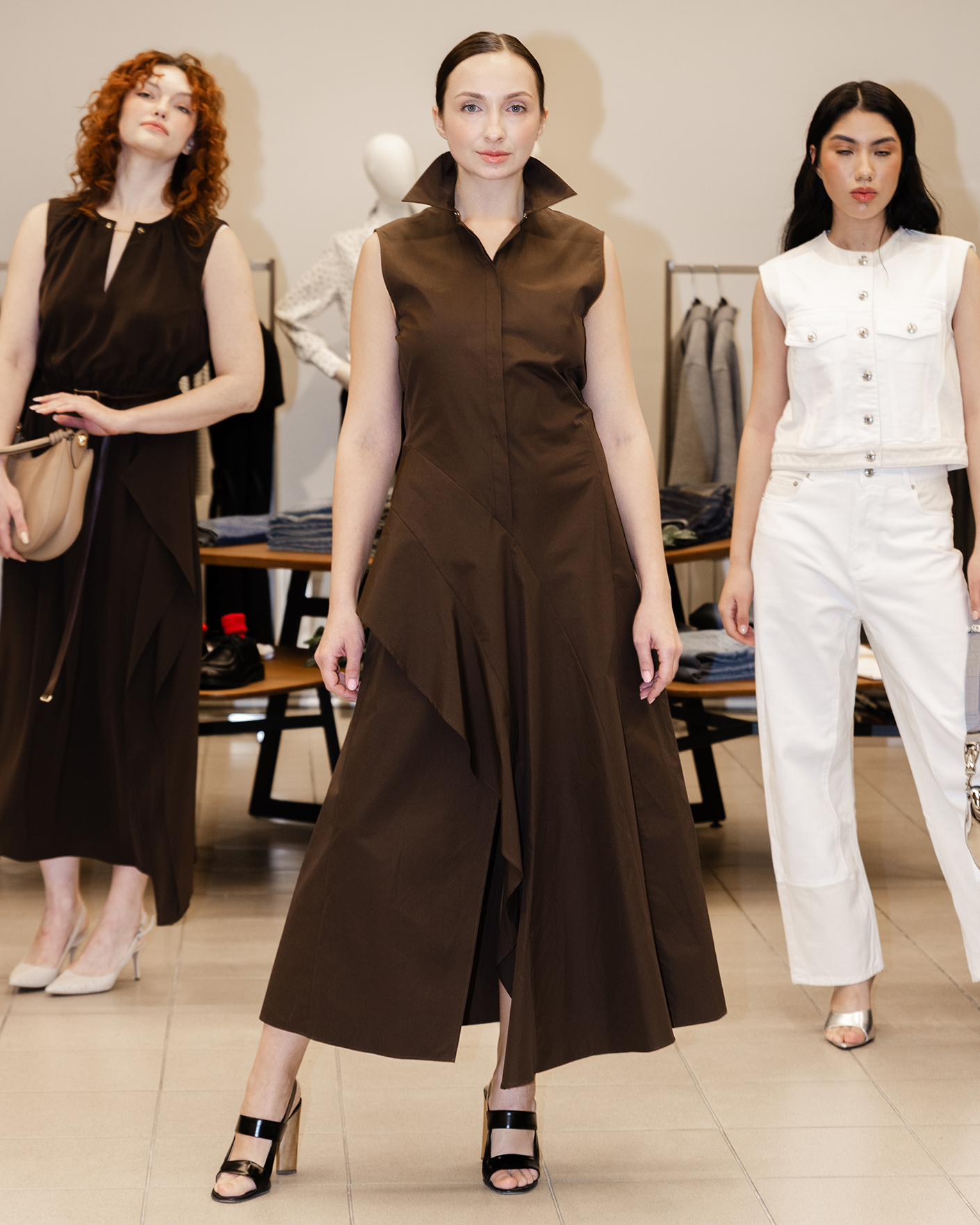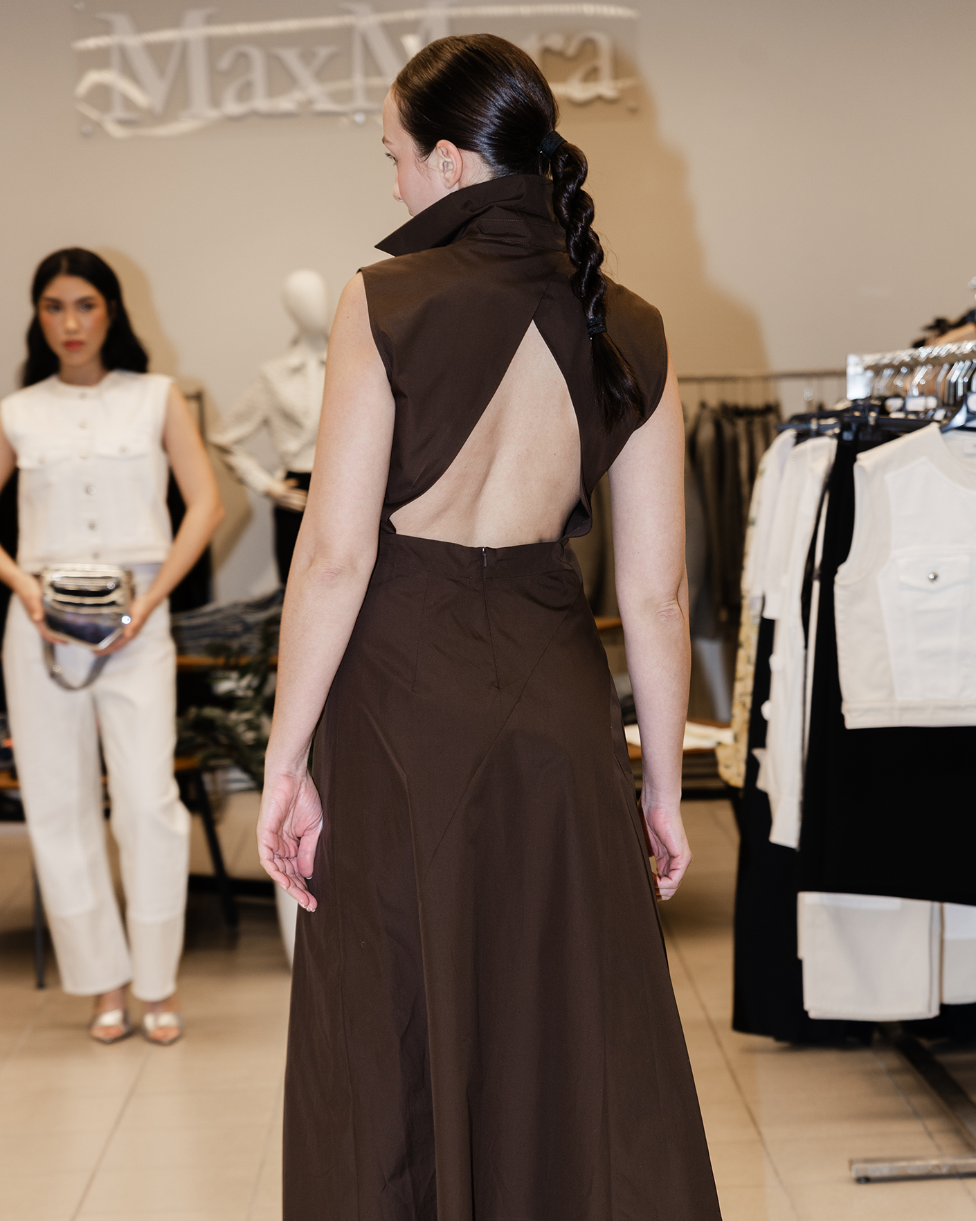 Приталенное платье-рубашка Max Mara Studio темно-коричневого цвета из 100% хлопка. Модель без рукавов, отложной воротник, застежка на скрытые пуговицы до талии, элегантный вырез по спинке, а также расклешенная юбка с ассиметричным изогнутым швом с оборками и разрезом по подолу спереди. Платье-рубашка станет фаворитом вашего гардероба.