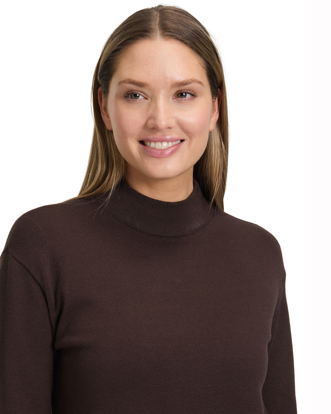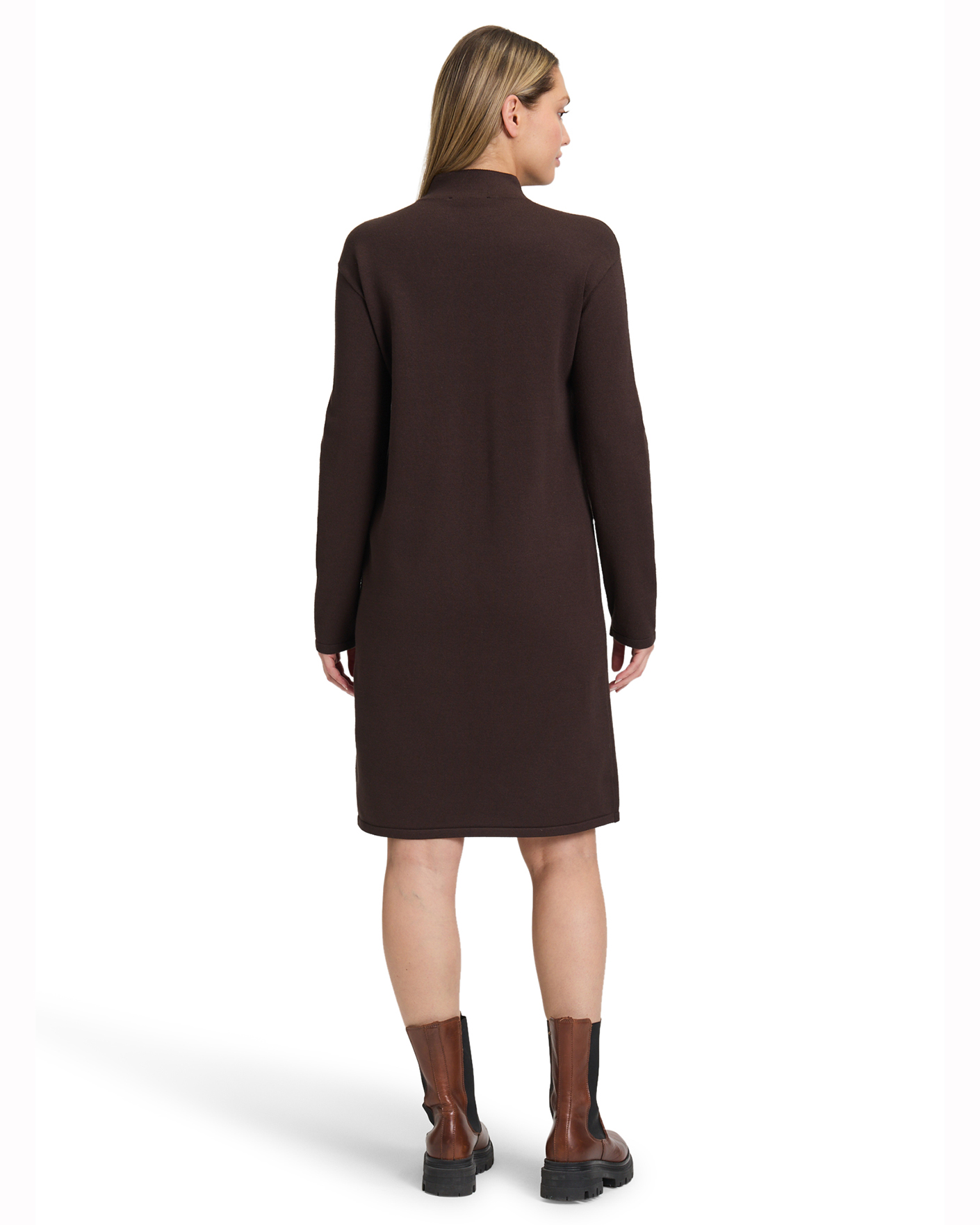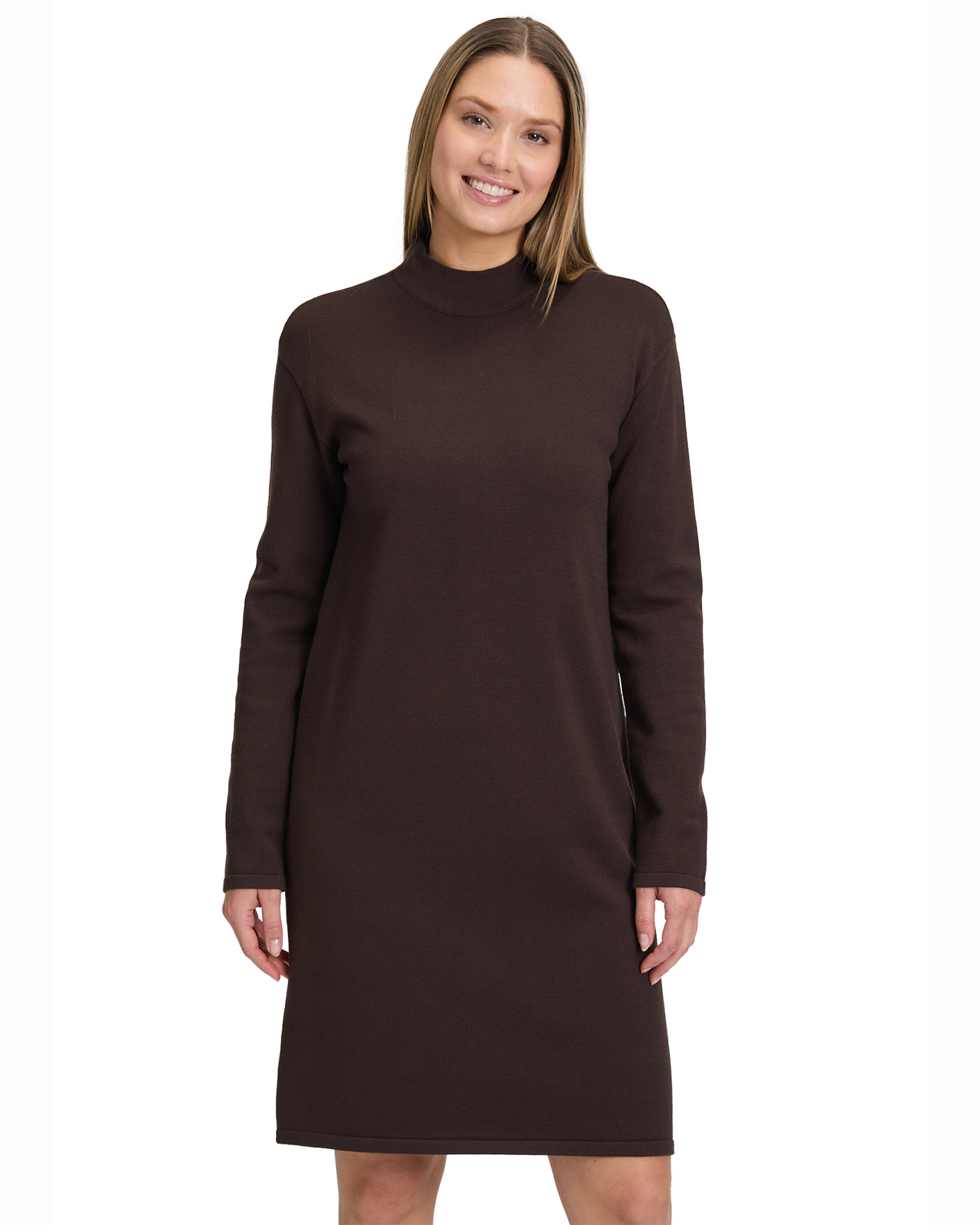 Платье-свитер Betty Barclay коричневого цвета в строчный рисунок. Модель с воротником-стойка, длинные рукава. Платье - база на каждый день.