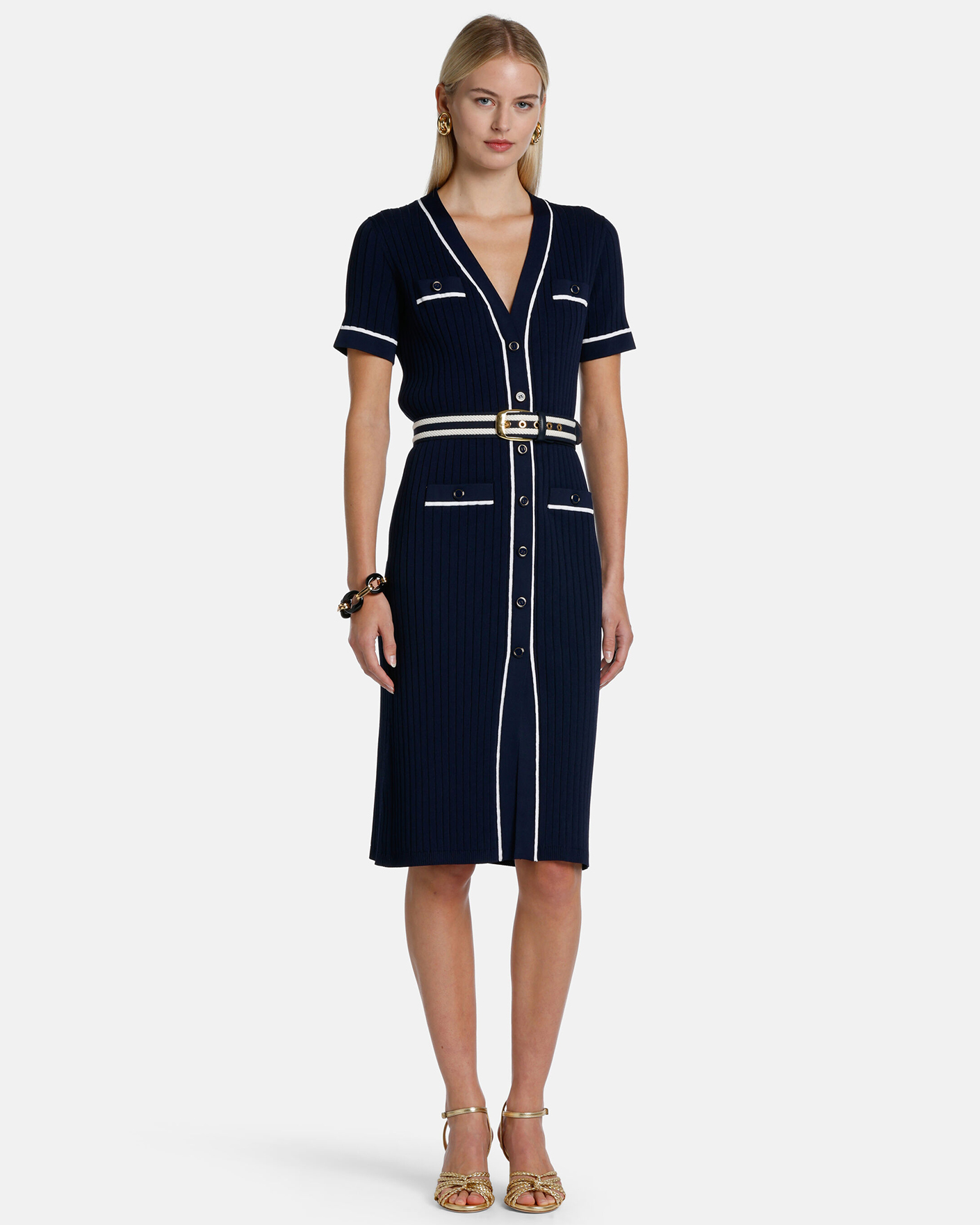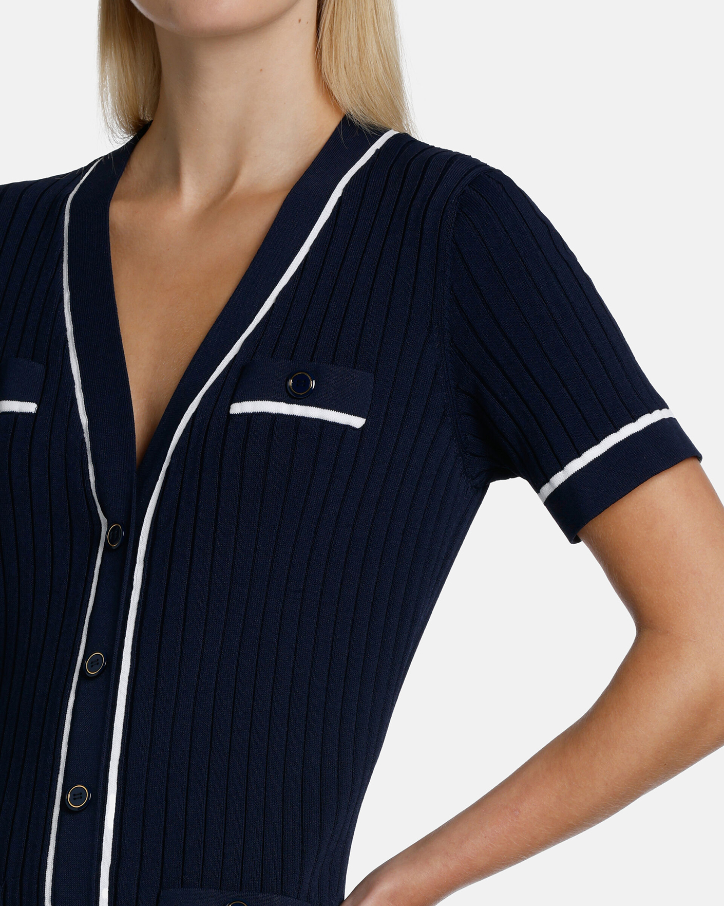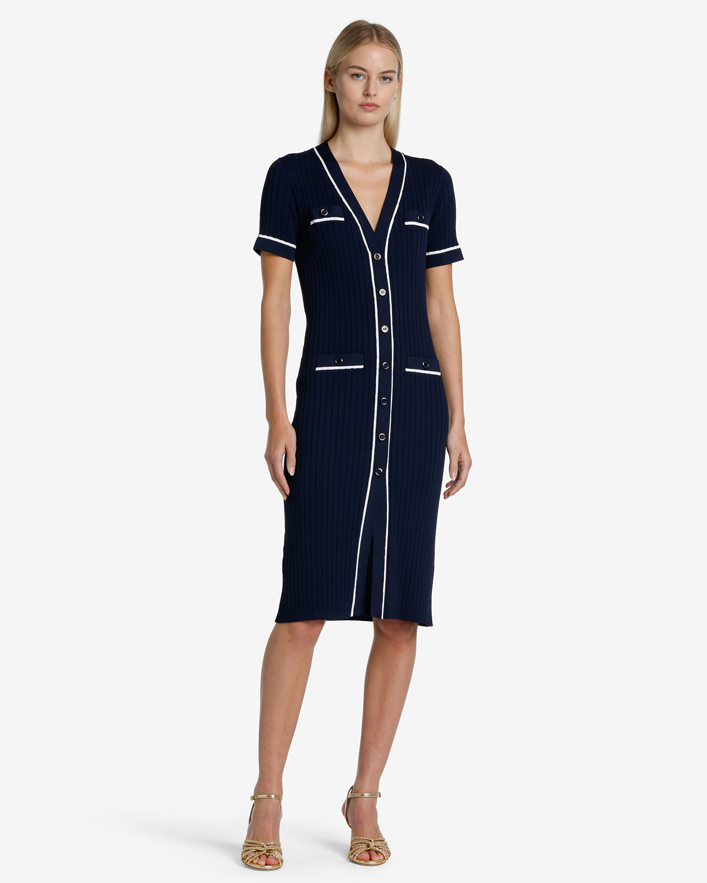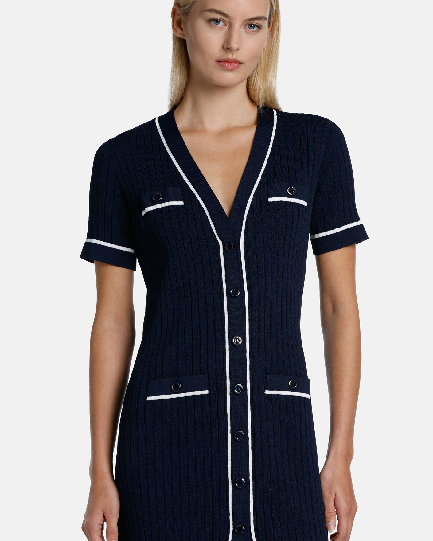 Приталенное платье-футляр Luisa Spagnoli синего цвета в вязку лапша. Модель с V-образным вырезом, застежка на пуговицы, длина по колено, короткий рукав. Стильное платье-футляр отлично впишется в ваш гардероб.