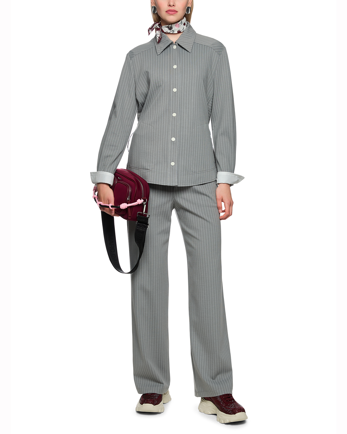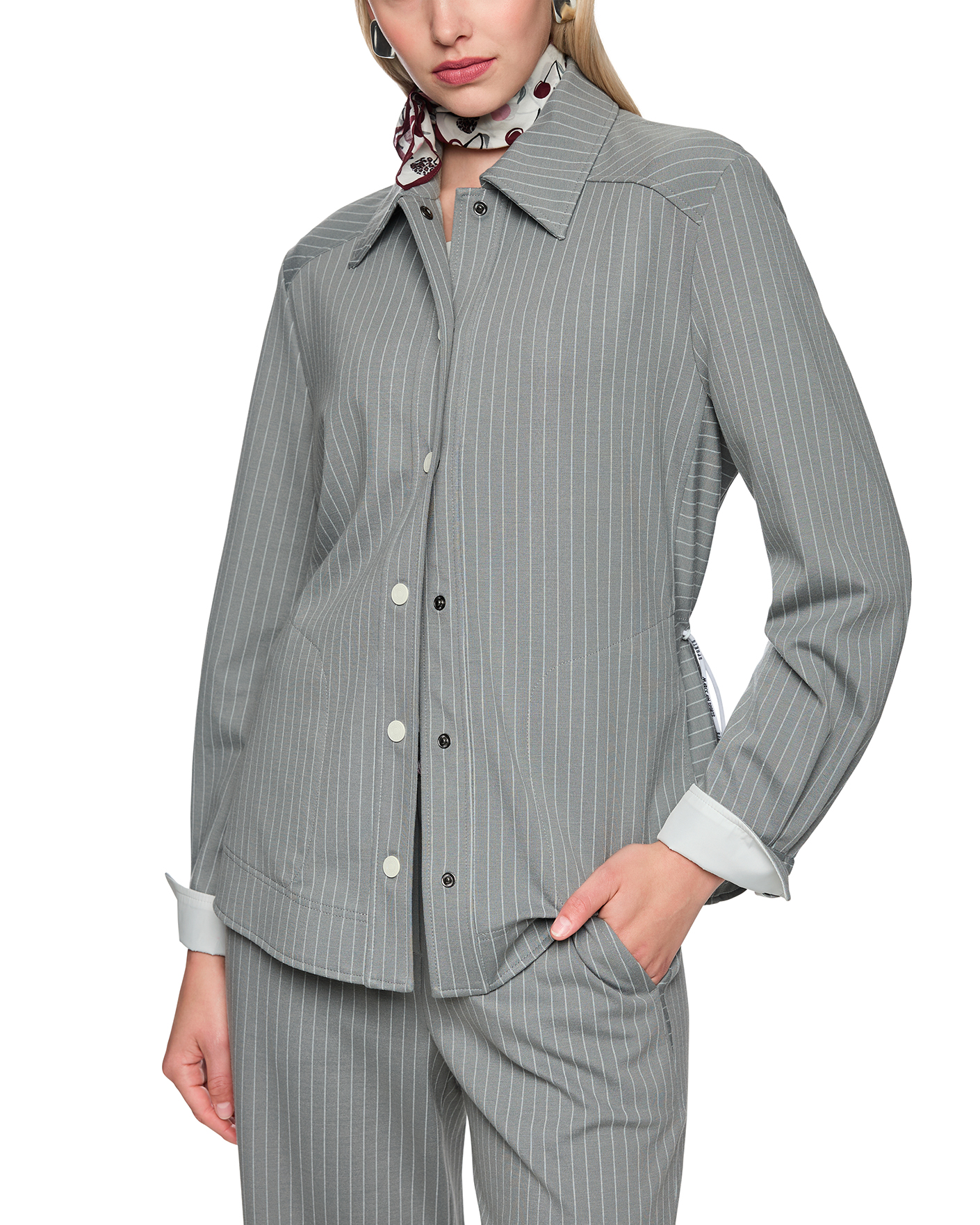 Рубашка Marc Cain Sport серого цвета в узкую вертикальную полосу. Модель с отложным воротником, застежка на кнопки, ширина талии регулируется с помощью кулиски по бокам. Рубашка отлично впишется в ваш гардероб.