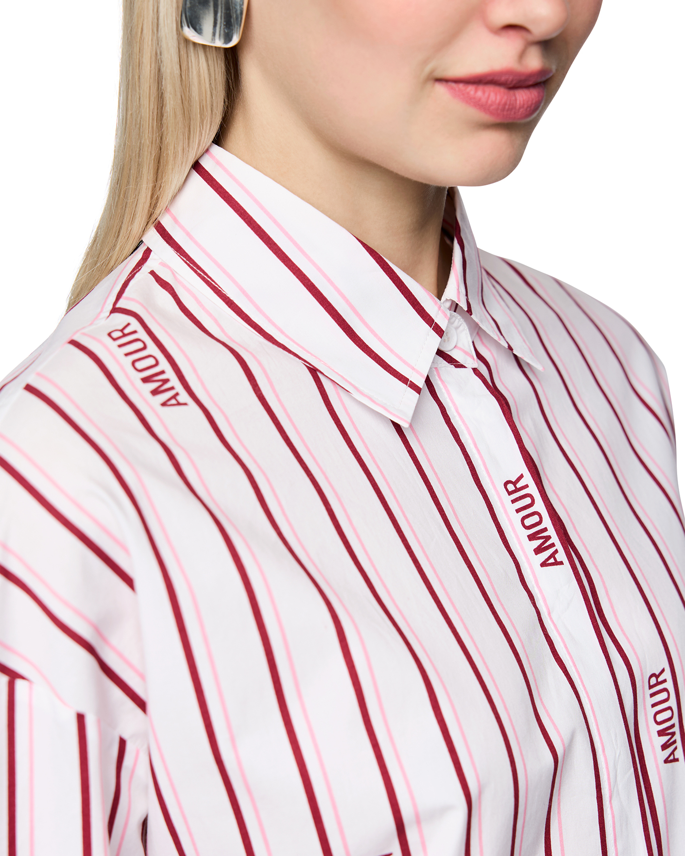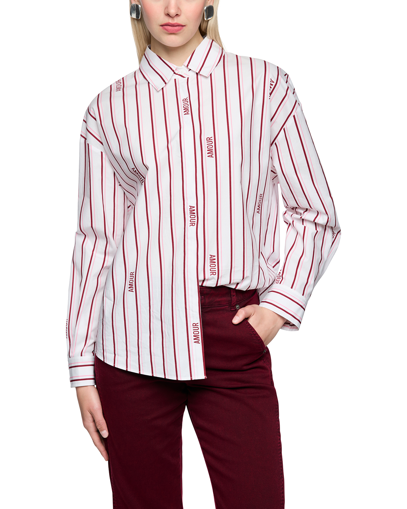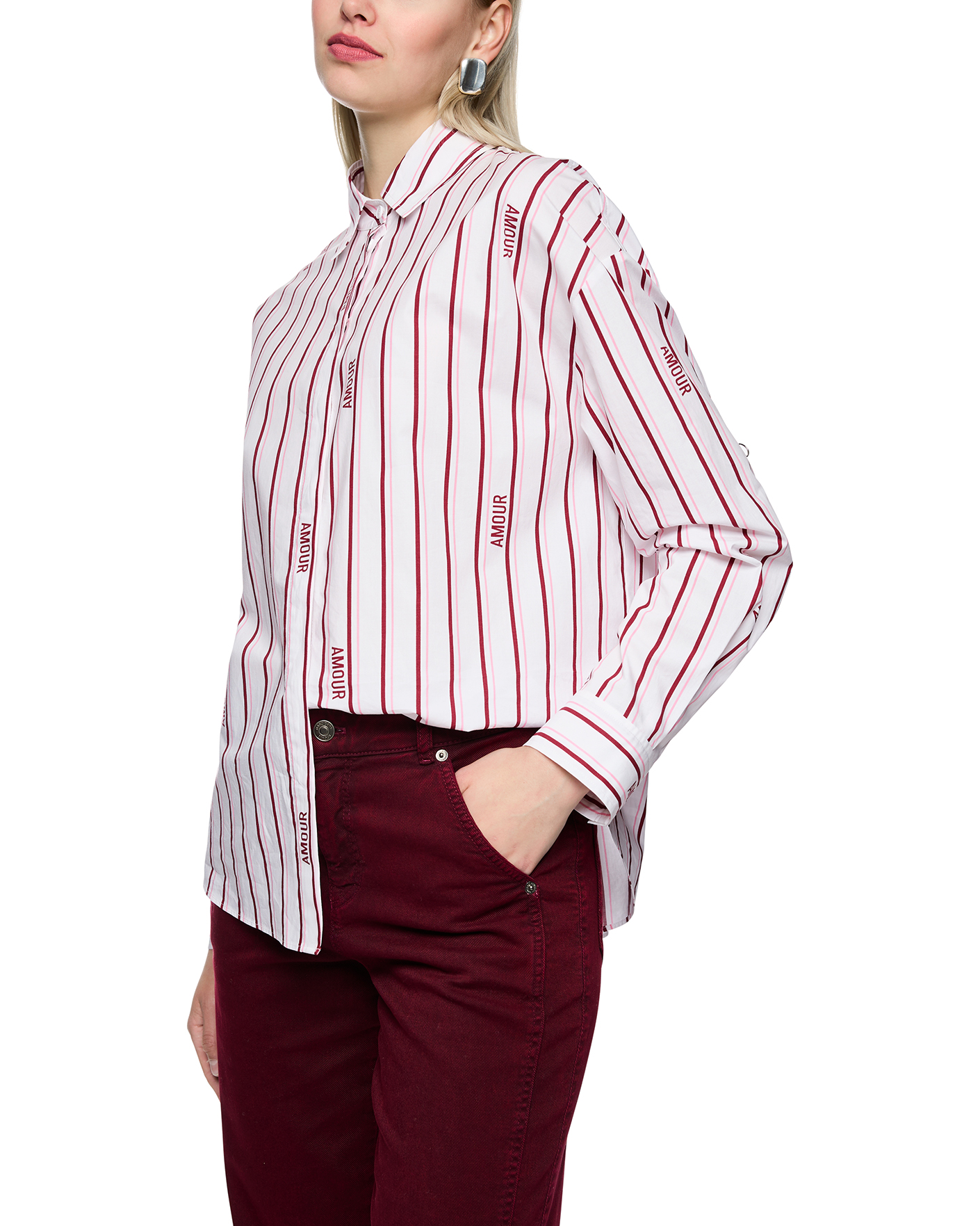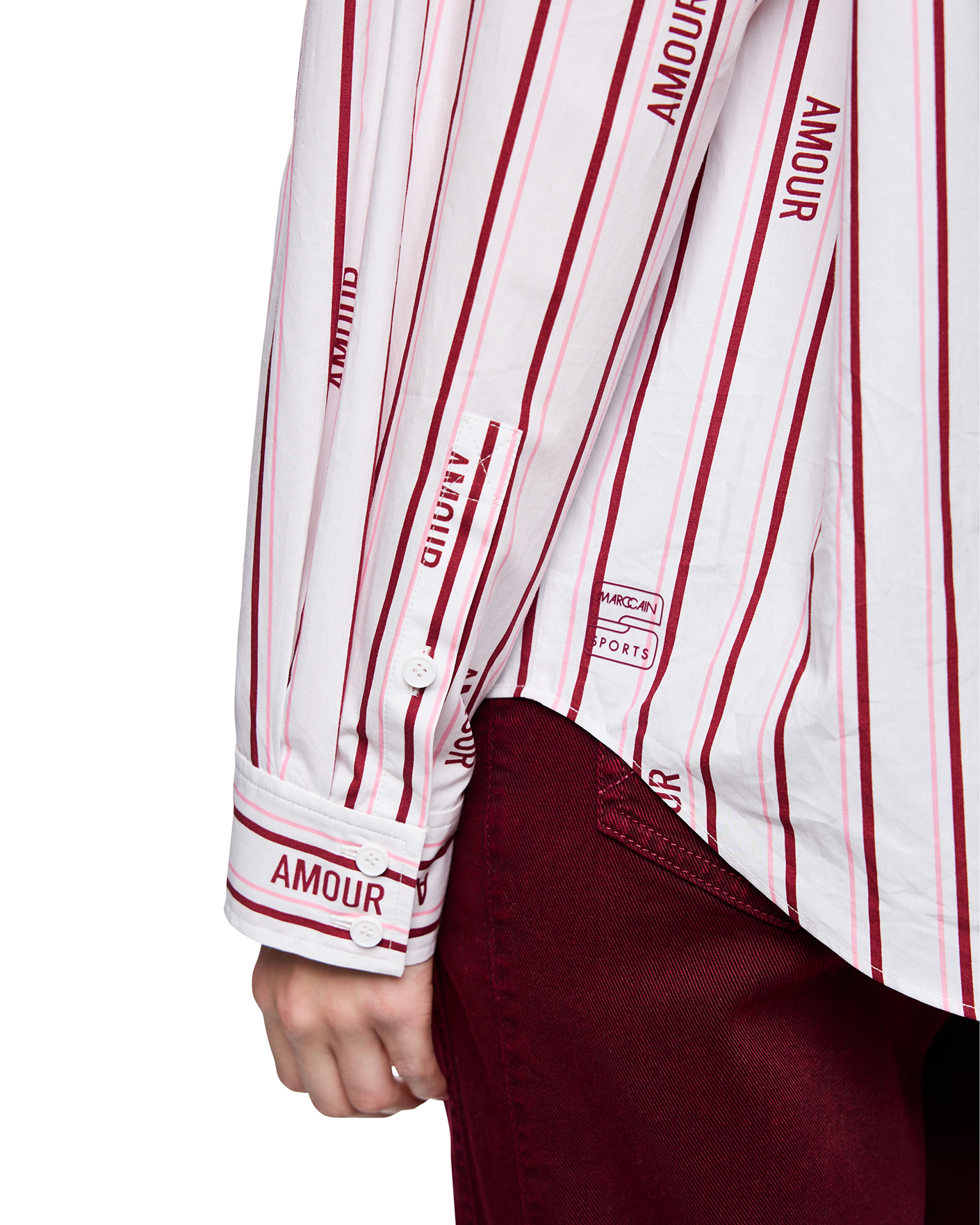 Свободная рубашка Marc Cain Sport вишнево-белого цвета в вертикальную полосу и слоган. Модель из 100% хлопка, отложной воротник, застежка на скрытые пуговицы. Рубашка отлично сочетается с жилетом, жакетом, джемпером, юбкой и брюками.