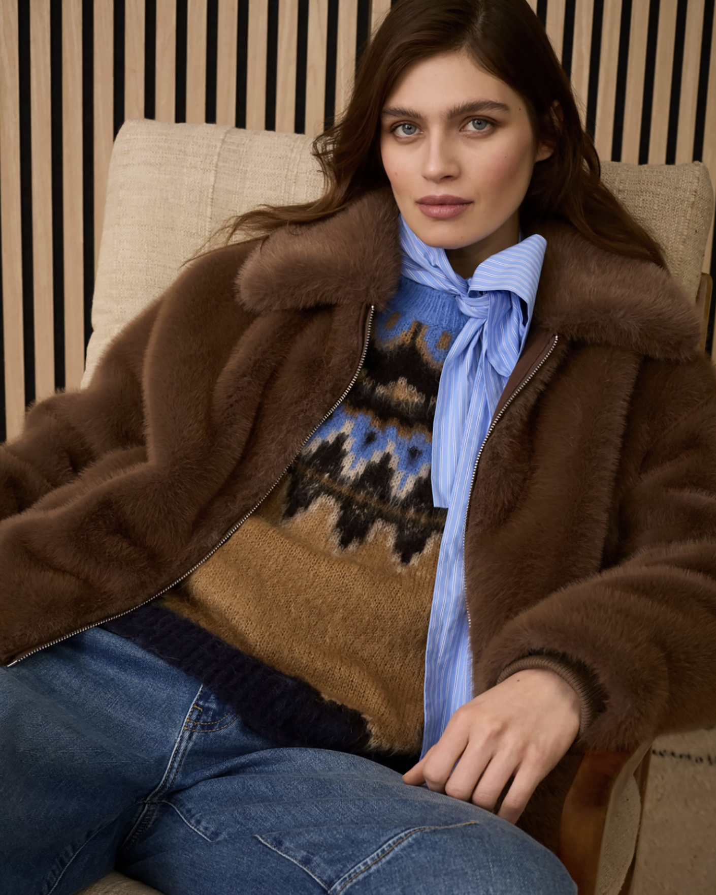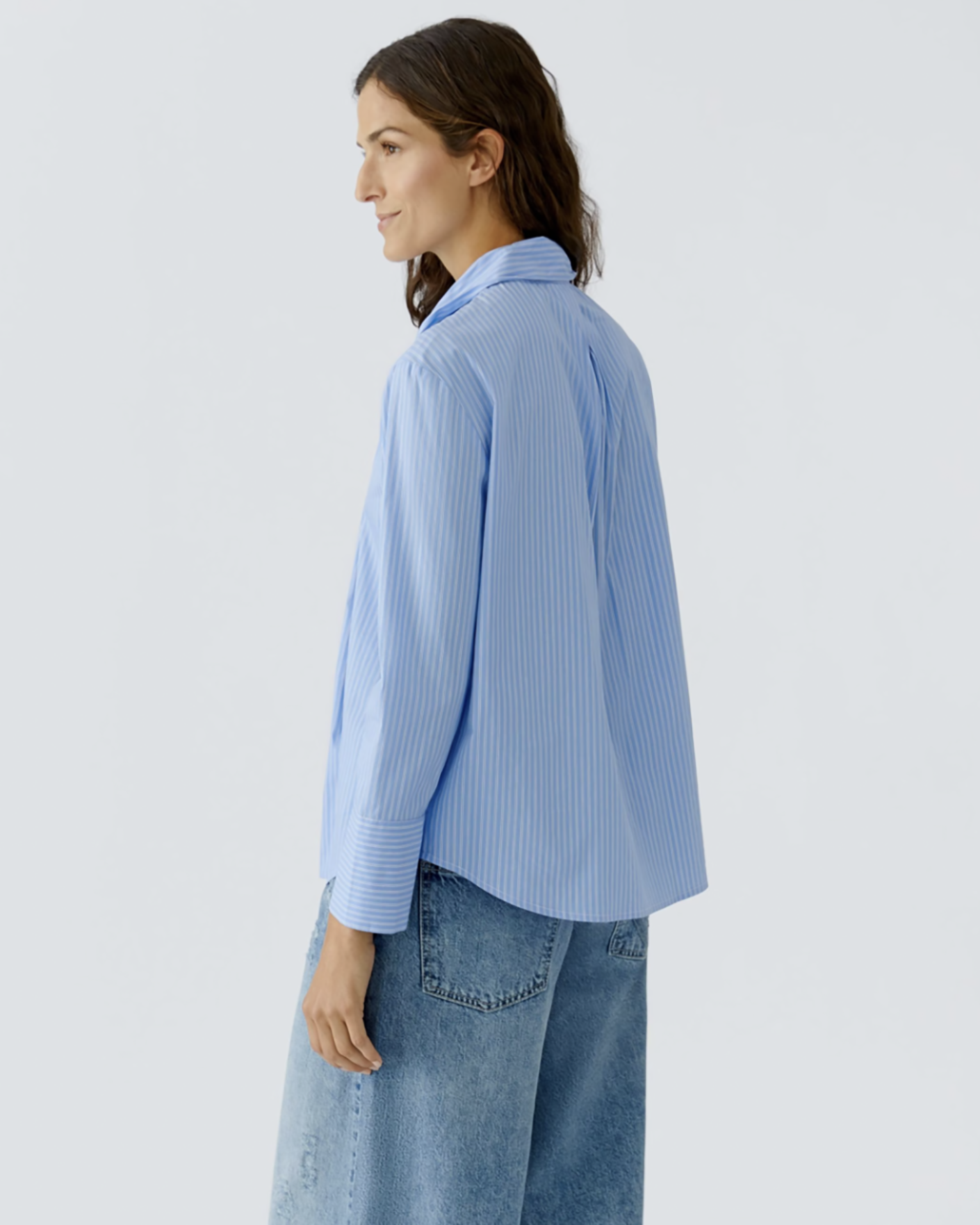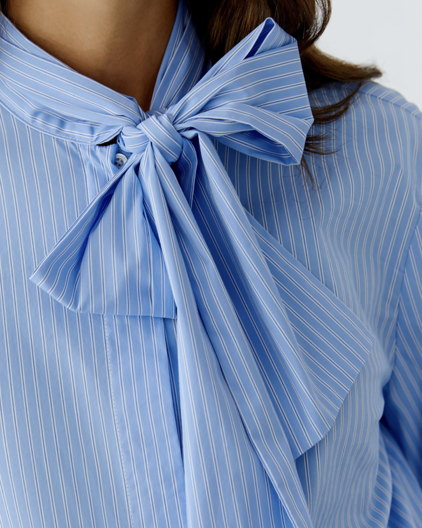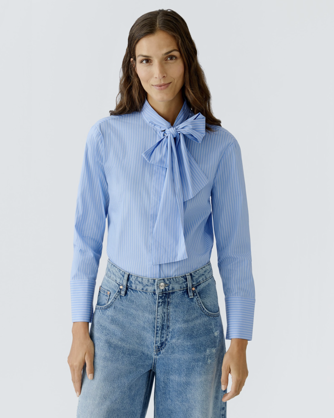 Свободная рубашка OUI бело-голубого цвета в вертикальную полосу. Модель с воротником-стойка с лентами, которые можно завязать в бант, застежка на скрытые пуговицы. Рубашка отлично сочетается с джемпером, жакетом, кардиганом, юбкой и брюками.