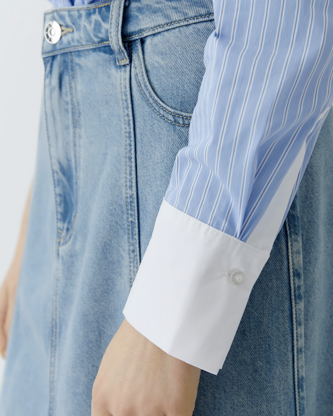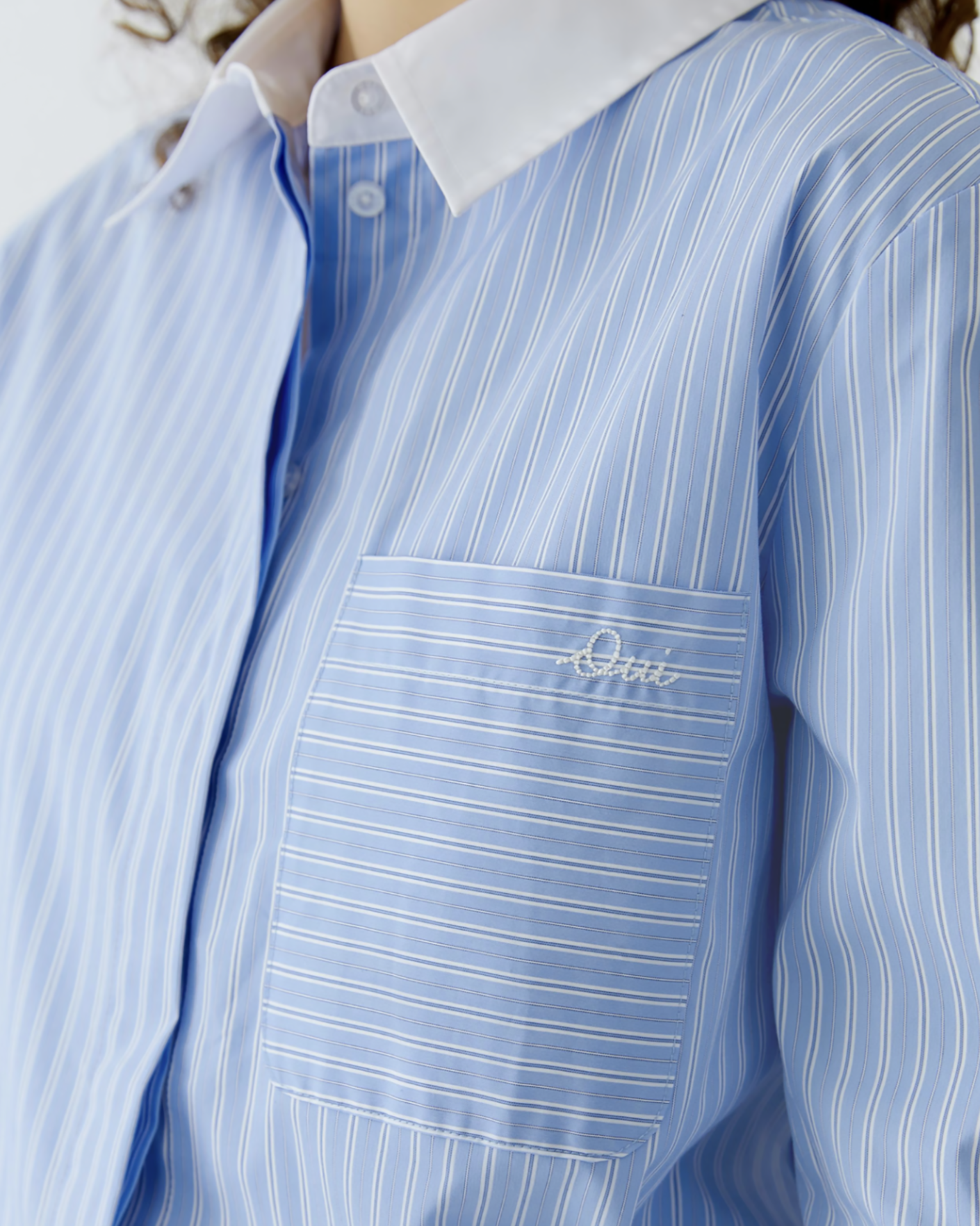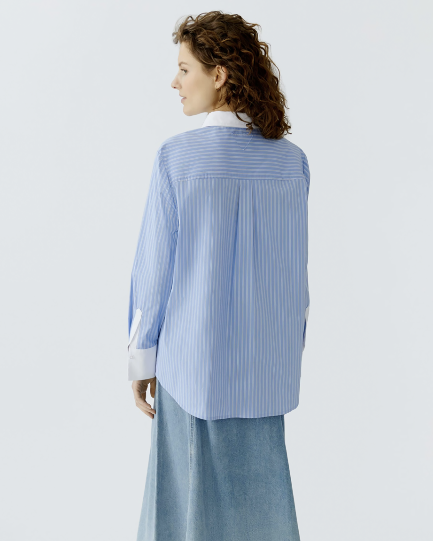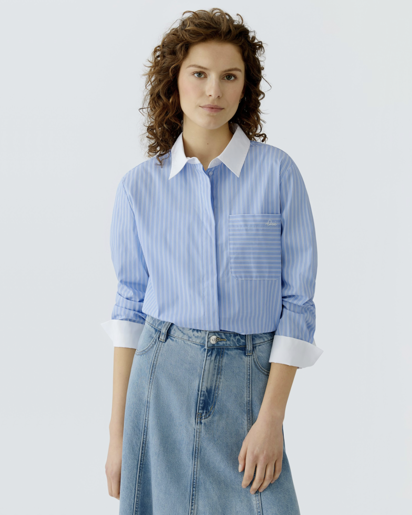 Свободная рубашка OUI голубого цвета в вертикальную узкую полосу. Хлопковая модель с контрастным отложным воротником и манжетами. Застежка на скрытые пуговицы, накладной нагрудный карман, небольшие закругленные разрезы по бокам. Рубашка - универсальная вещь на каждый день.