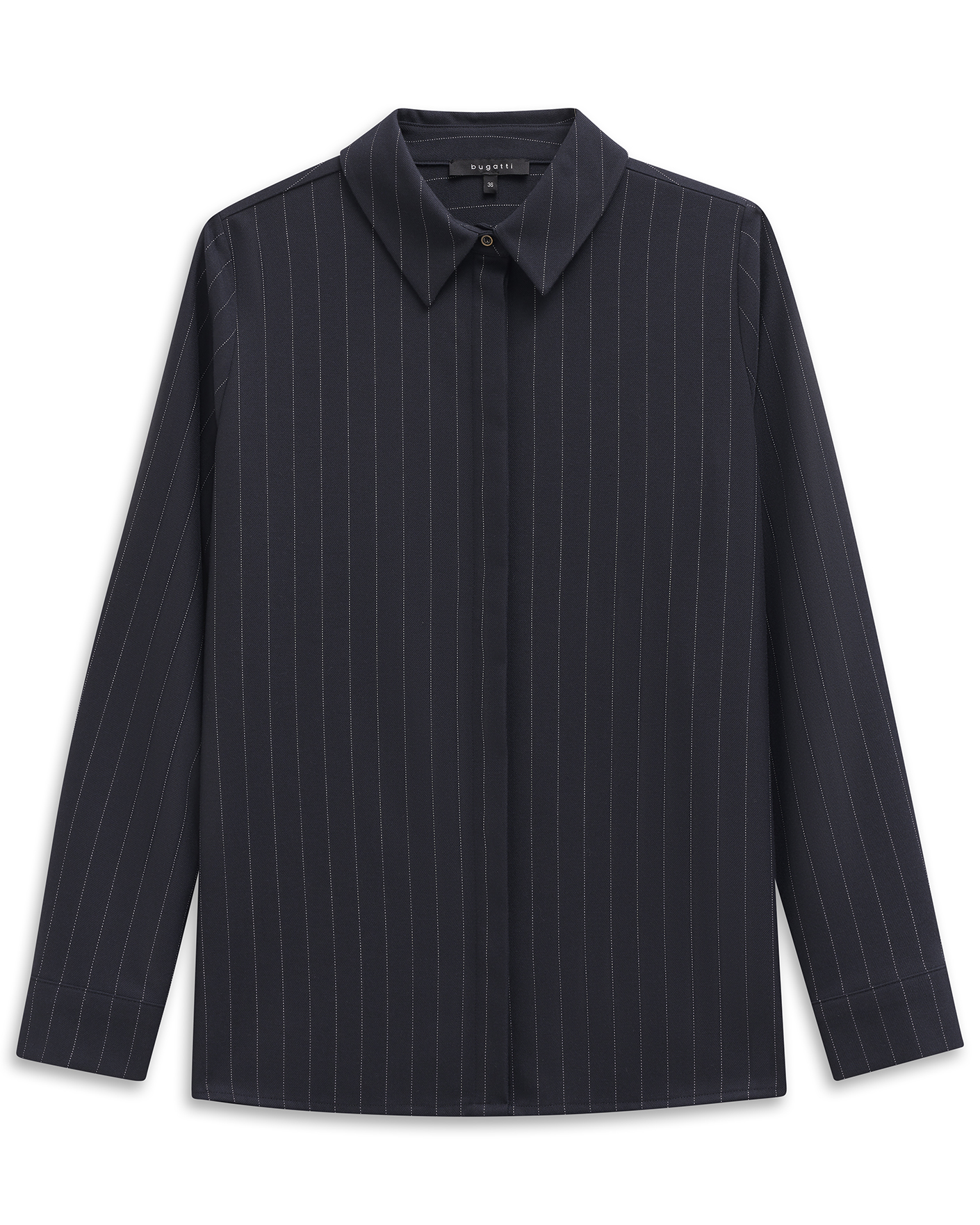 Рубашка Bugatti темно-синего цвета в узкую вертикальную полосу. Модель с отложным воротником, застежка на скрытые пуговицы, аккуратная складка по спинке, манжеты. Рубашка станет фаворитом повседневного гардероба.