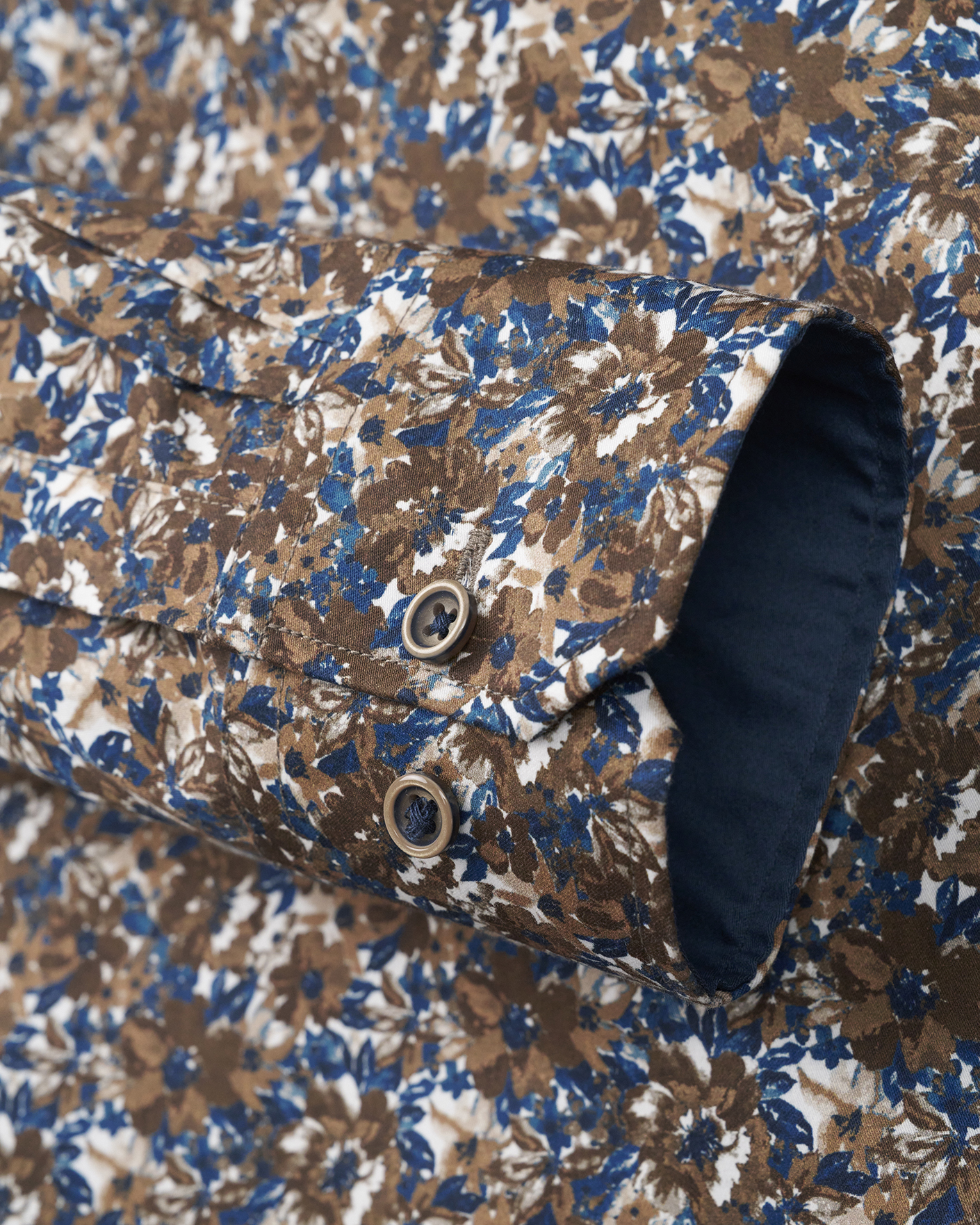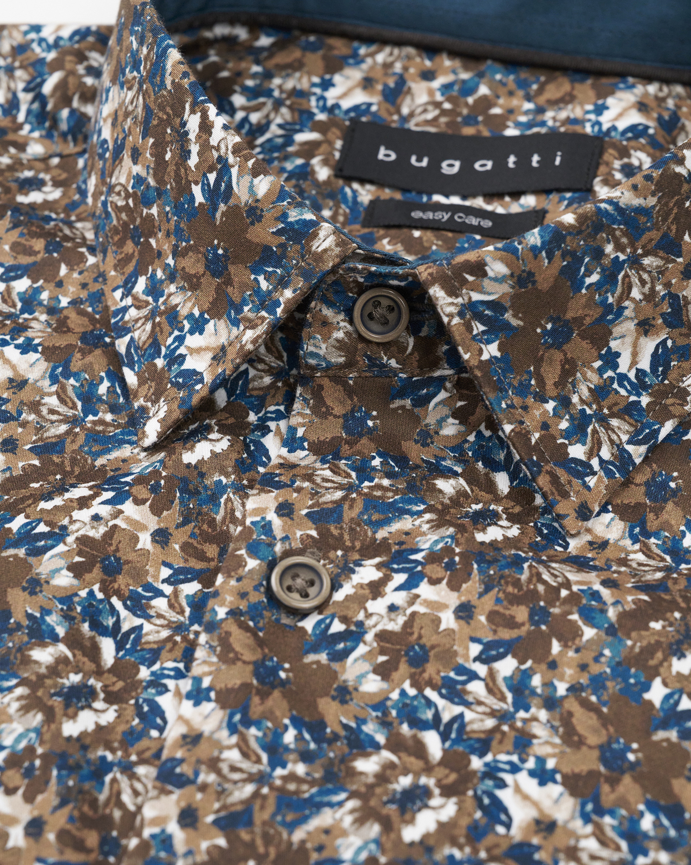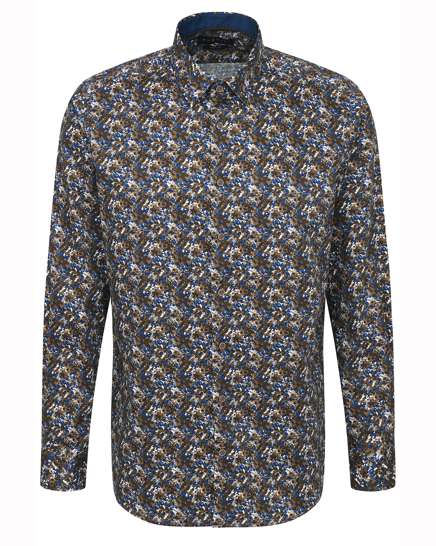 Рубашка Bugatti сине-коричневого цвета в цветочный рисунок. Модель из 100% хлопка с отложным воротником и застежкой на пуговицы в тон. Рубашка отлично сочетается с жилетом, пиджаком, кардиганом, джемпером.