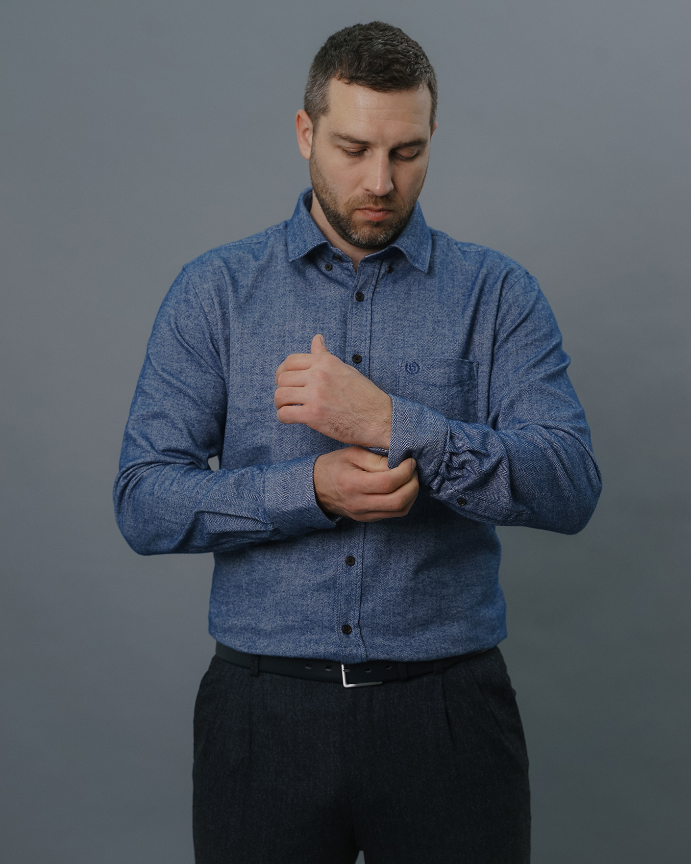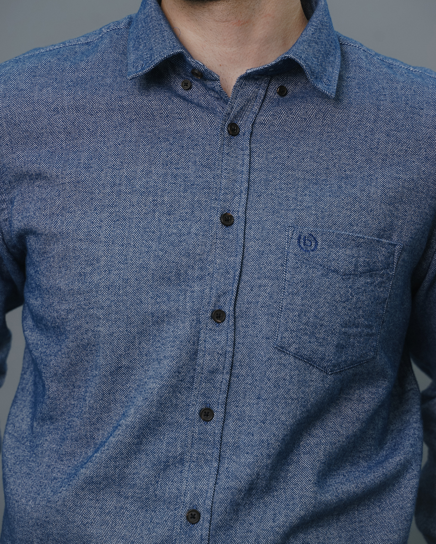 Рубашка Bugatti серо-синего цвета в мелкий рисунок-елочка. Модель из 100% хлопка, элегантный воротник, застежка на пуговицы, накладной карман на груди. Рубашка - идеальный вариант на каждый день.