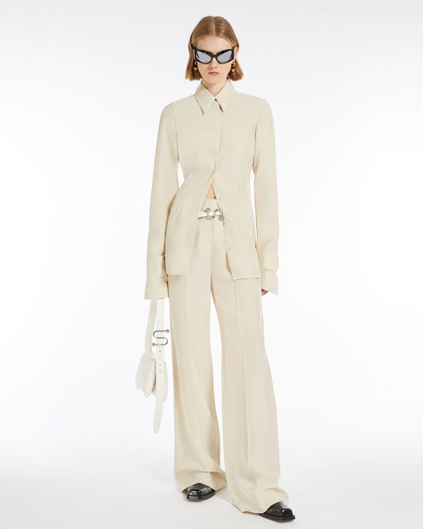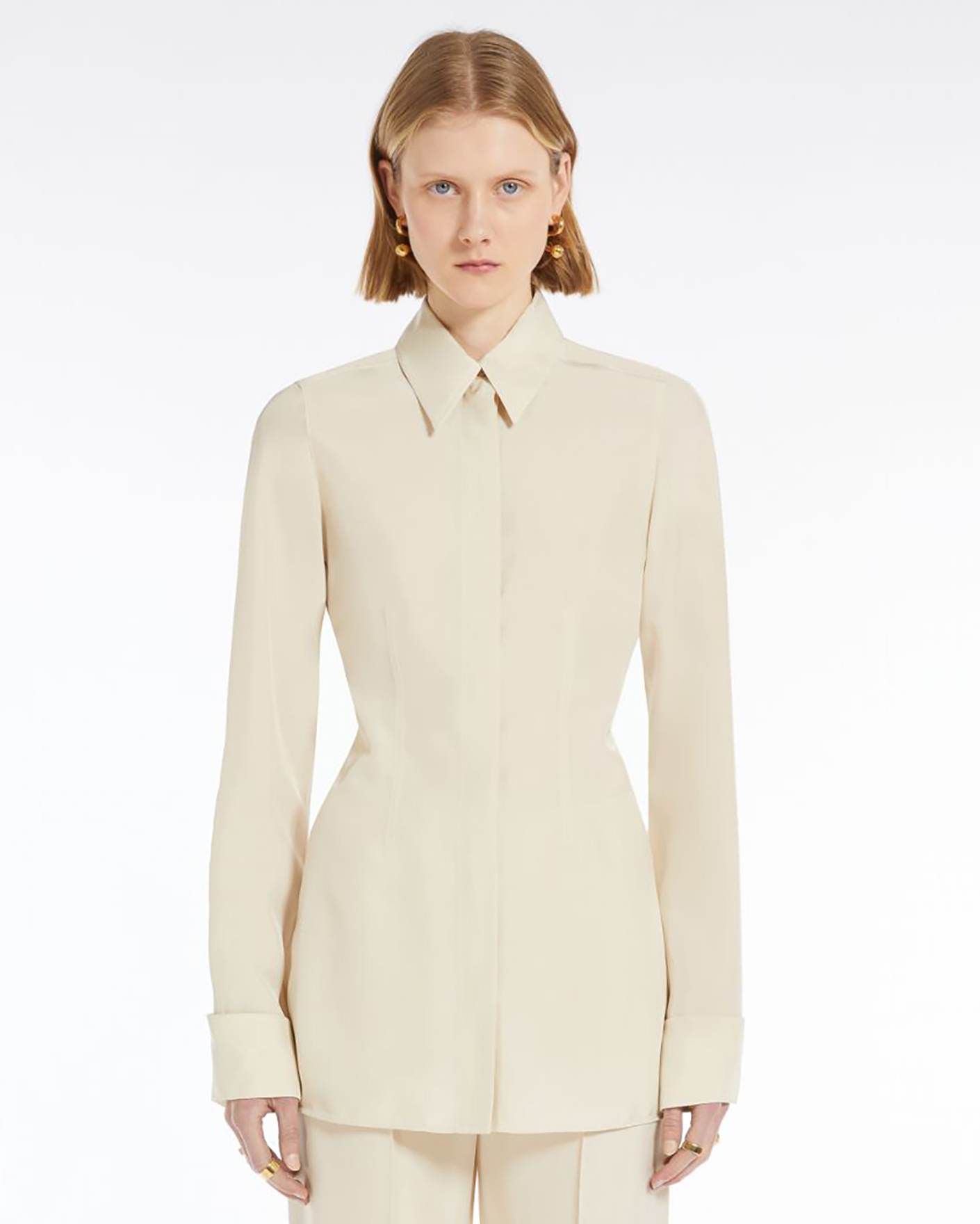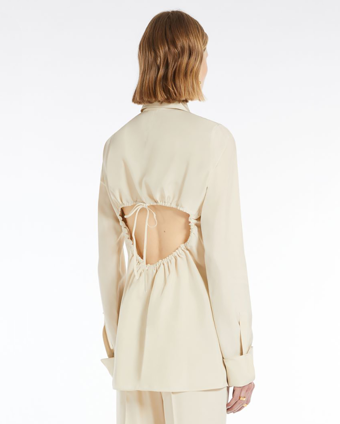 Приталенная рубашка Sportmax светло-бежевого цвета. Модель с отложным воротником, застежка на скрытые пуговицы, длинные рукава с манжетами. Изюминка - присборенный вырез, который оставляет часть спины открытой. Рубашка отлично впишется в ваш гардероб.