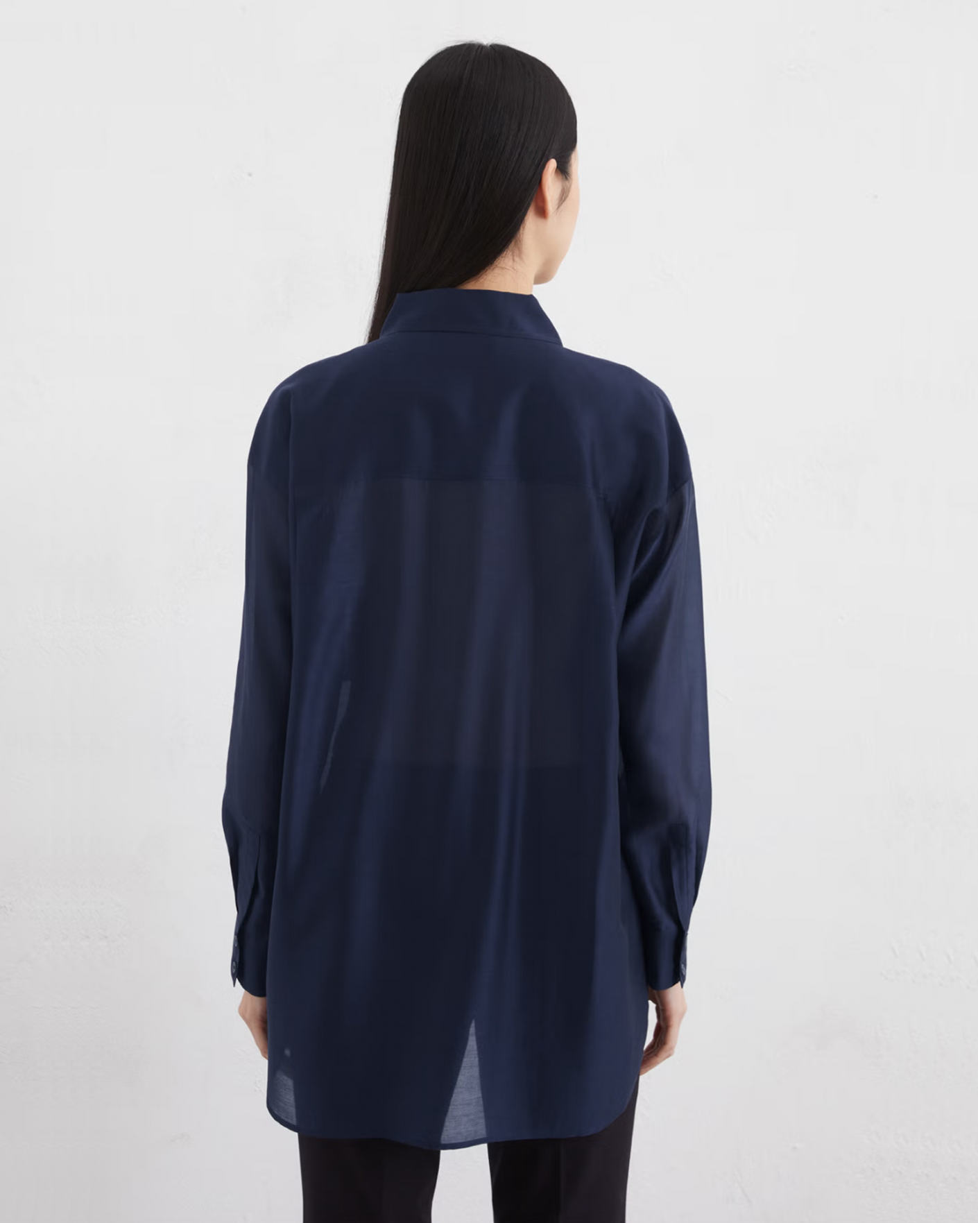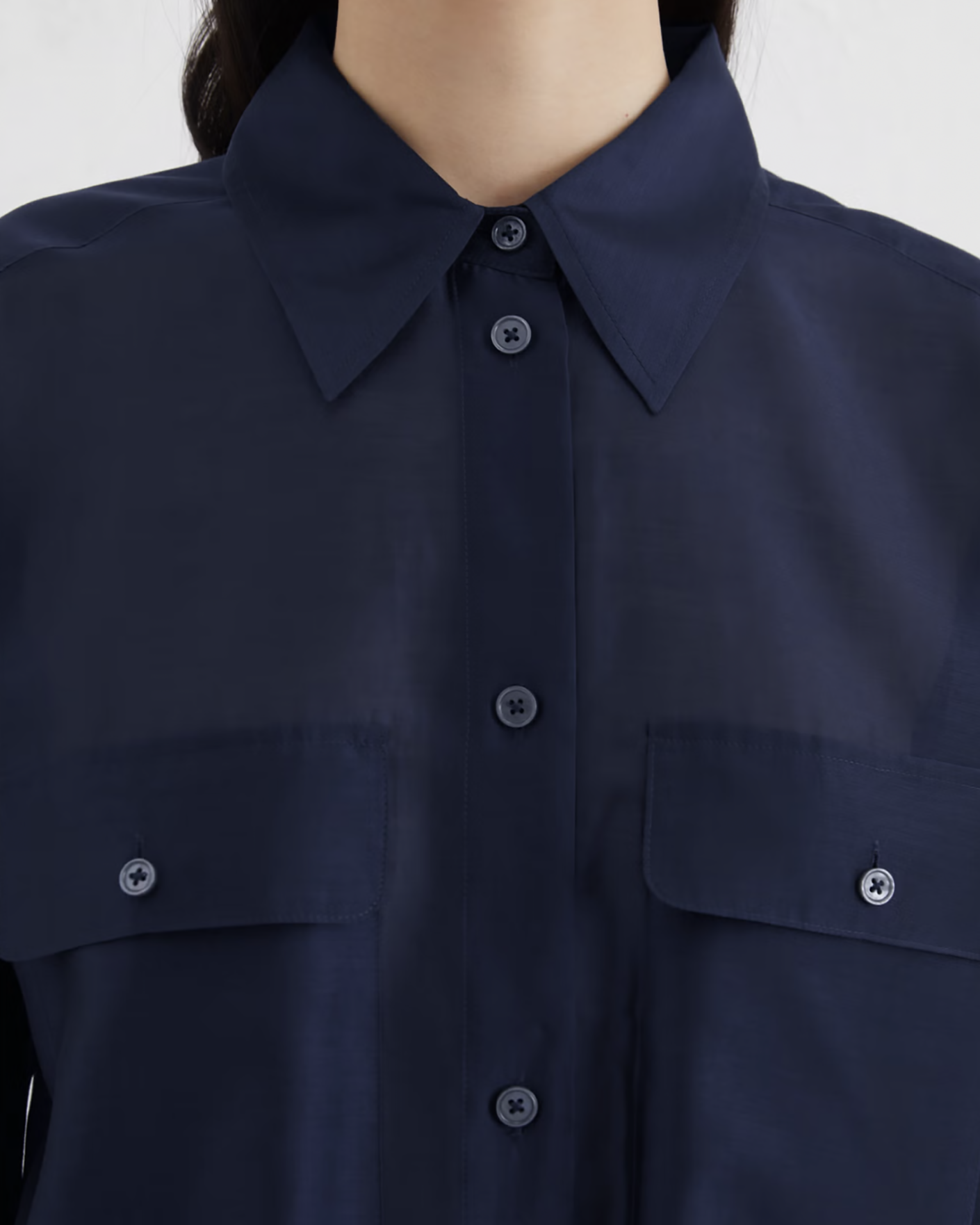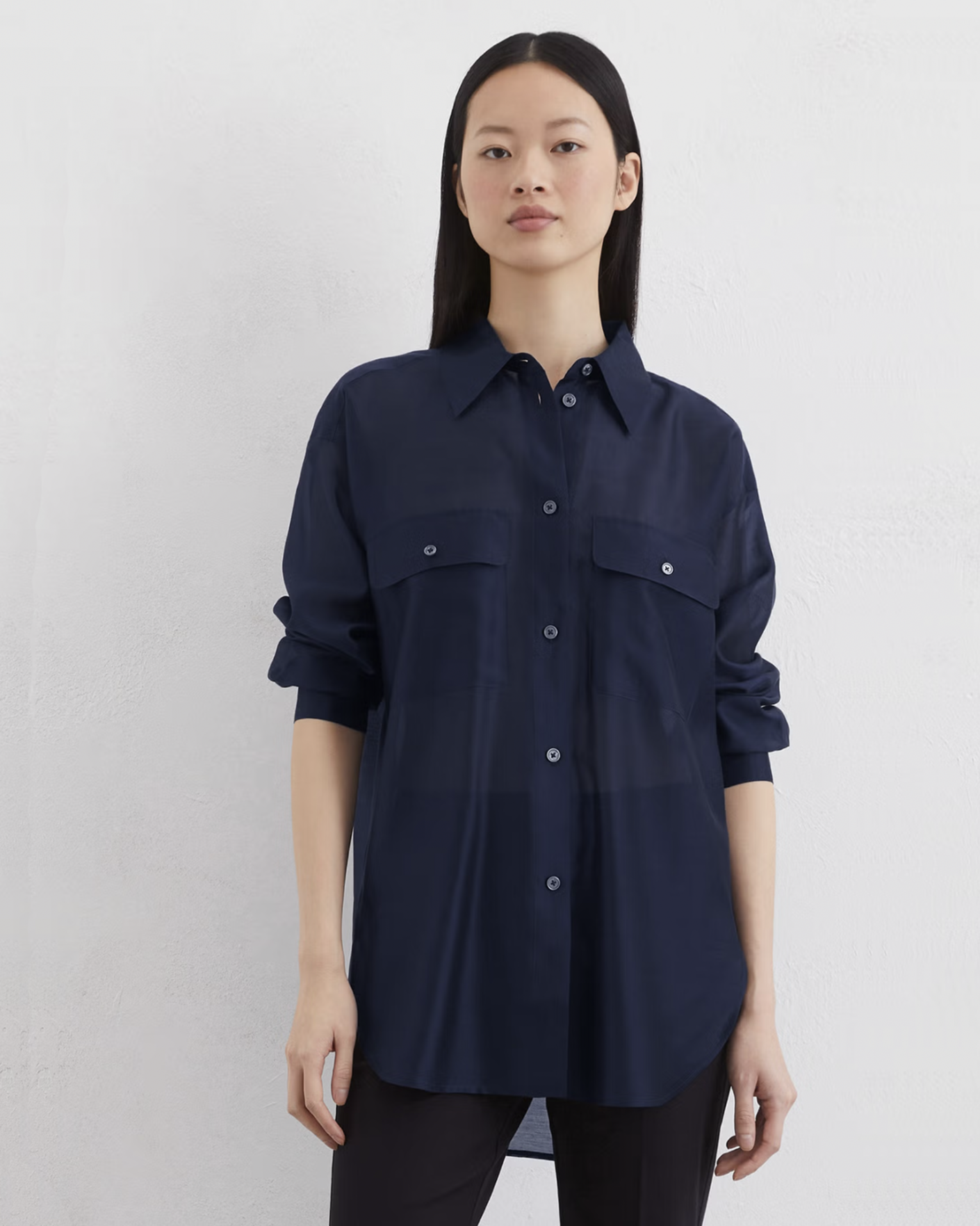 Свободная рубашка Marc O'Polo темно-синего цвета. Модель с отложным воротником, застежка на пуговицы, накладные нагрудные карманы с клапанами на пуговице. Небольшие закругленные разрезы по бокам. Рубашка отлично впишется в повседневный гардероб.