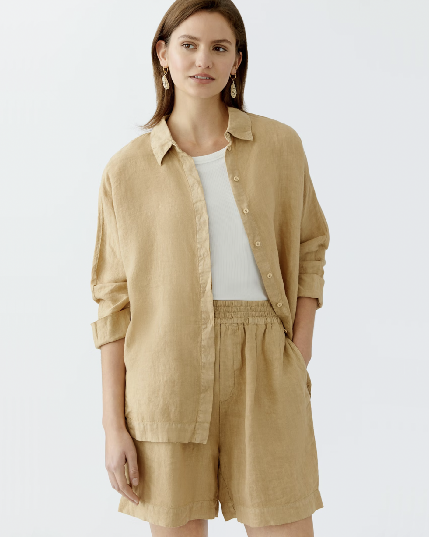 Летние шорты OUI бежевого цвета в строчный рисунок. Модель из 100% льна, завышенная талия на эластичном поясе в складку, врезные карманы по бокам. Шорты - база летнего гардероба.