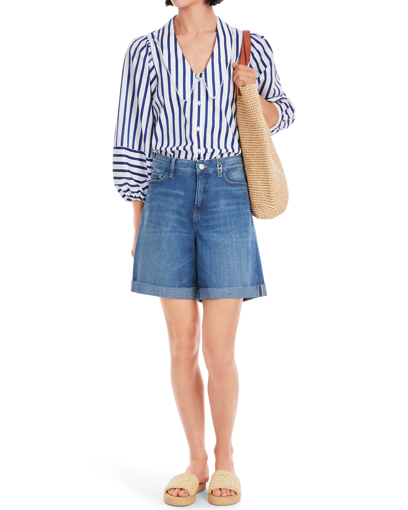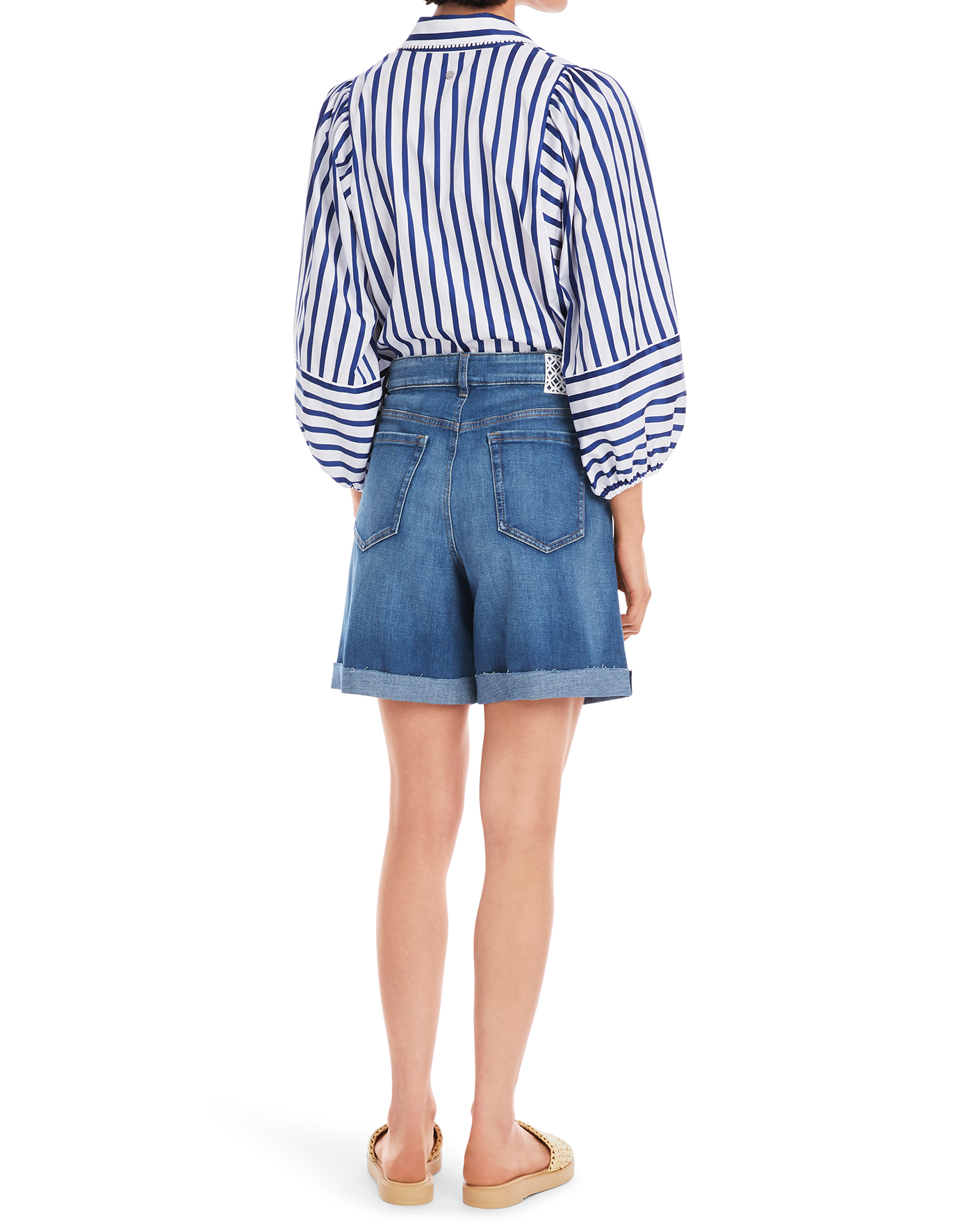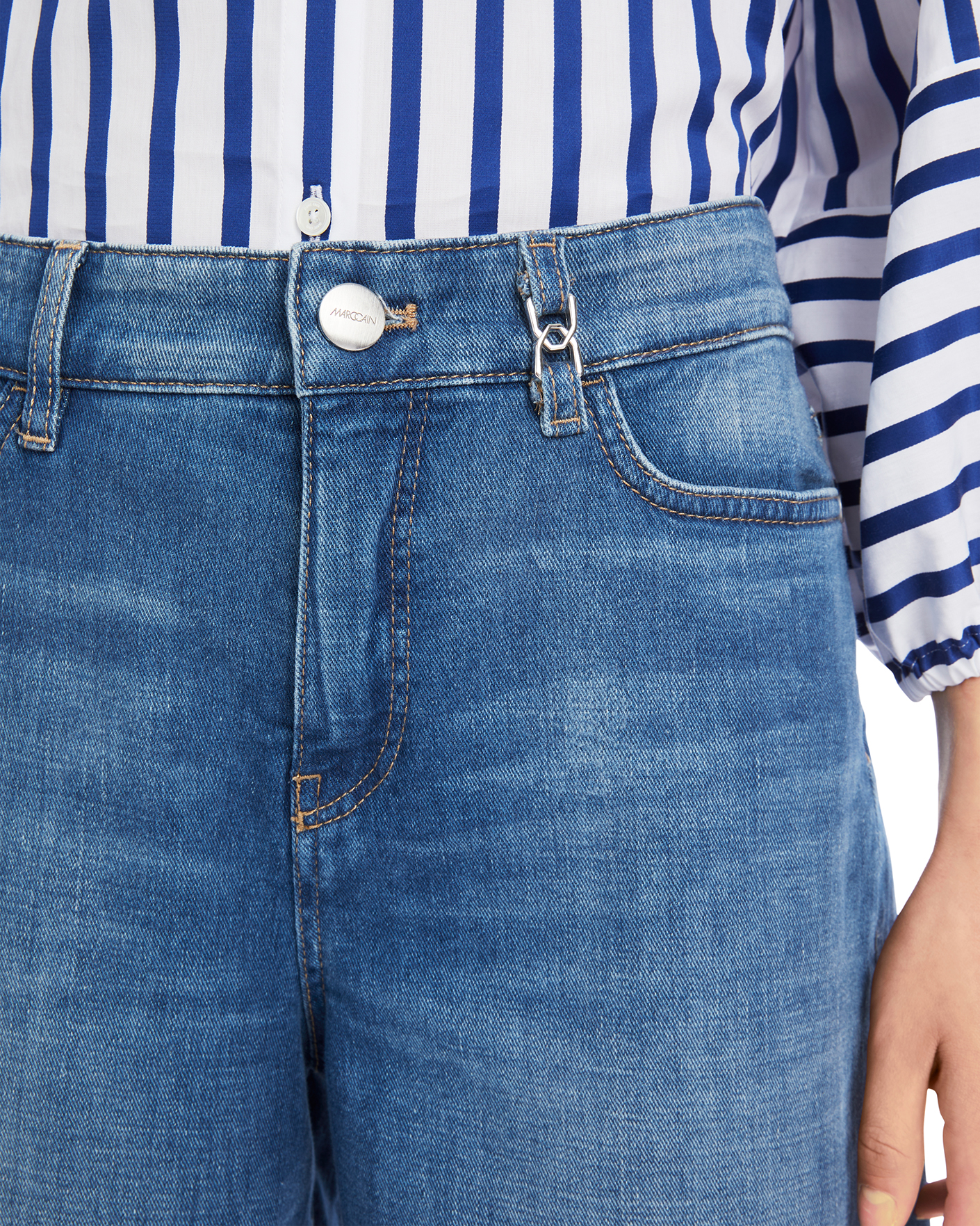 Джинсовые шорты Marc Cain Collection темно-голубого цвета. Хлопковая модель на стандартной застежке, карманы по бокам и накладные сзади. Специально необработанные края с отворотами. Шорты - база летнего гардероба.