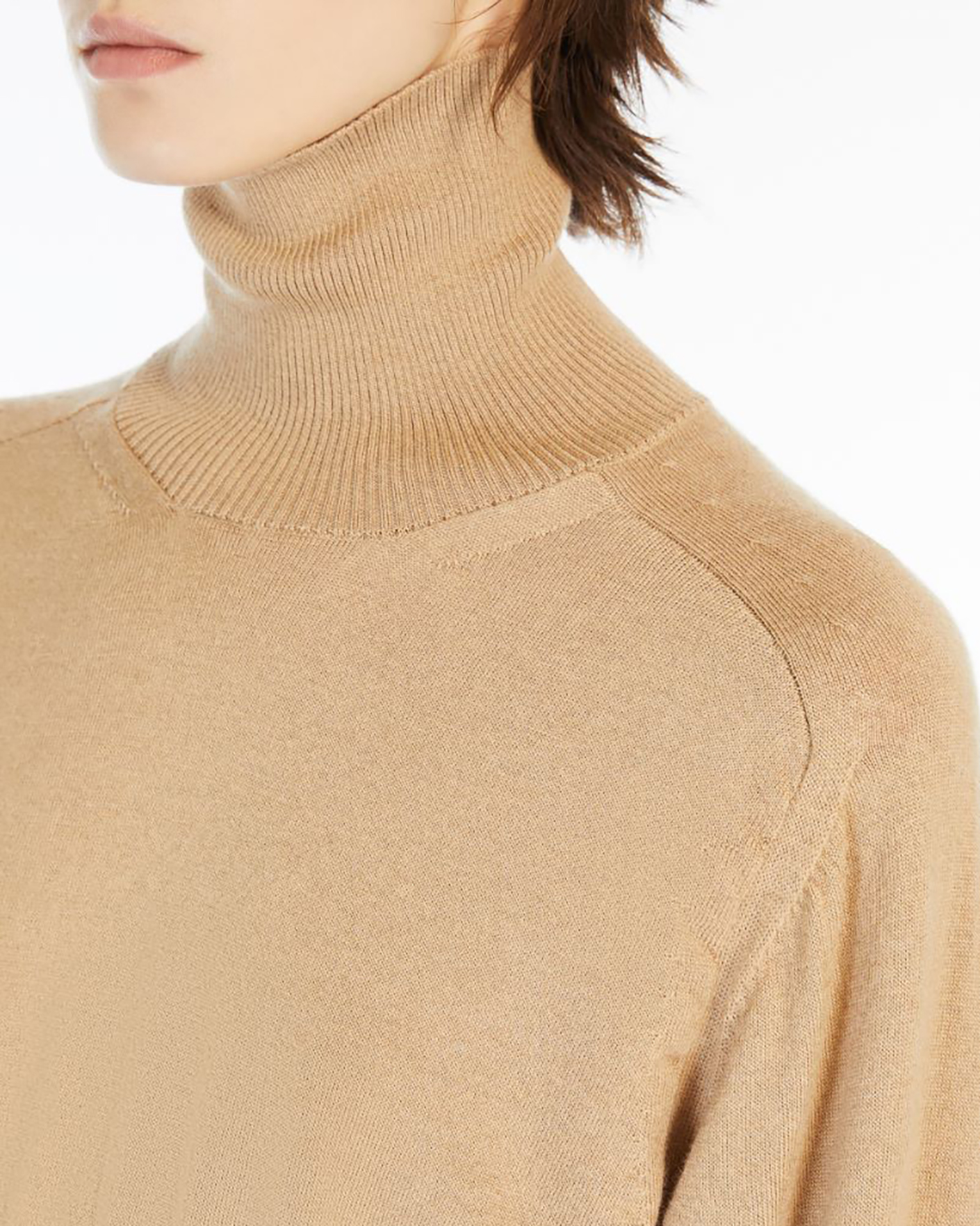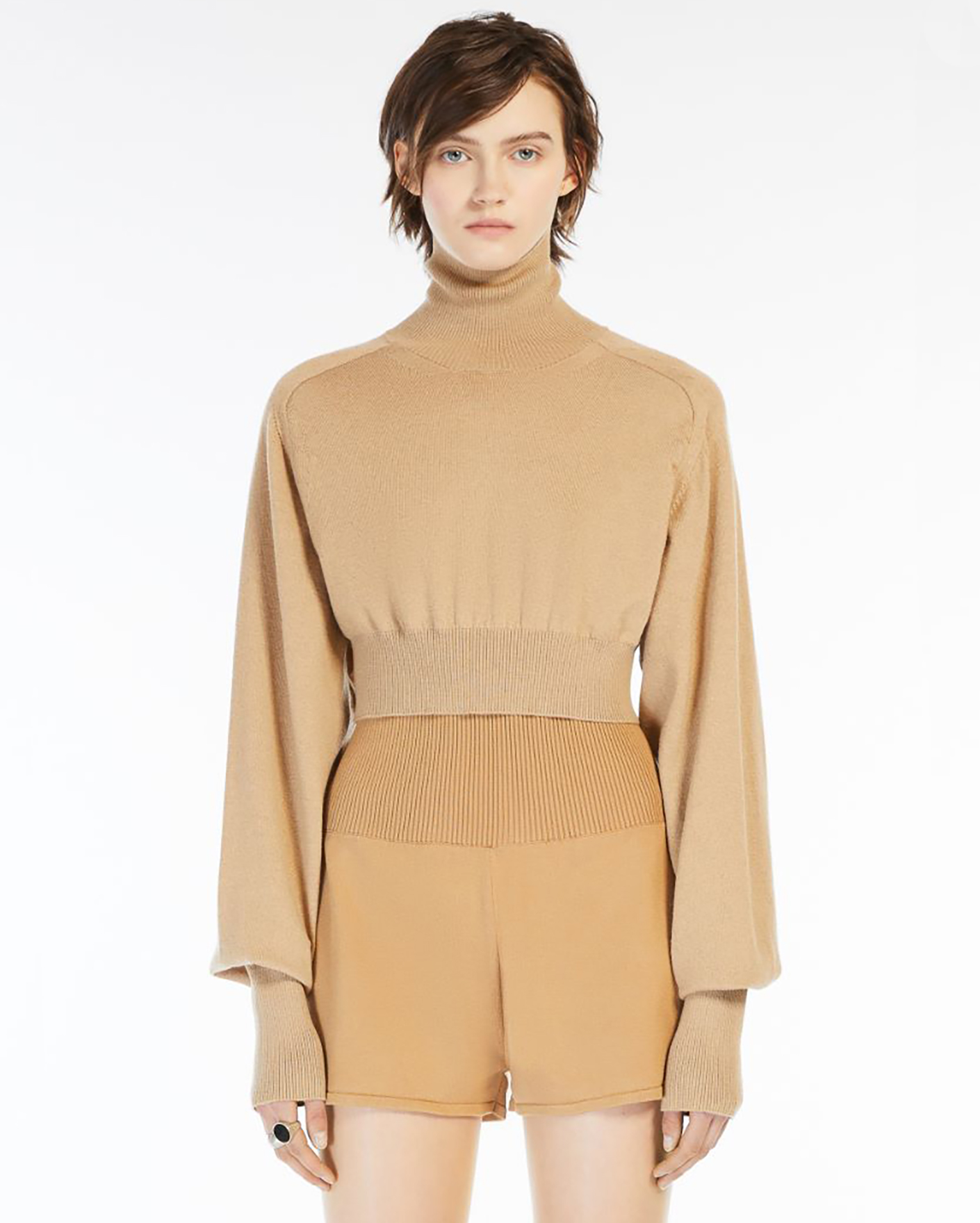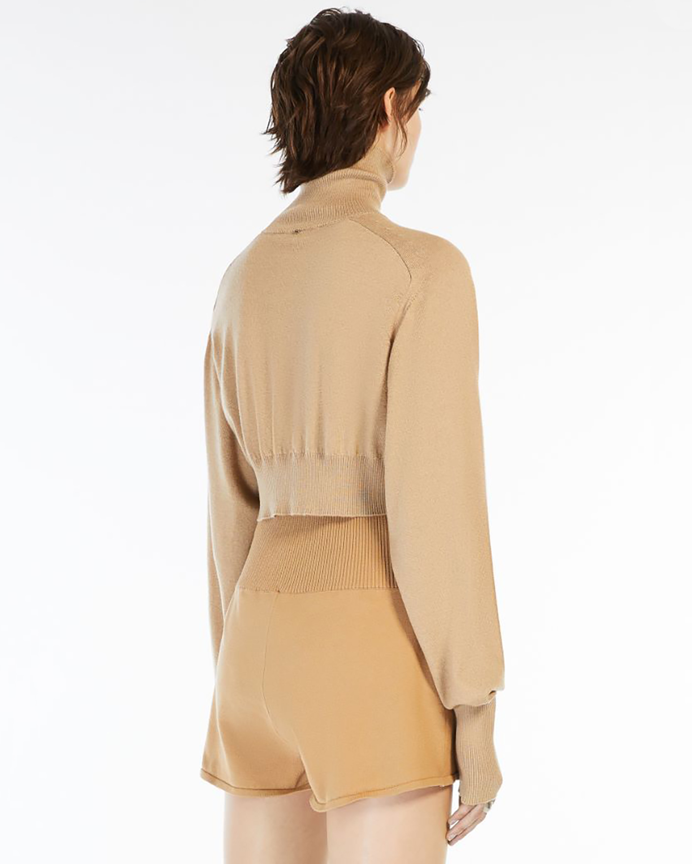 Укороченный свитер Sportmax бежевого цвета в строчный рисунок. Модель из 100% шерсти с удлиненными рукавами. Воротник-стойка, манжеты и низ на тонкой ребристой резинке. Свитер станет фаворитом повседневного гардероба.