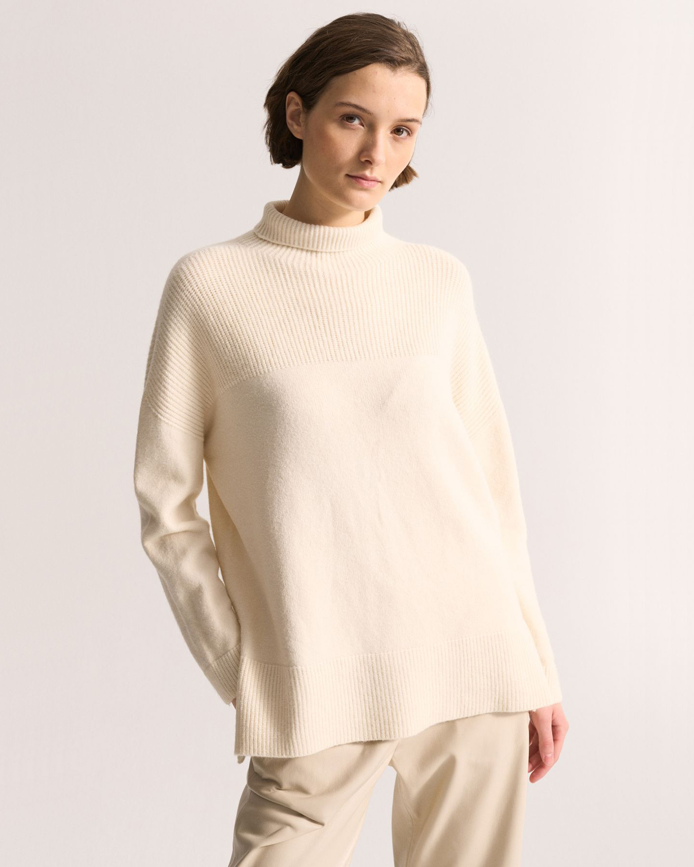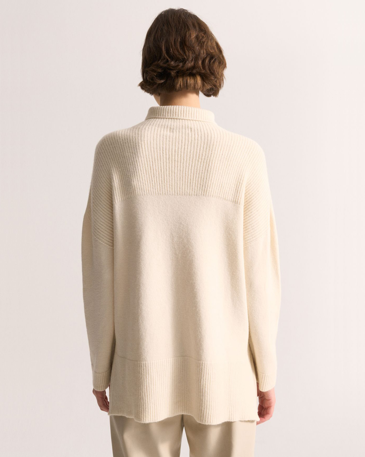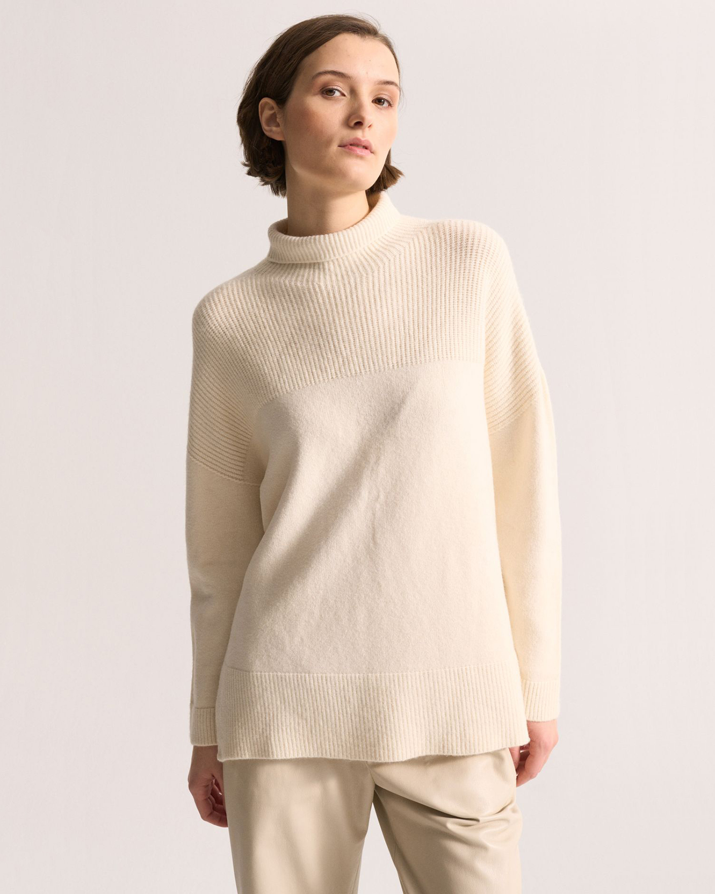 Свободный свитер UNQ кремового цвета в строчный рисунок. Модель с воротником-стойка, длинными рукавами, имеются небольшие боковые разрезы с удлиненной спинкой. Свитер - незаменимая вещь на каждый день.