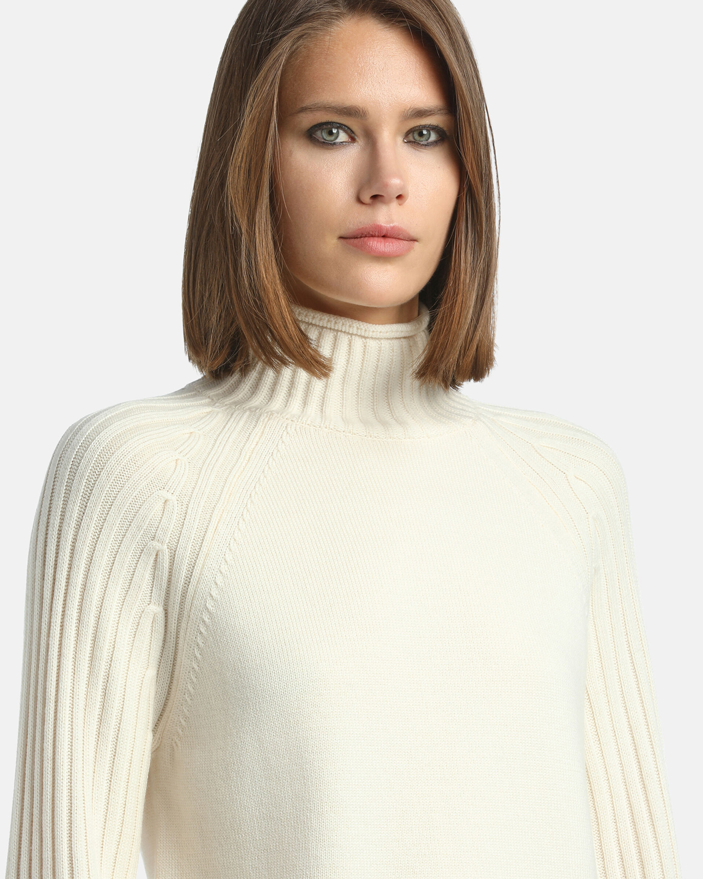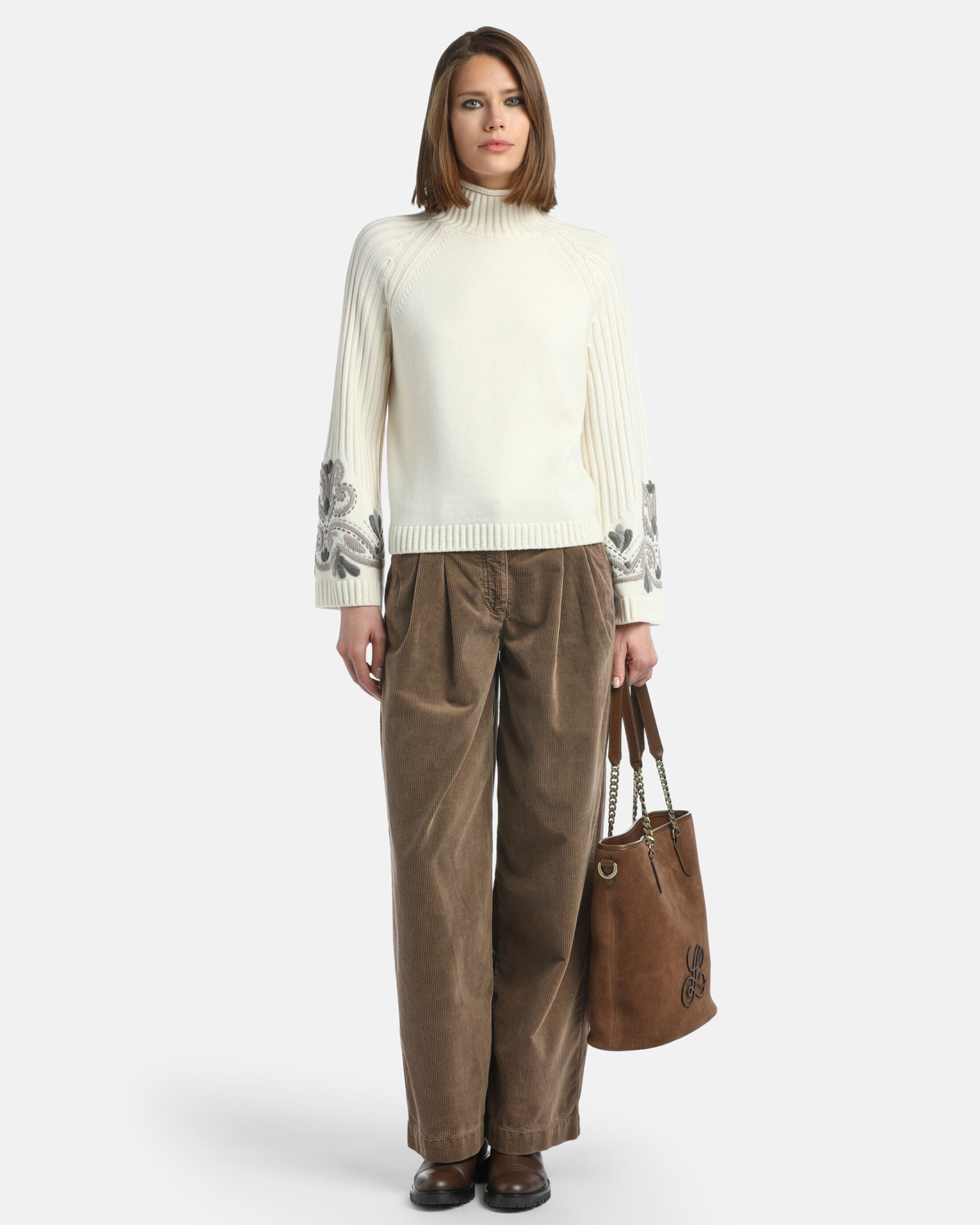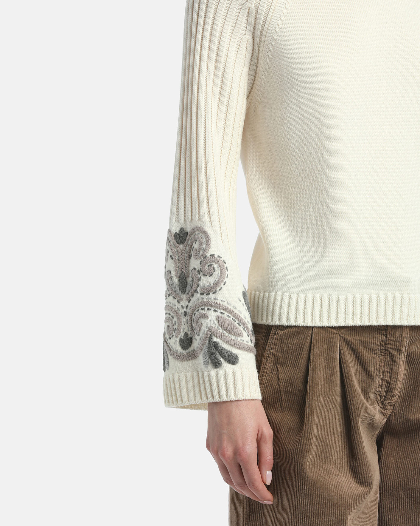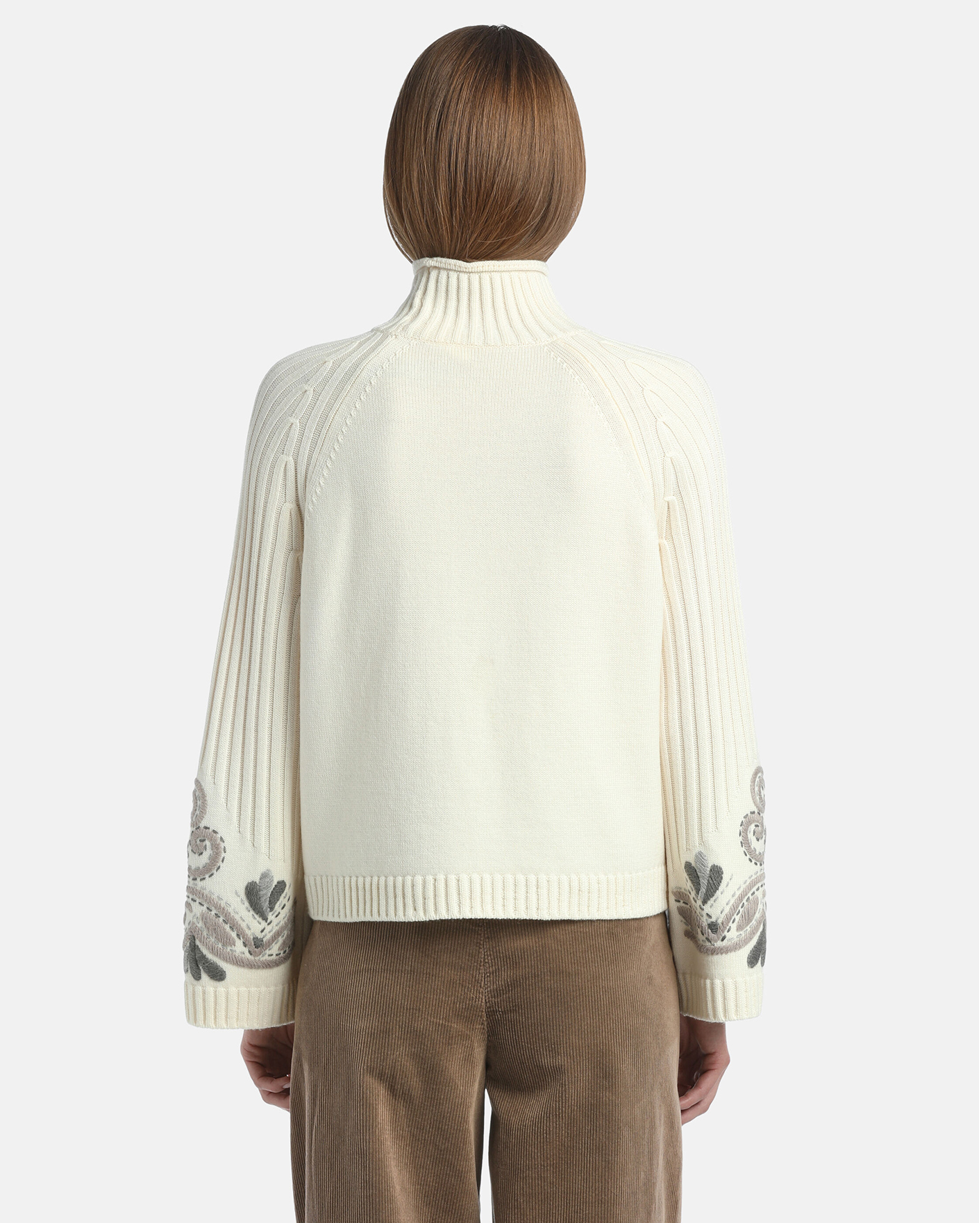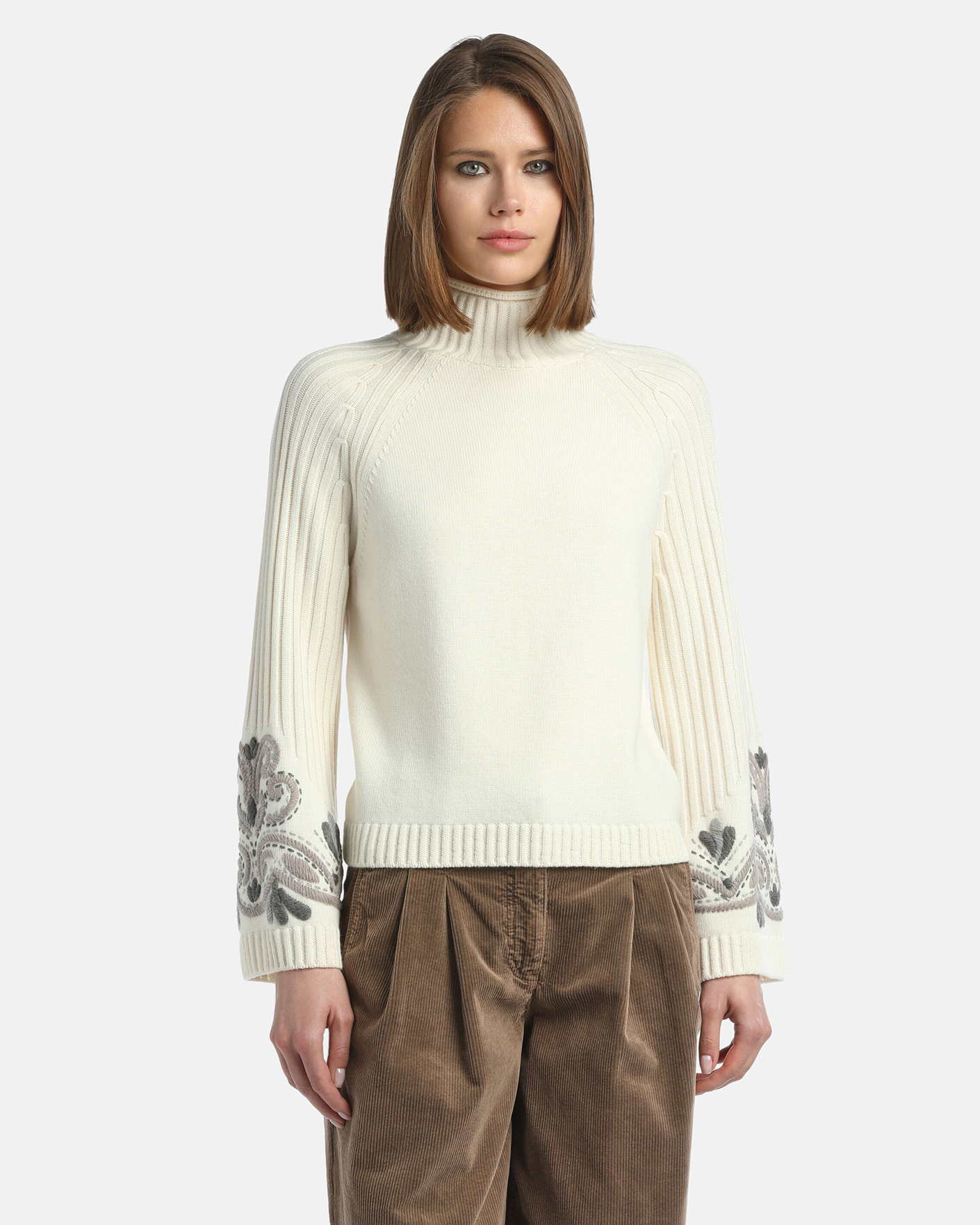 Стильный свитер Luisa Spagnoli молочного цвета из 100% шерсти. Модель с воротником-стойка, длинные рукава в вязку-резинка декорированы вышивкой. Свитер станет фаворитом вашего гардероба.