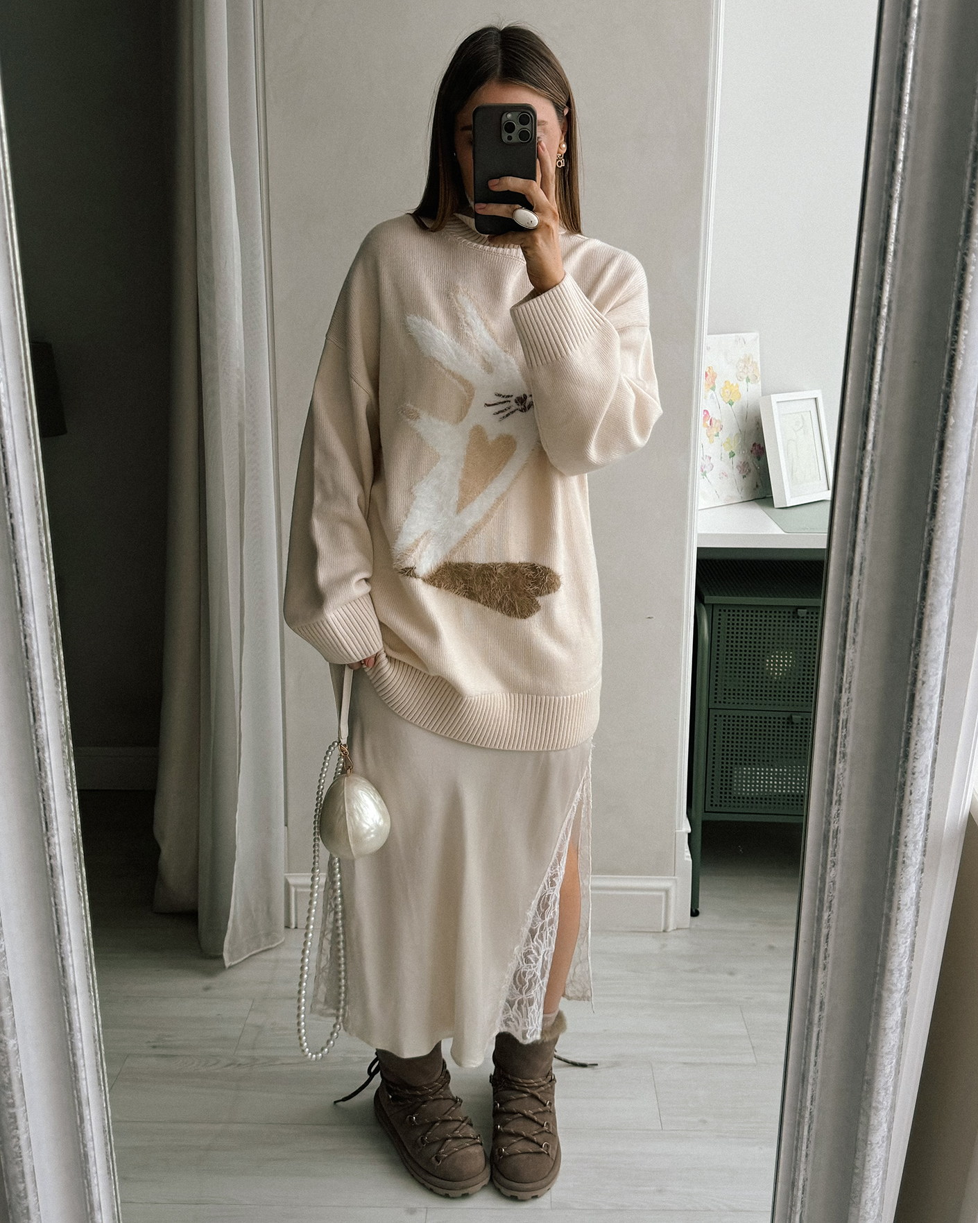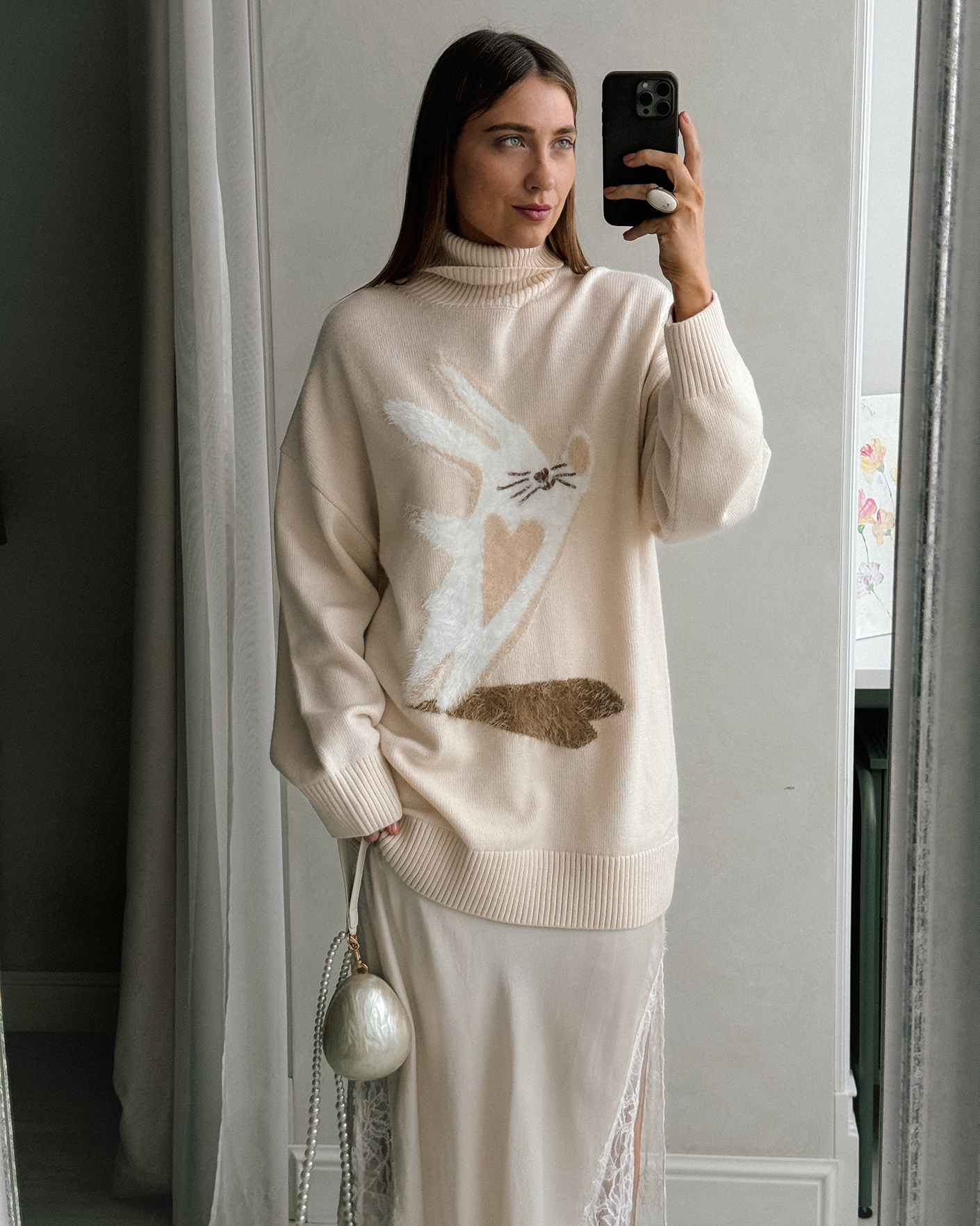 Свободный свитер Akhmadullina Dreams светло-бежевого цвета. Пушистый зайчик украшает собой уютный свитер из мягкой полушерстяной пряжи молочного оттенка. Модель удлиненного прямого силуэта с высоким теплым воротником и мягкой приспущенной линией плеч. Свитер станет любимой вещью.