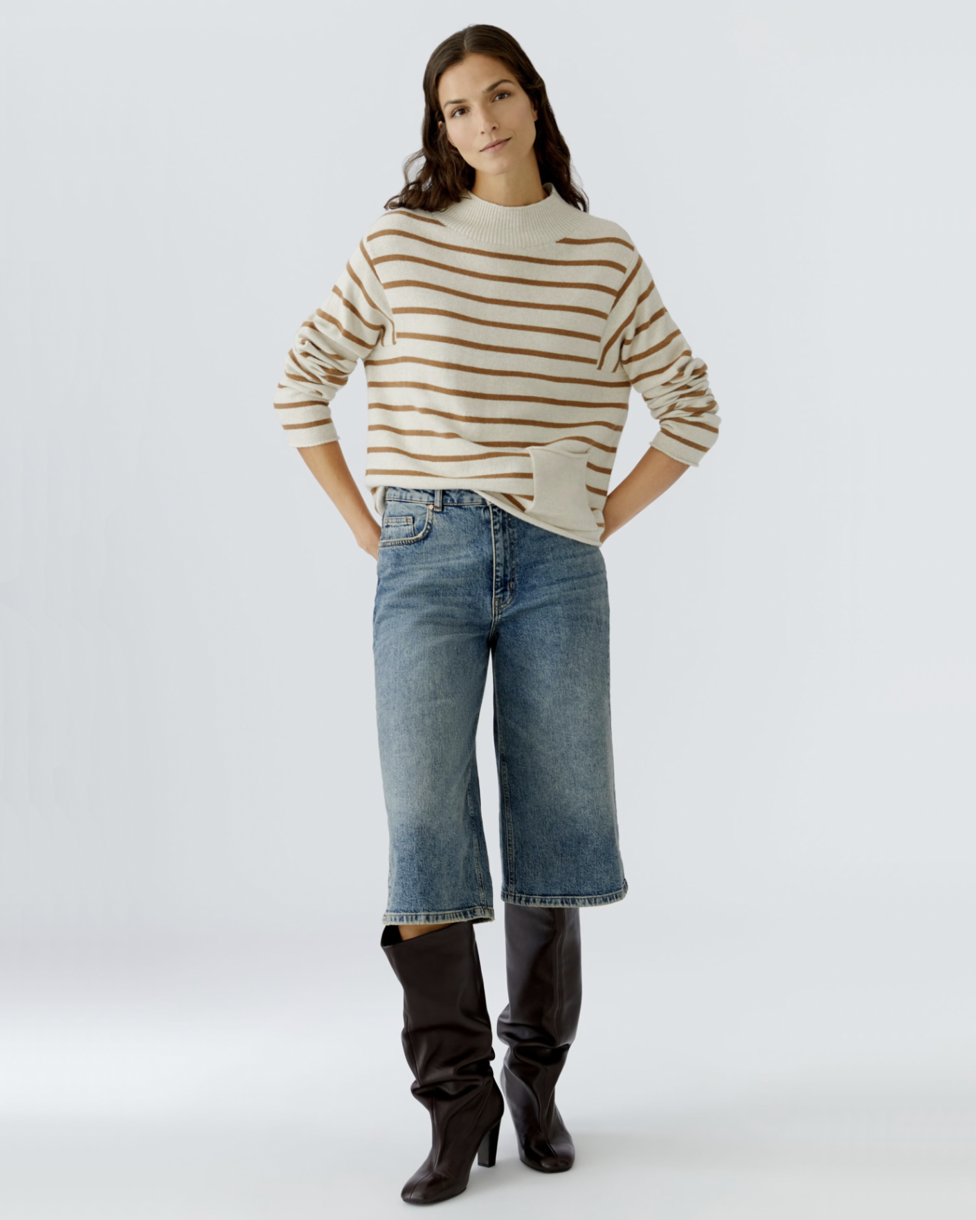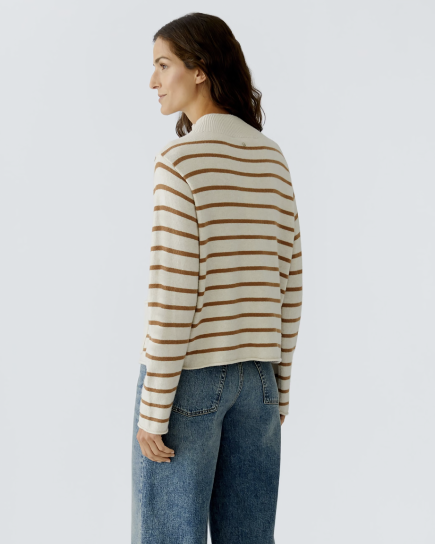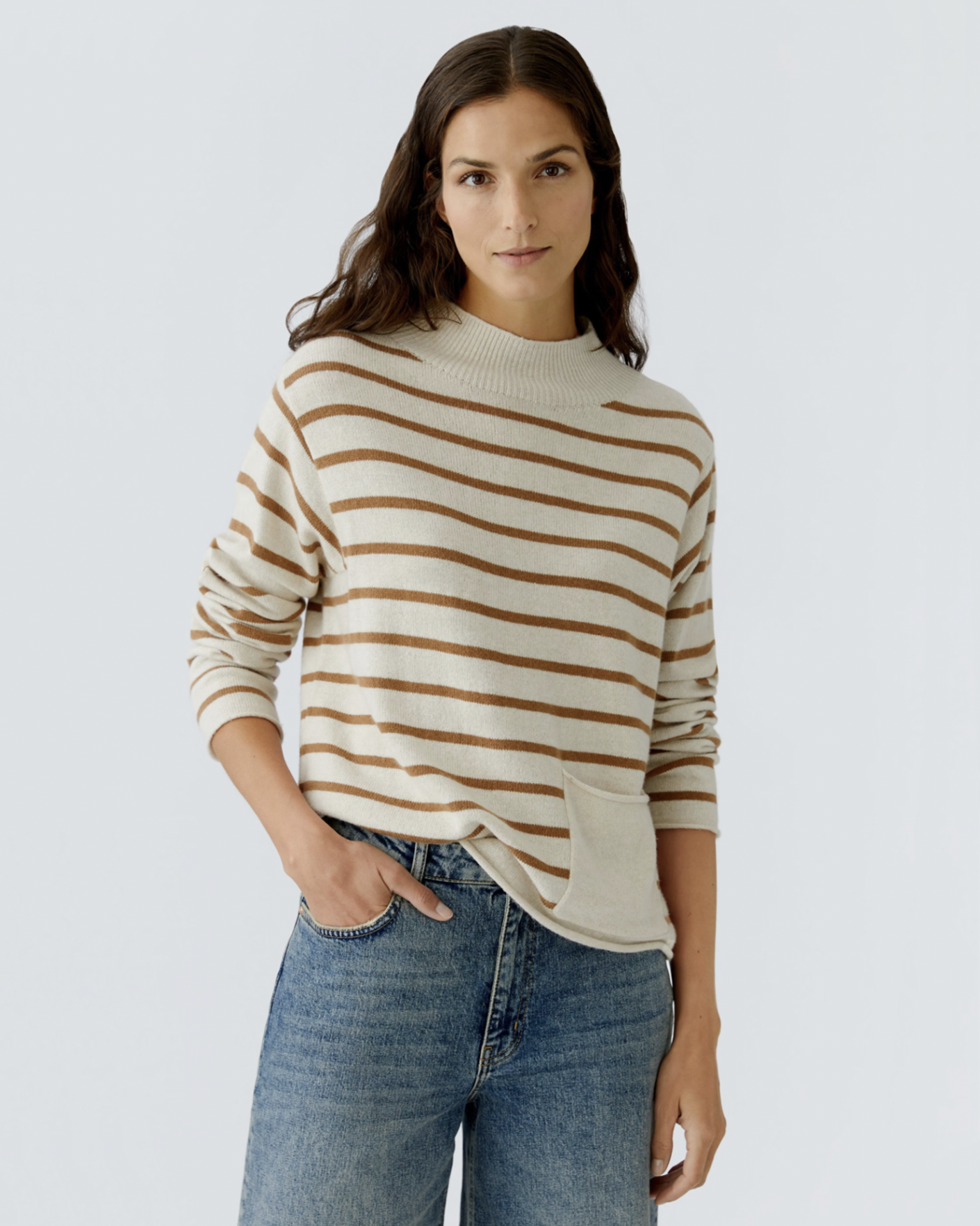 Свободный свитер OUI бежевого цвета в горизонтальную полосу. Модель с вывязанным воротником-стойка, имеется накладной карман сбоку. Свитер отлично впишется в повседневный гардероб.