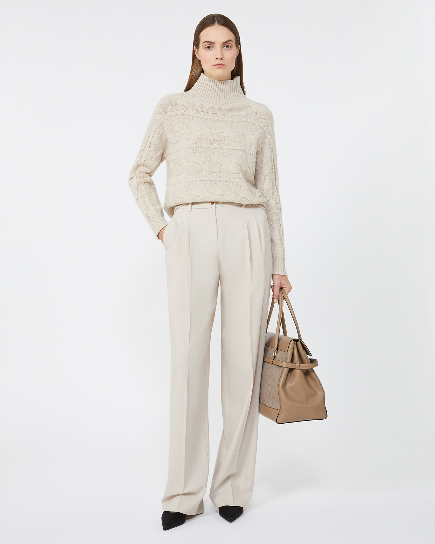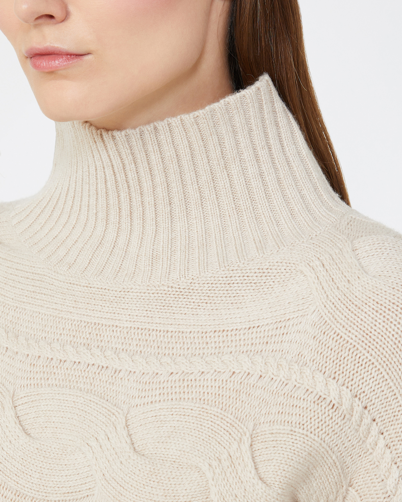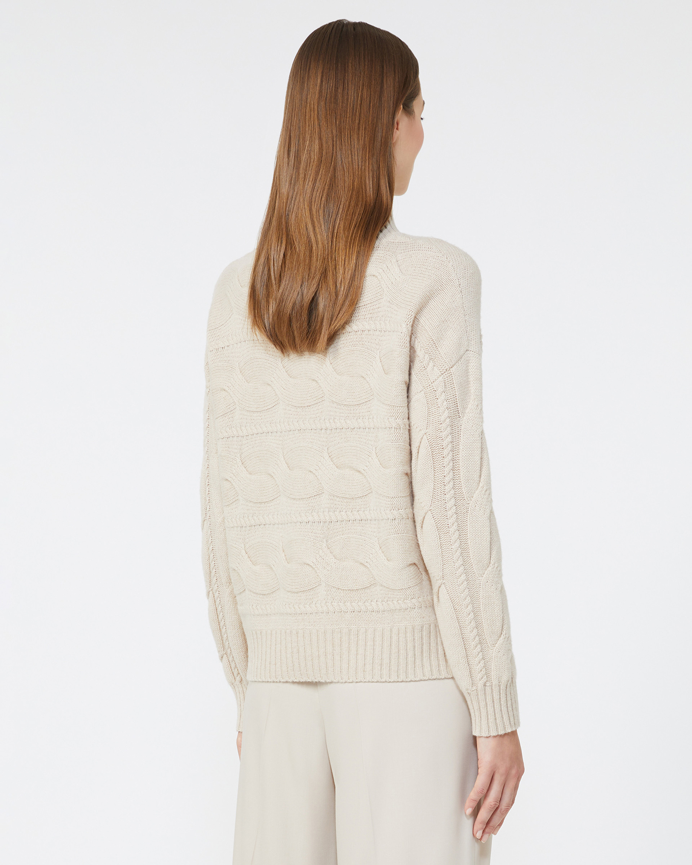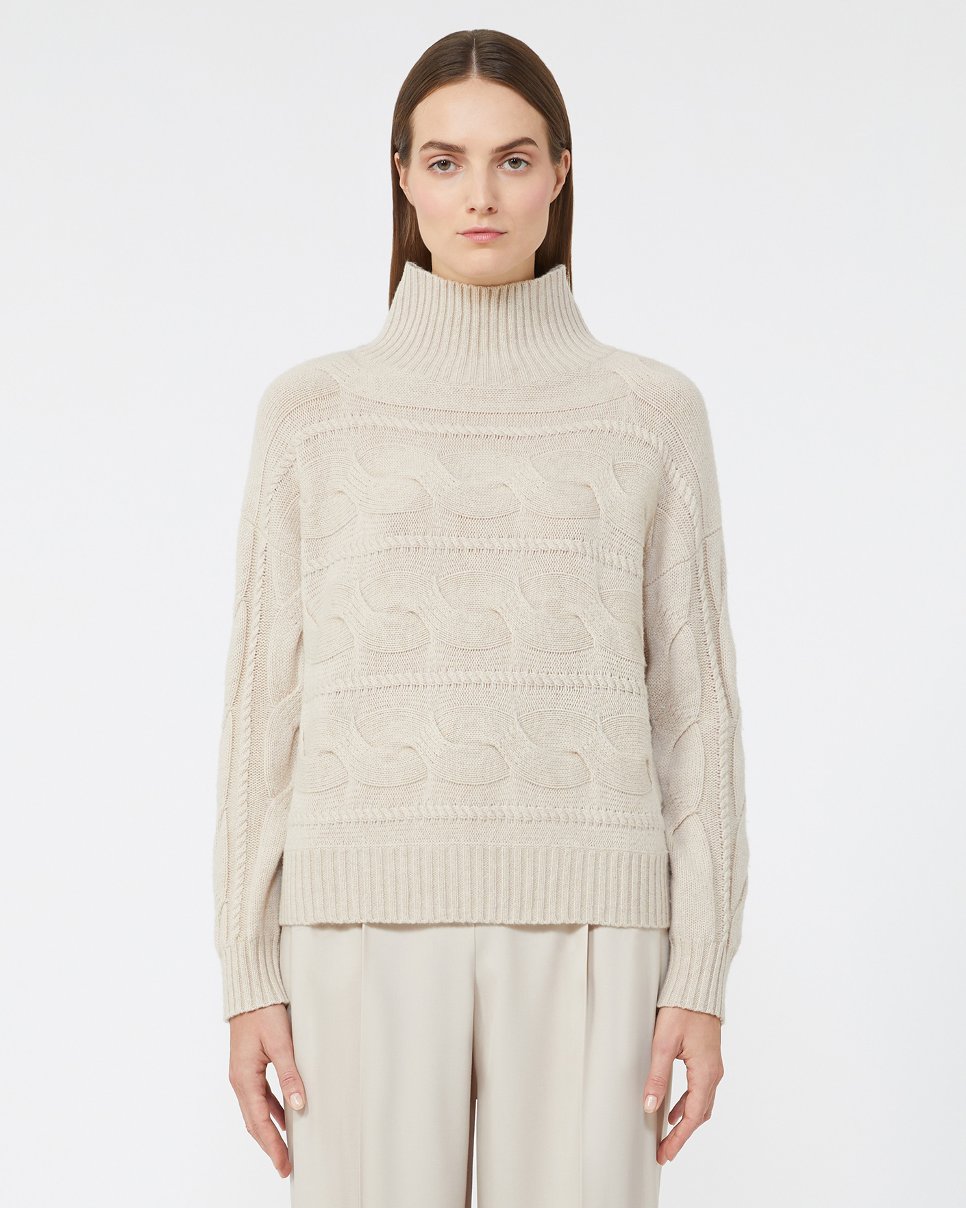 Свободный свитер Max Mara Studio светло-бежевого цвета в текстурную горизонтальную вязку. Модель выполнена из высококачественного сочетания шерсти и кашемира. Воротник-стойка, манжеты и низ на вывязанной резинке. Свитер станет незаменимой вещью вашего гардероба.