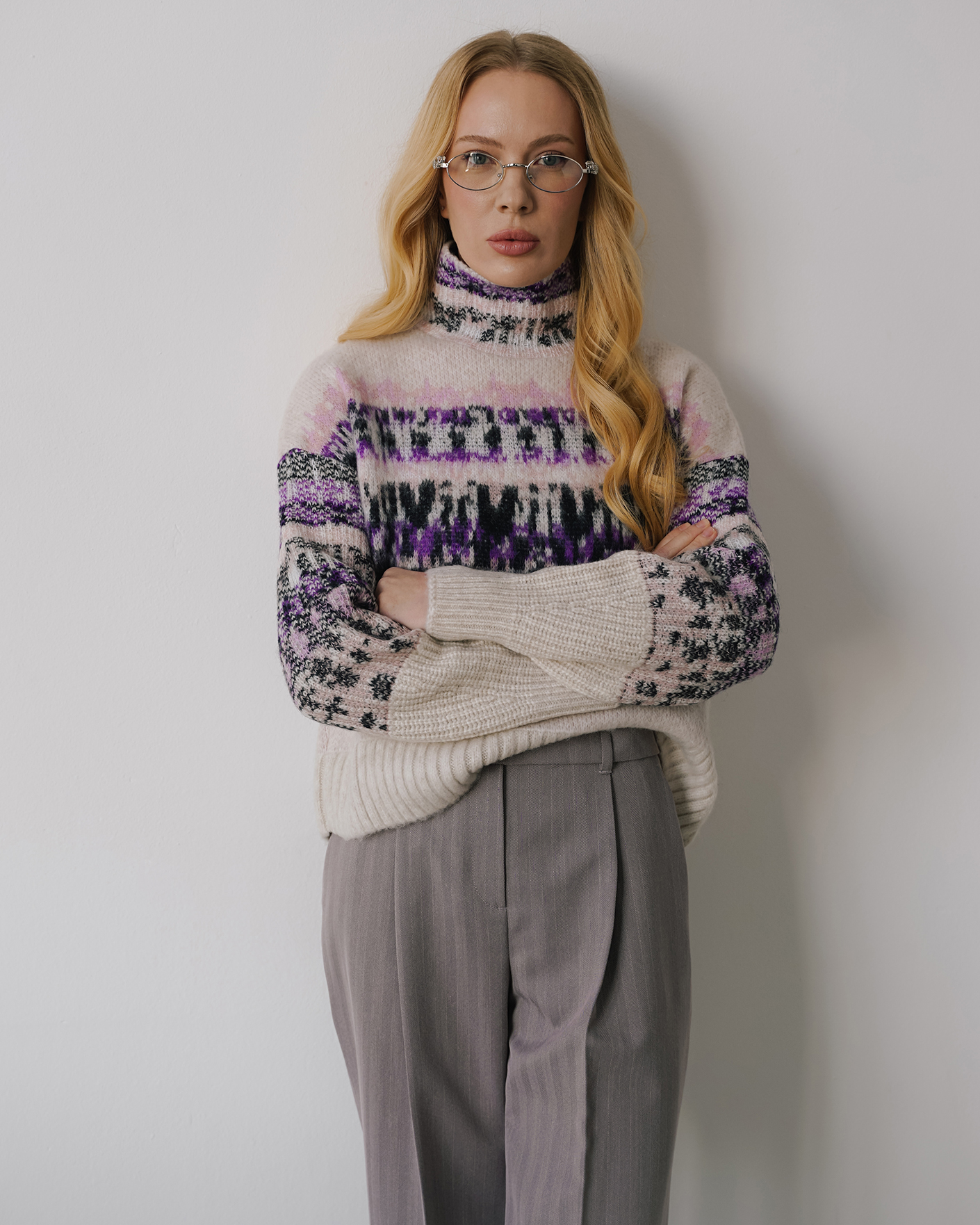 Свитер Marc Cain розово-фиолетового цвета в скандинавский рисунок. Модель с воротником-стойка, спущенная линия плеча с длинными рукавами, манжеты и низ на вывязаной резинке. Свитер отлично впишется в ваш гардероб.
