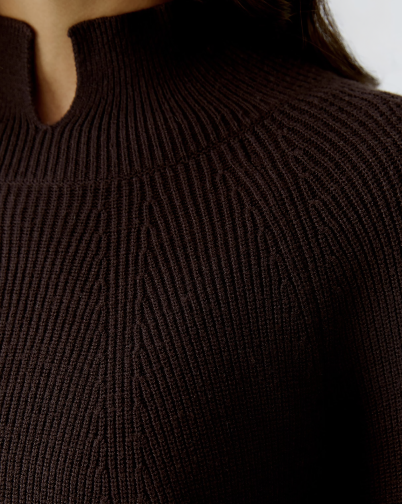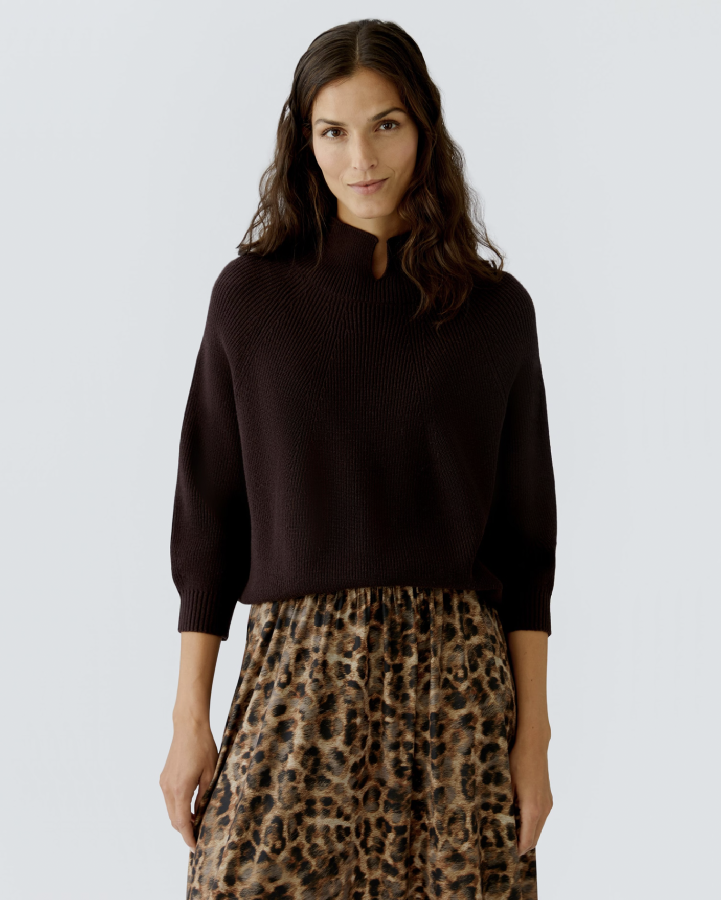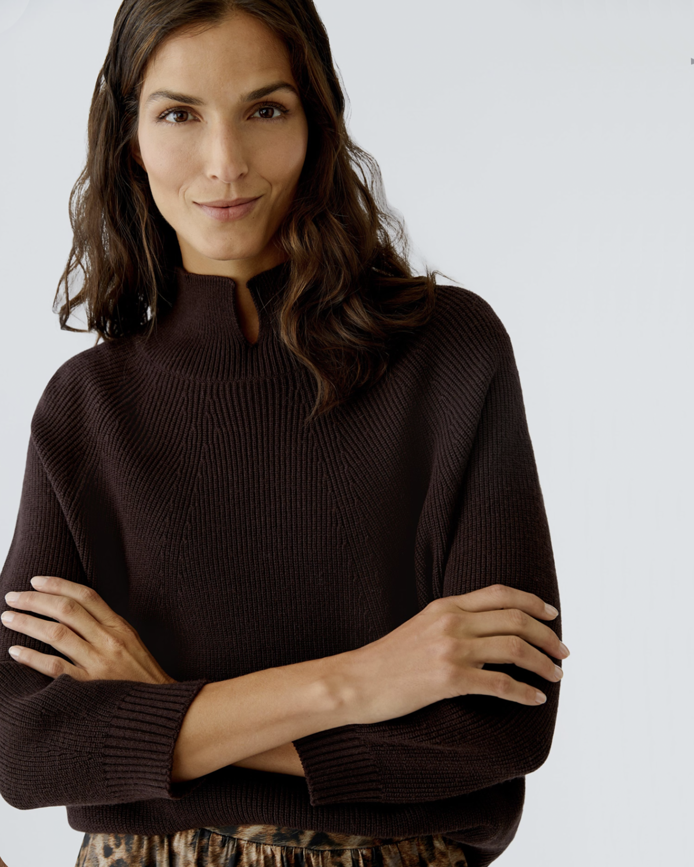 Теплый свитер OUI темно-коричневого цвета в вертикальную вязку. Модель О-силуэта, с воротником-стойка, вывязанными манжетами и низом. Джемпер отлично впишется в повседневный гардероб.