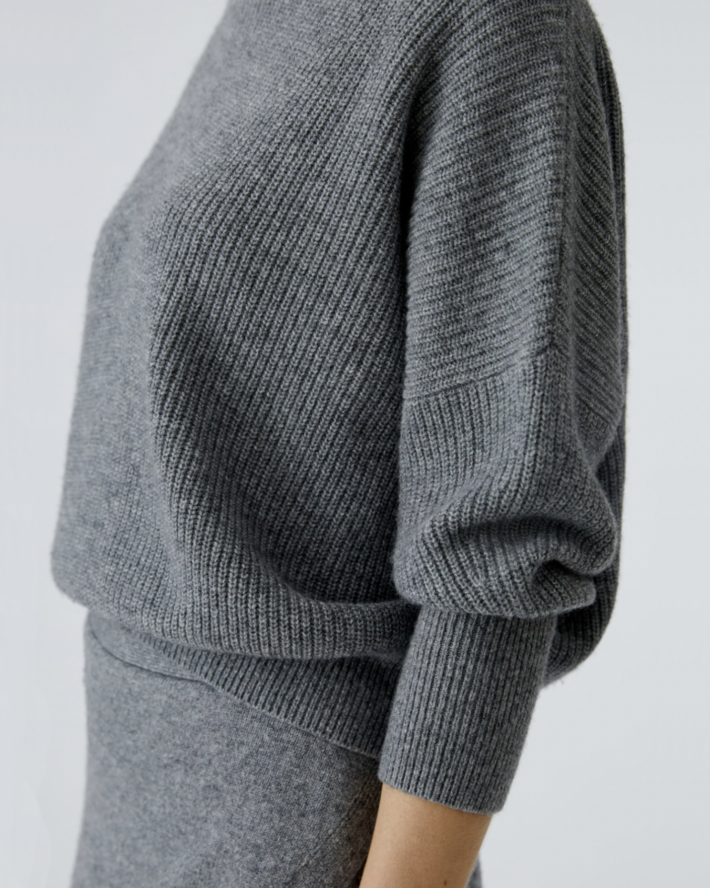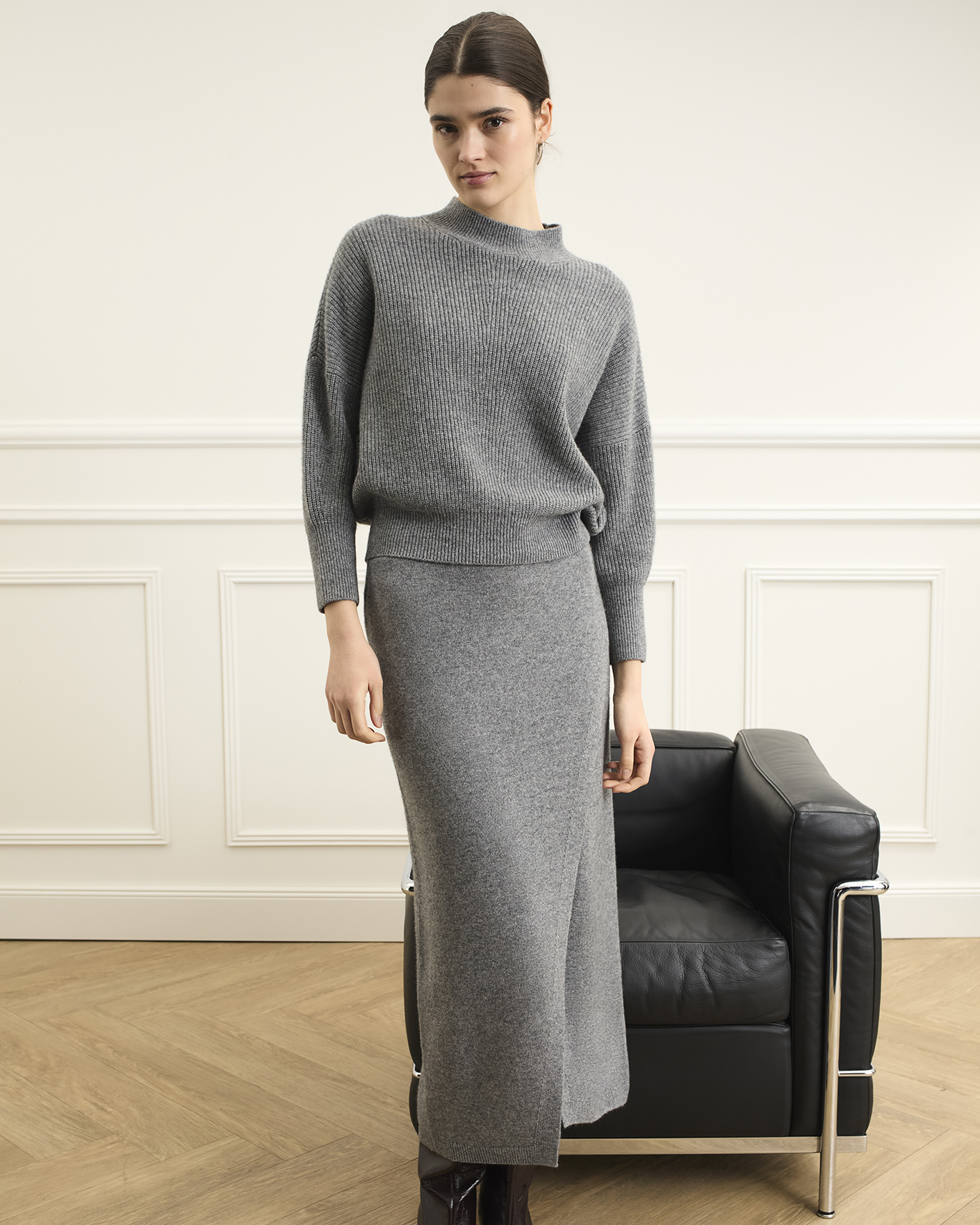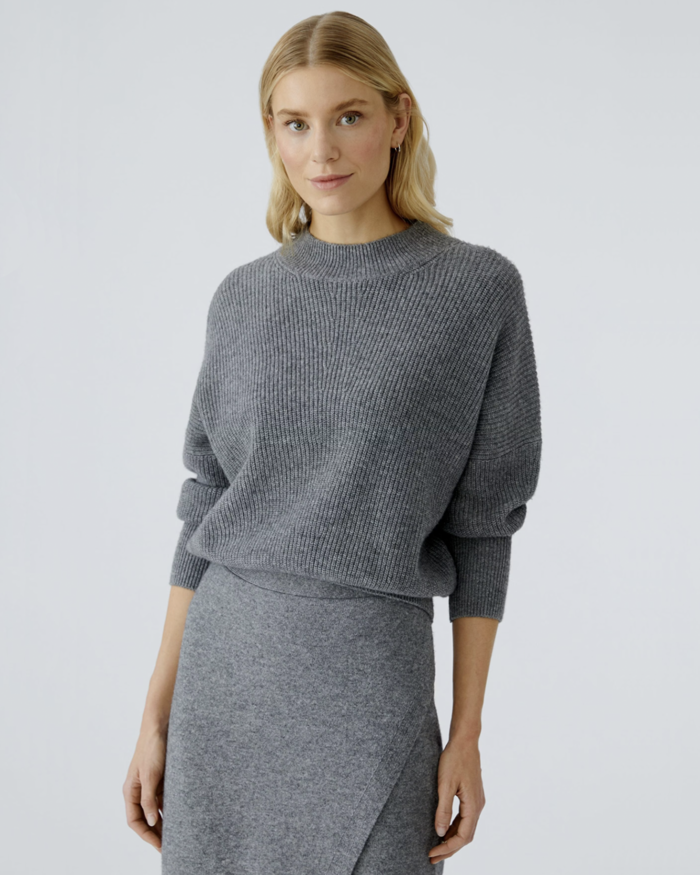 Теплый свитер OUI серого цвета в вертикальную вязку. Модель с вывязанным воротником-стойка, манжетами и низом. Свитер отлично впишется в повседневный гардероб.