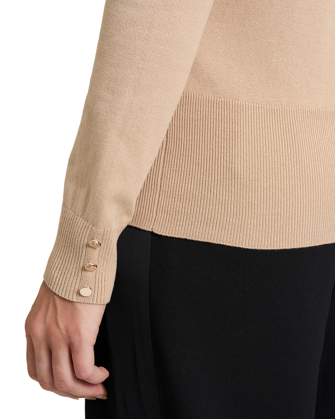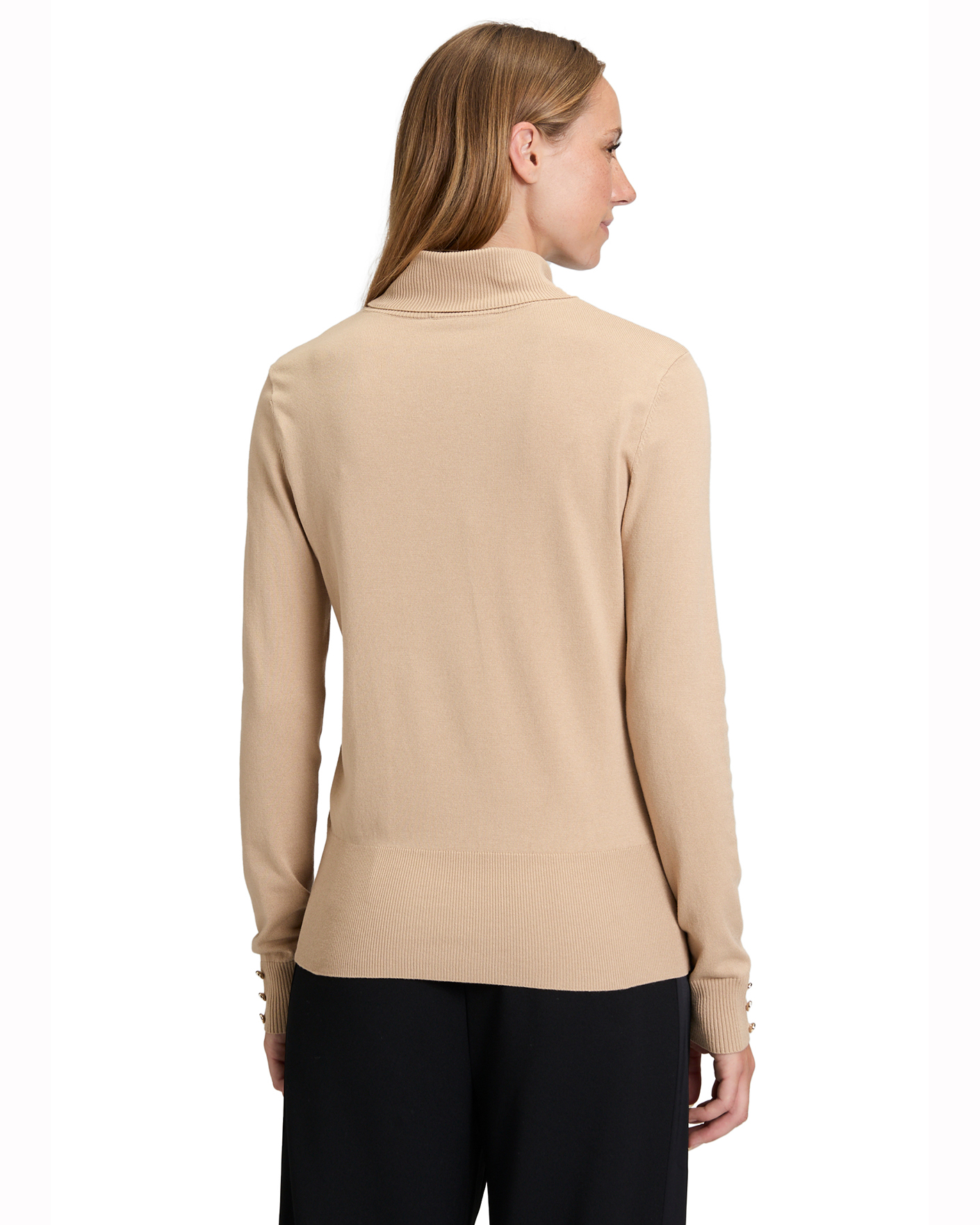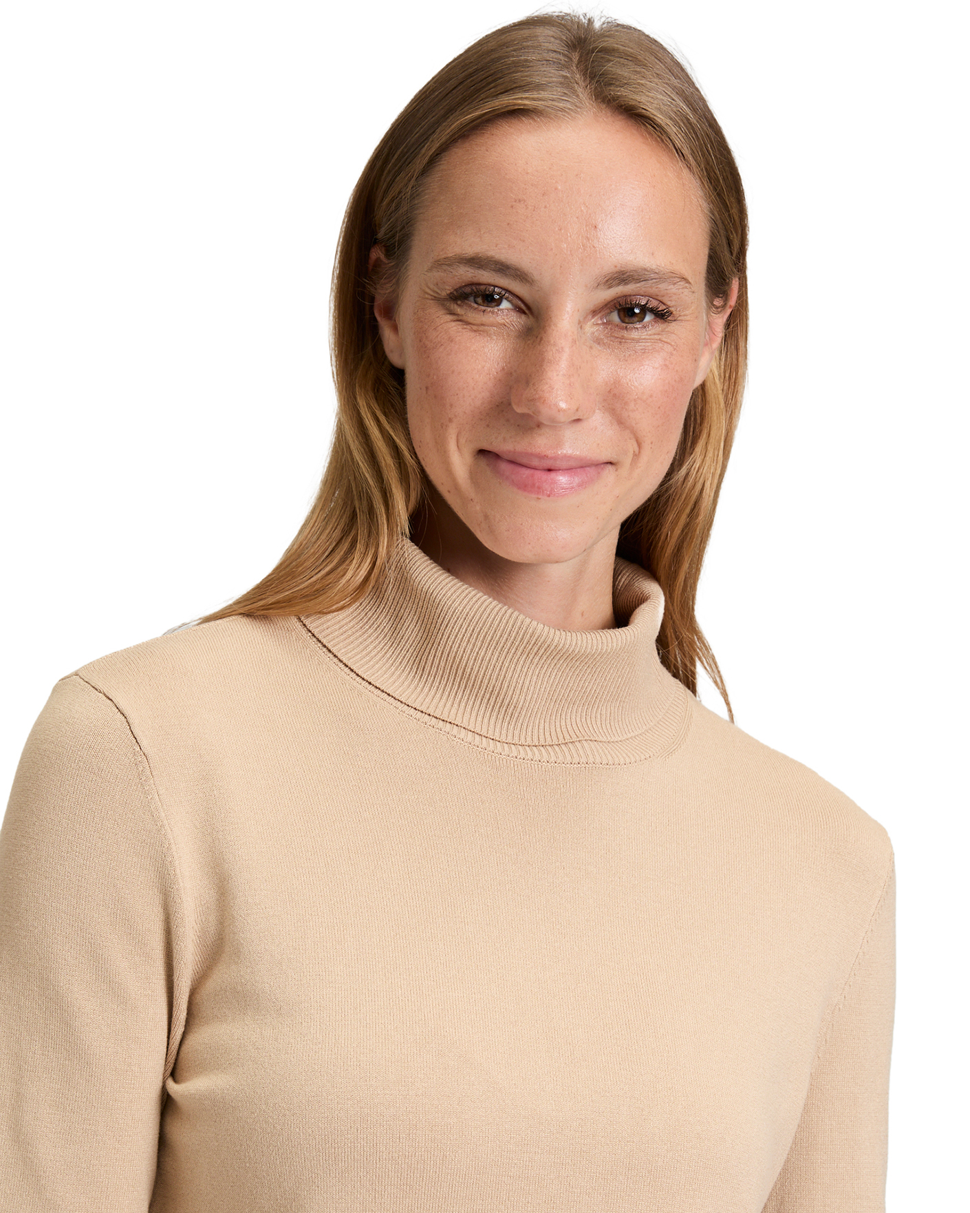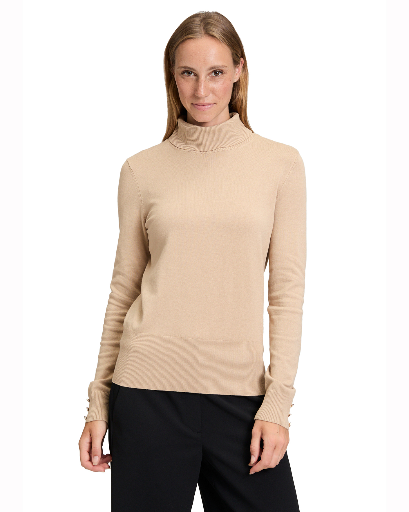 Приталенная водолазка Betty Barclay бежевого цвета в строчный рисунок. Модель с воротником-стойка и длинными рукавами, манжеты которых декорированы пуговицами. Водолазка отлично впишется в ваш гардероб.