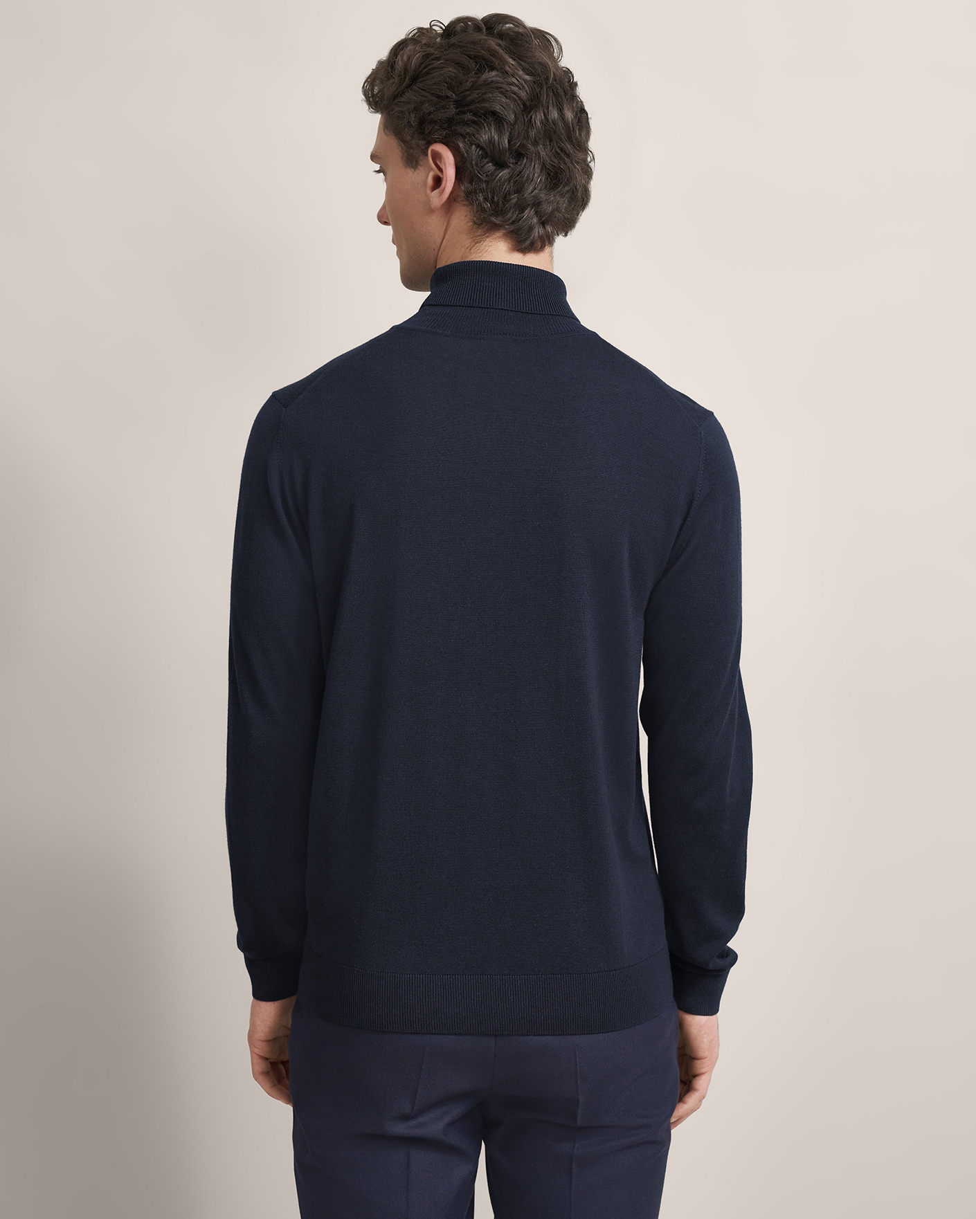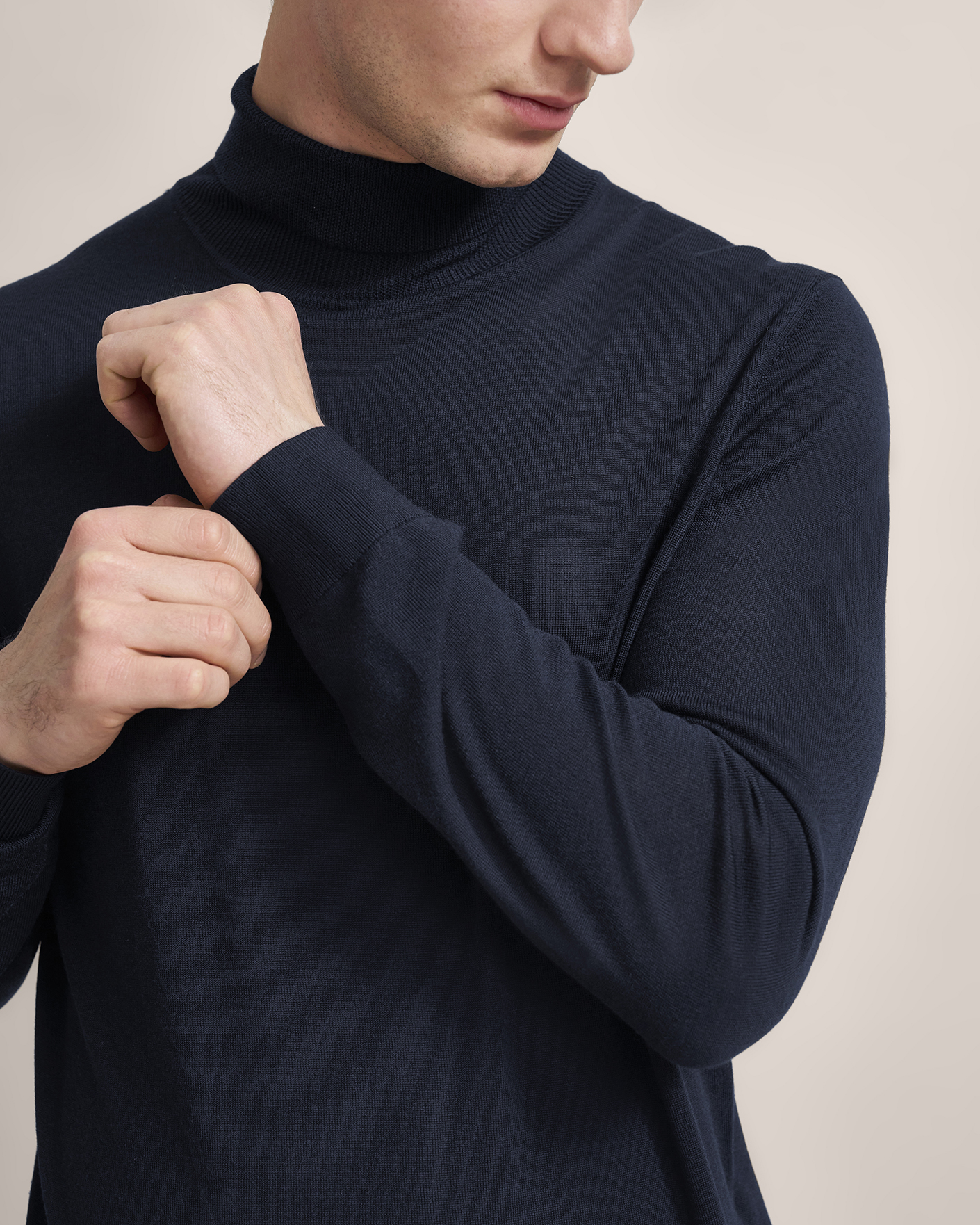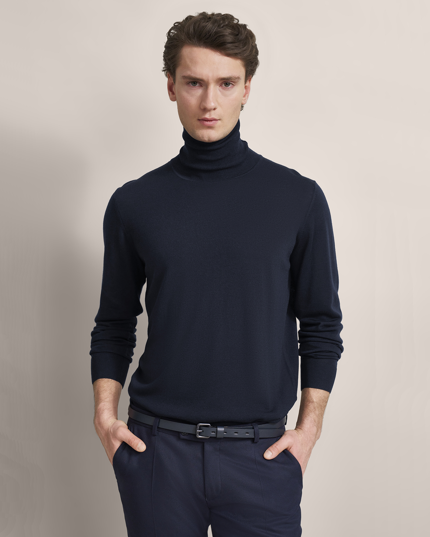 Теплая водолазка Bugatti темно-синего цвета в строчный рисунок. Модель из 100% шерсти, двойной воротник-стойка, длинные рукава. Водолазка - база повседневного гардероба.