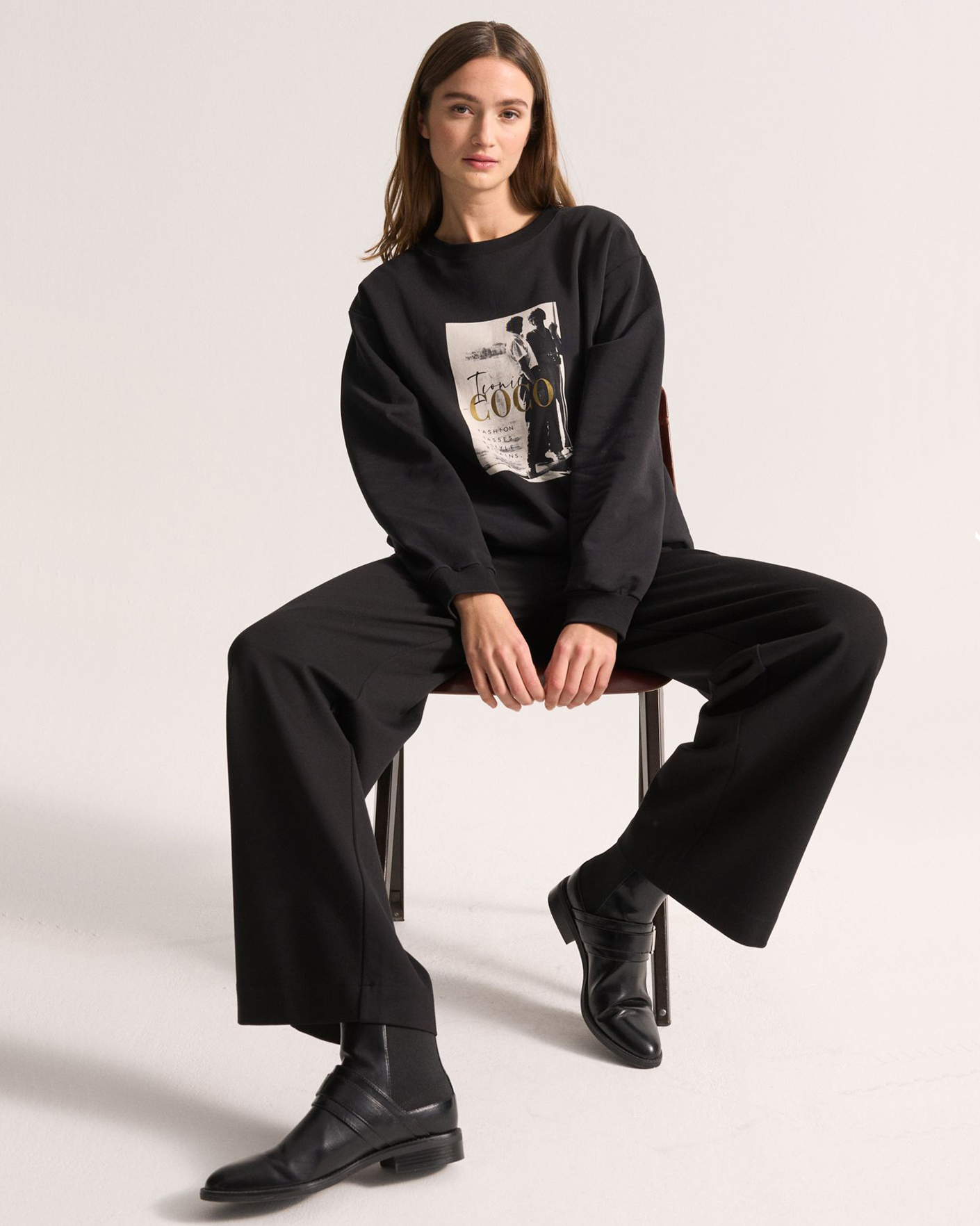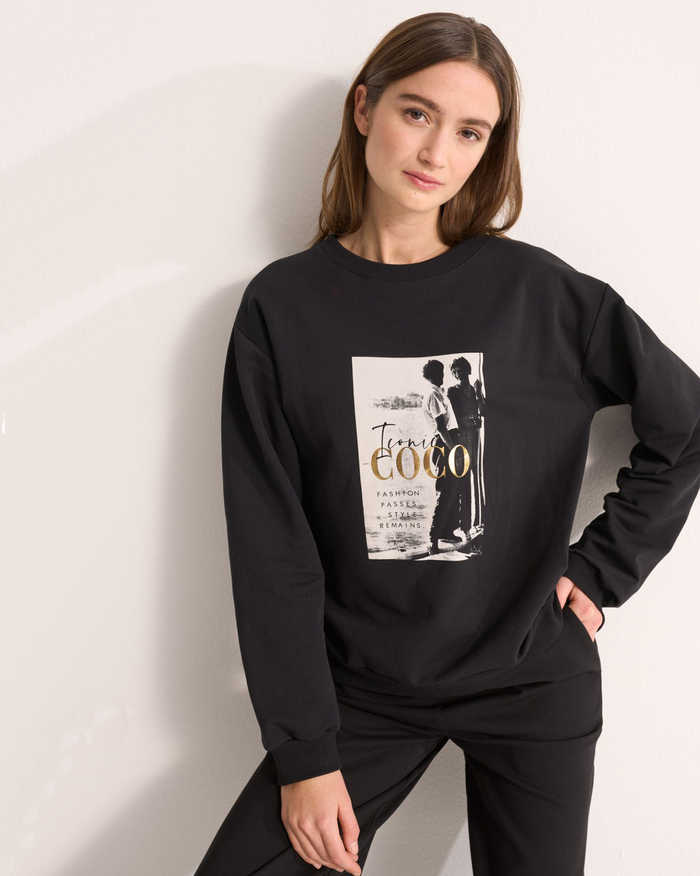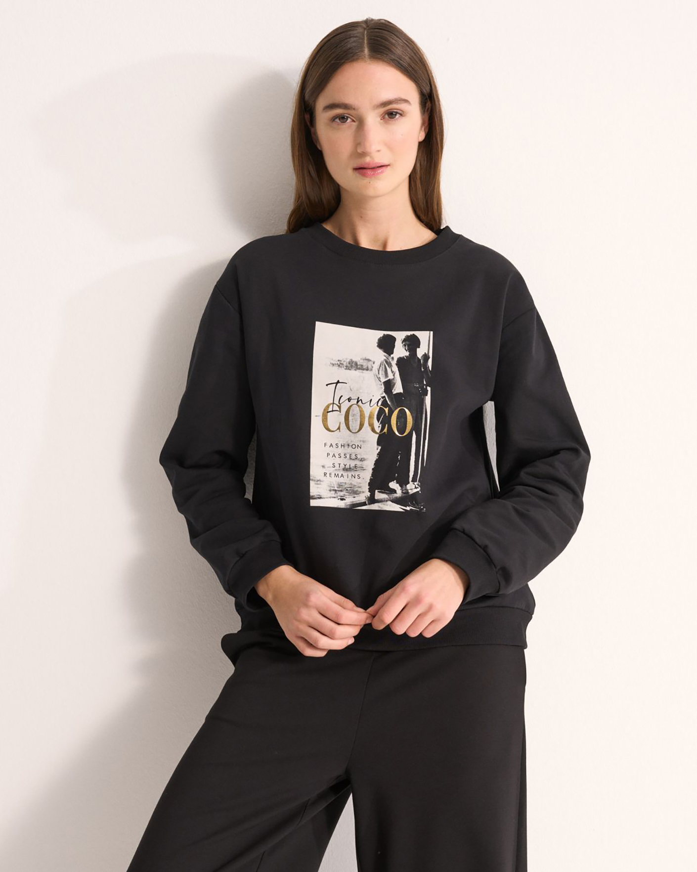 Свободный свитшот UNQ черного цвета с крупным принтом по центру. Хлопковая модель с круглым вырезом, манжетами и низом на резинке. Свитшот отлично впишется в ваш гардероб.
