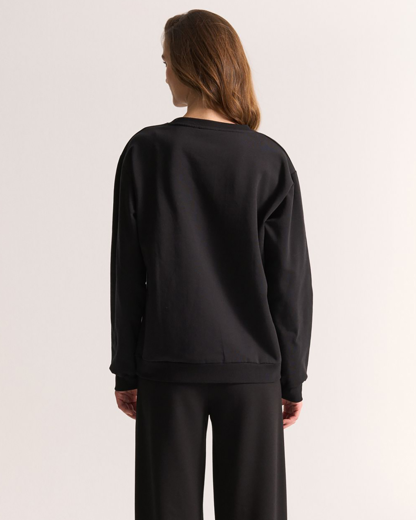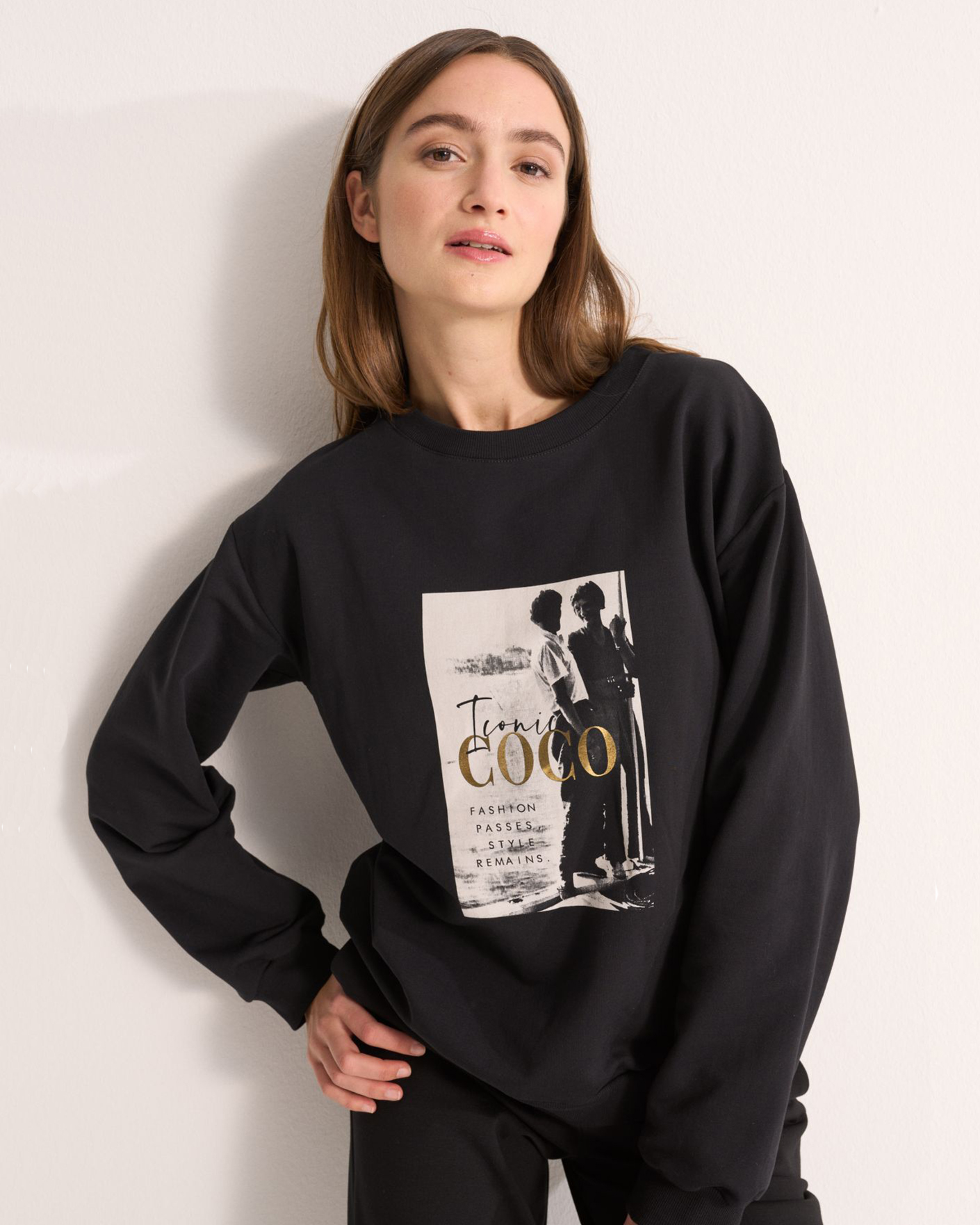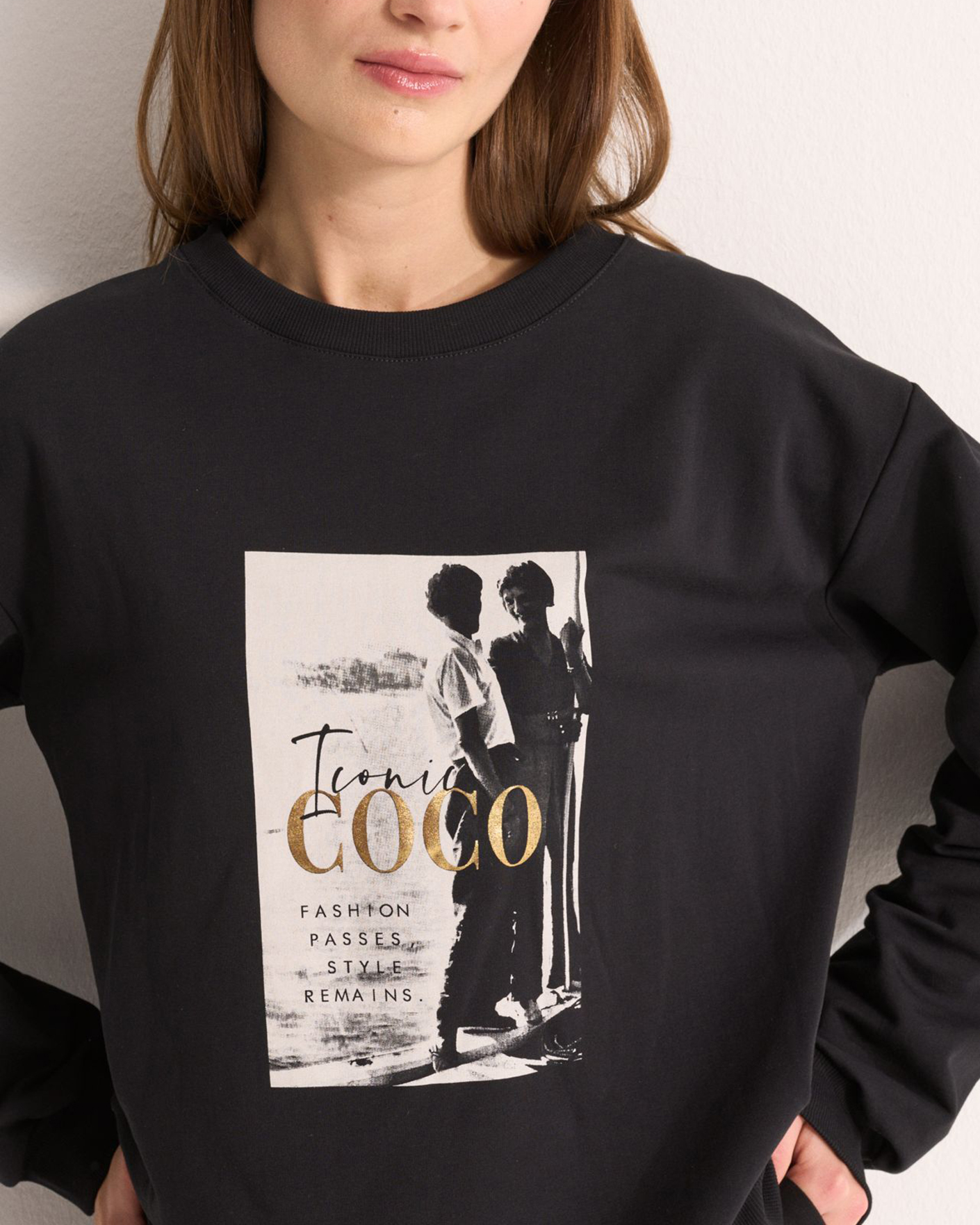 Свободный свитшот UNQ черного цвета с крупным принтом по центру. Хлопковая модель с круглым вырезом, манжетами и низом на резинке. Свитшот отлично впишется в ваш гардероб.