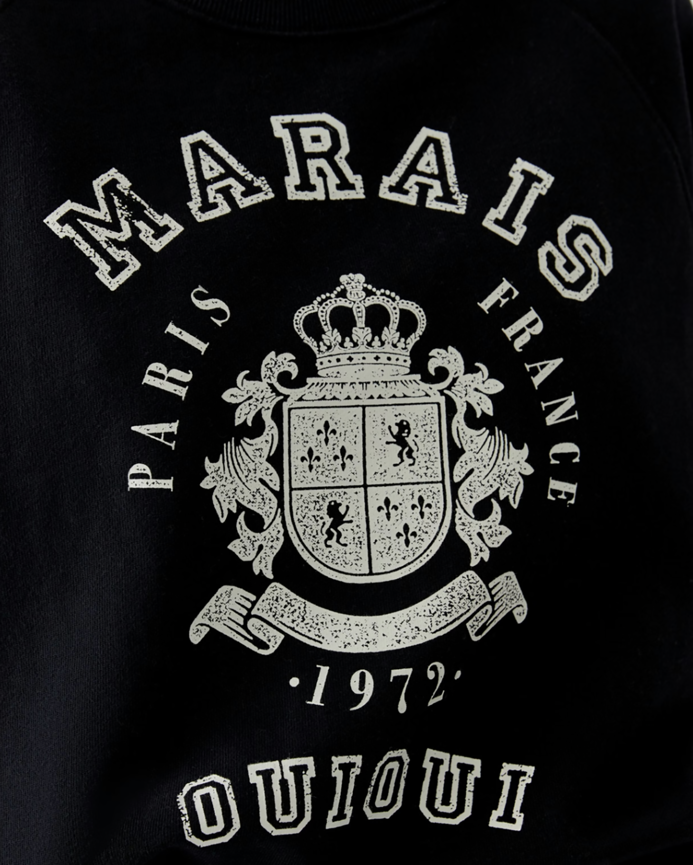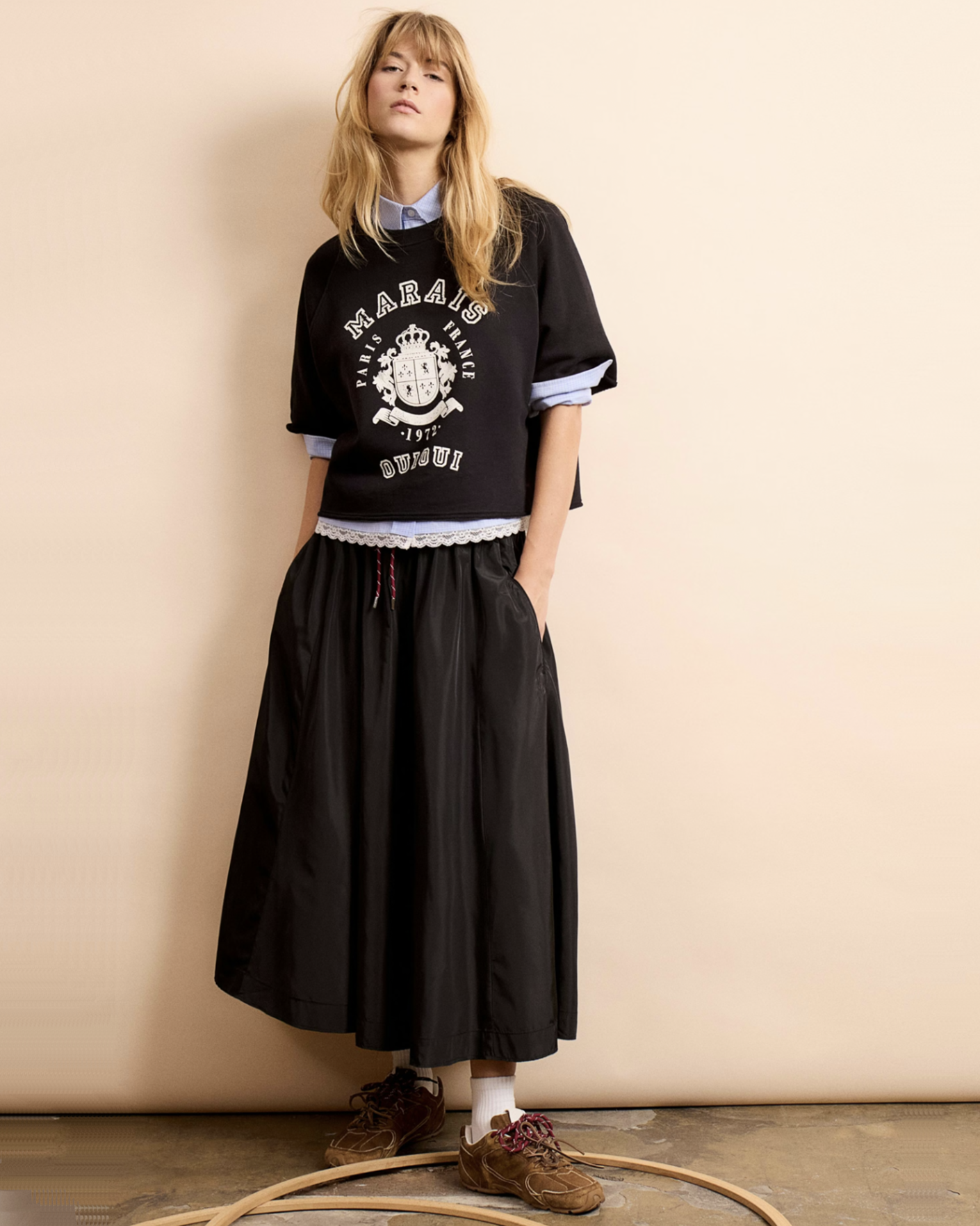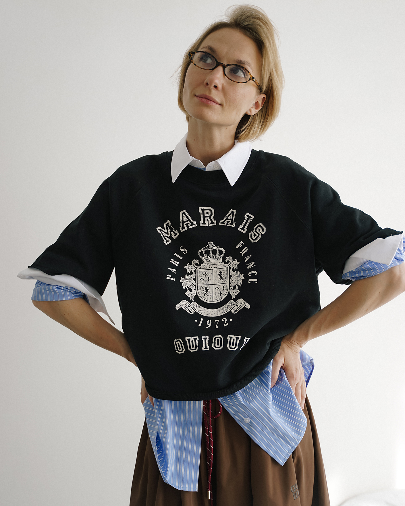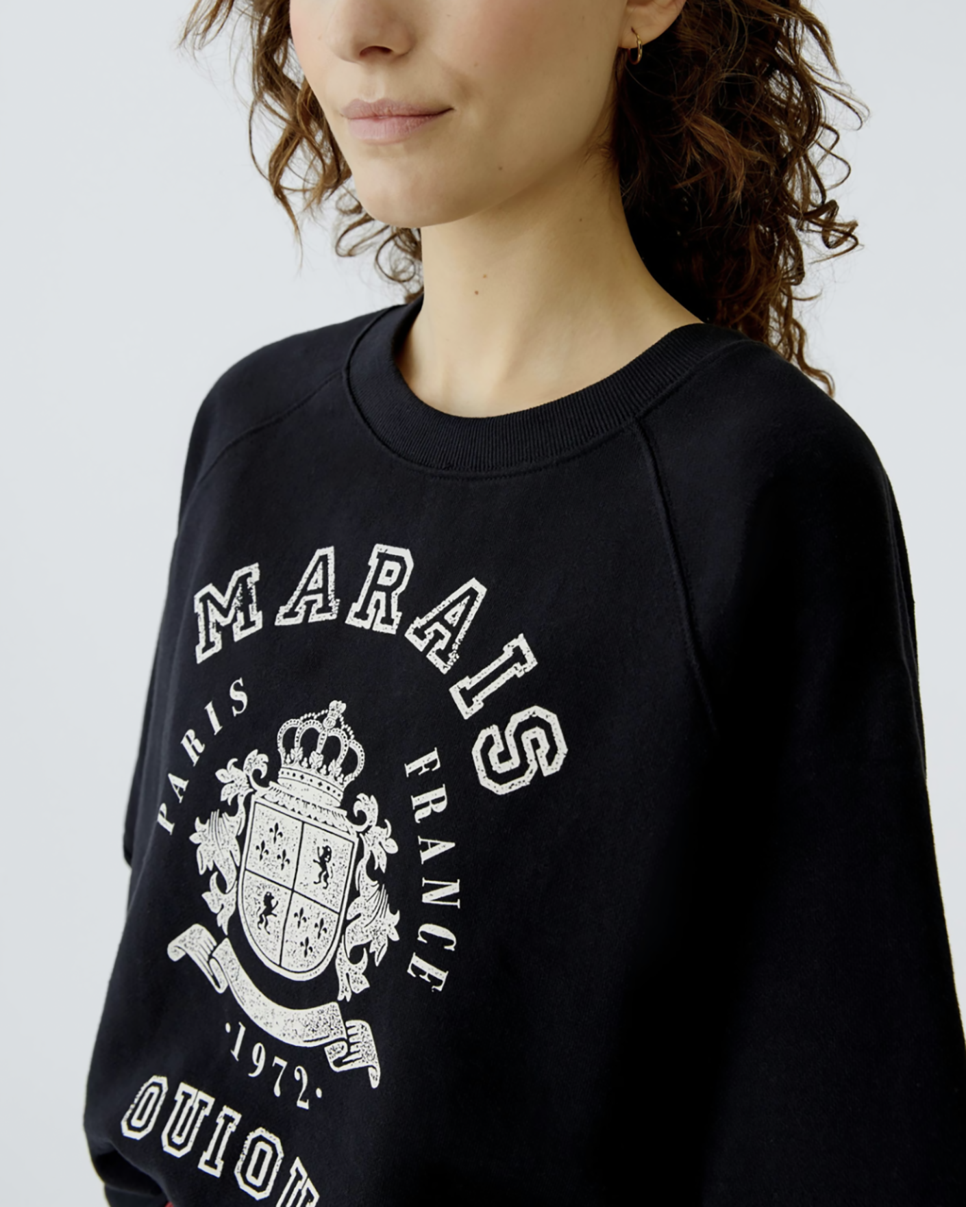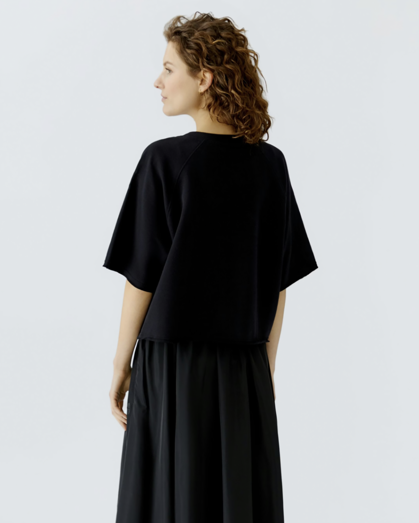 Укороченный свитшот OUI черного цвета с принтом по центру. Модель из 100% хлопка, круглый вырез, широкие короткие рукава. Свитшот можно сочетать с рубашкой, водолазкой, юбкой и брюками.