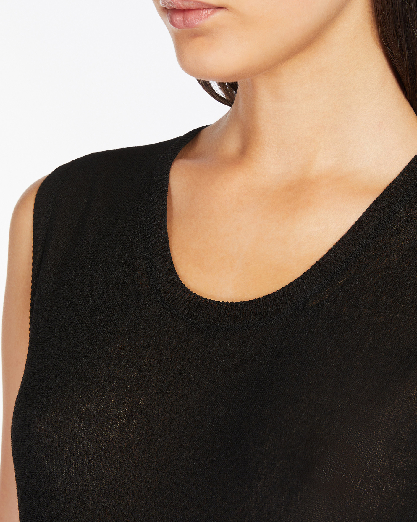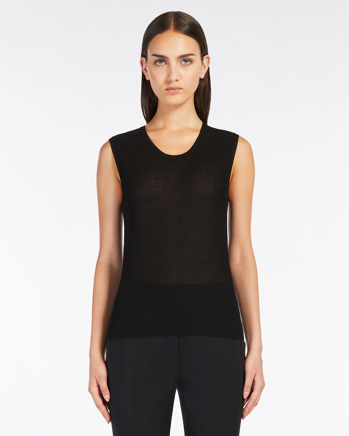 Майка Max Mara Studio черного цвета в строчный рисунок. Модель с круглым вырезом на широких лямках. Майка можно сочетать с жакетом, кардиганом, рубашкой, юбкой и брюками.