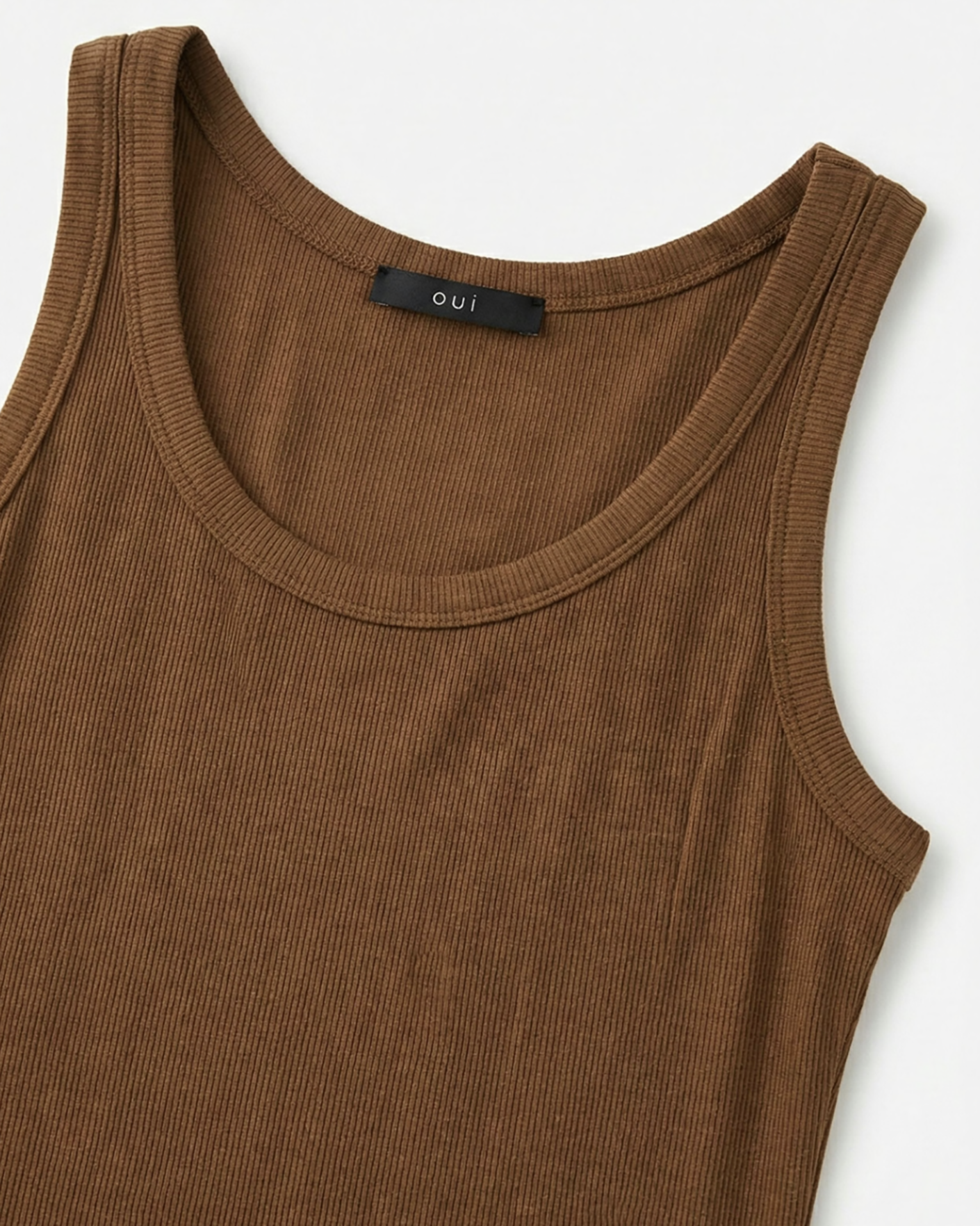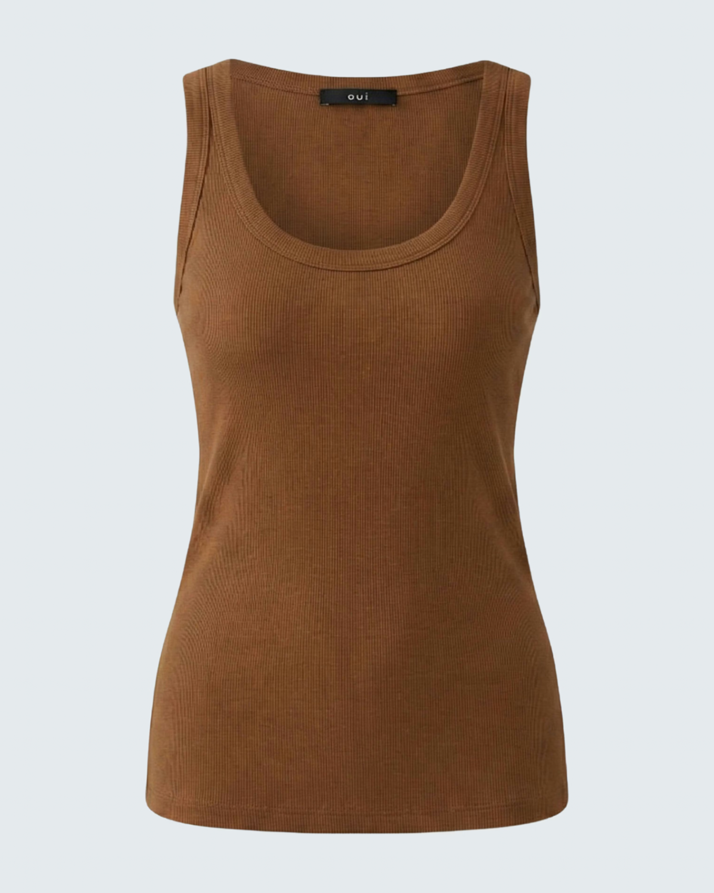 Приталенная майка OUI коричневого цвета в мелкий рубчик. Модель с круглым вырезом на широких лямках. Майка - универсальная вещь на каждый день.