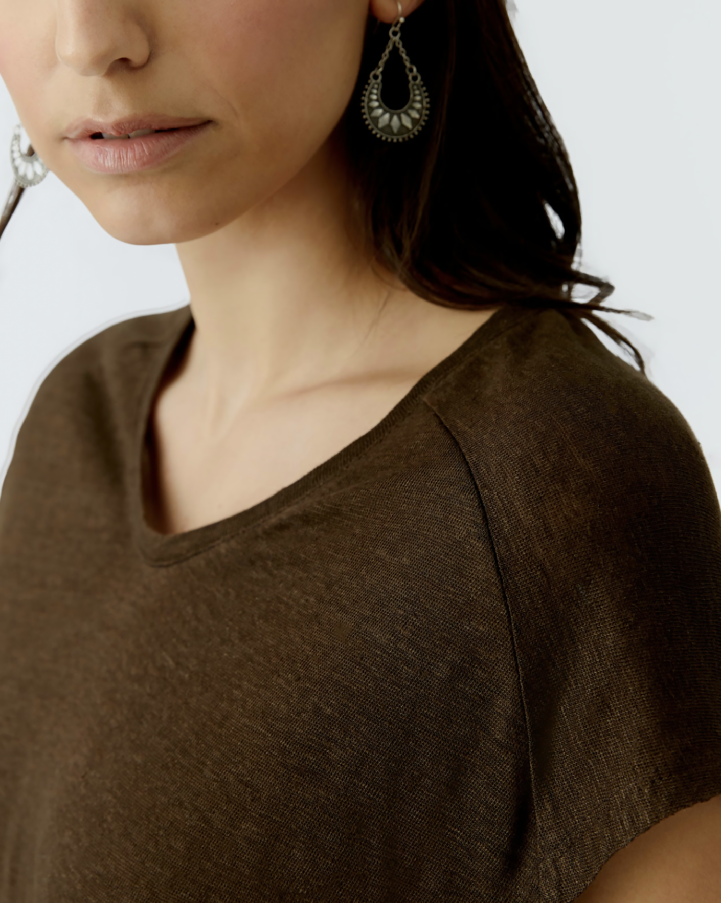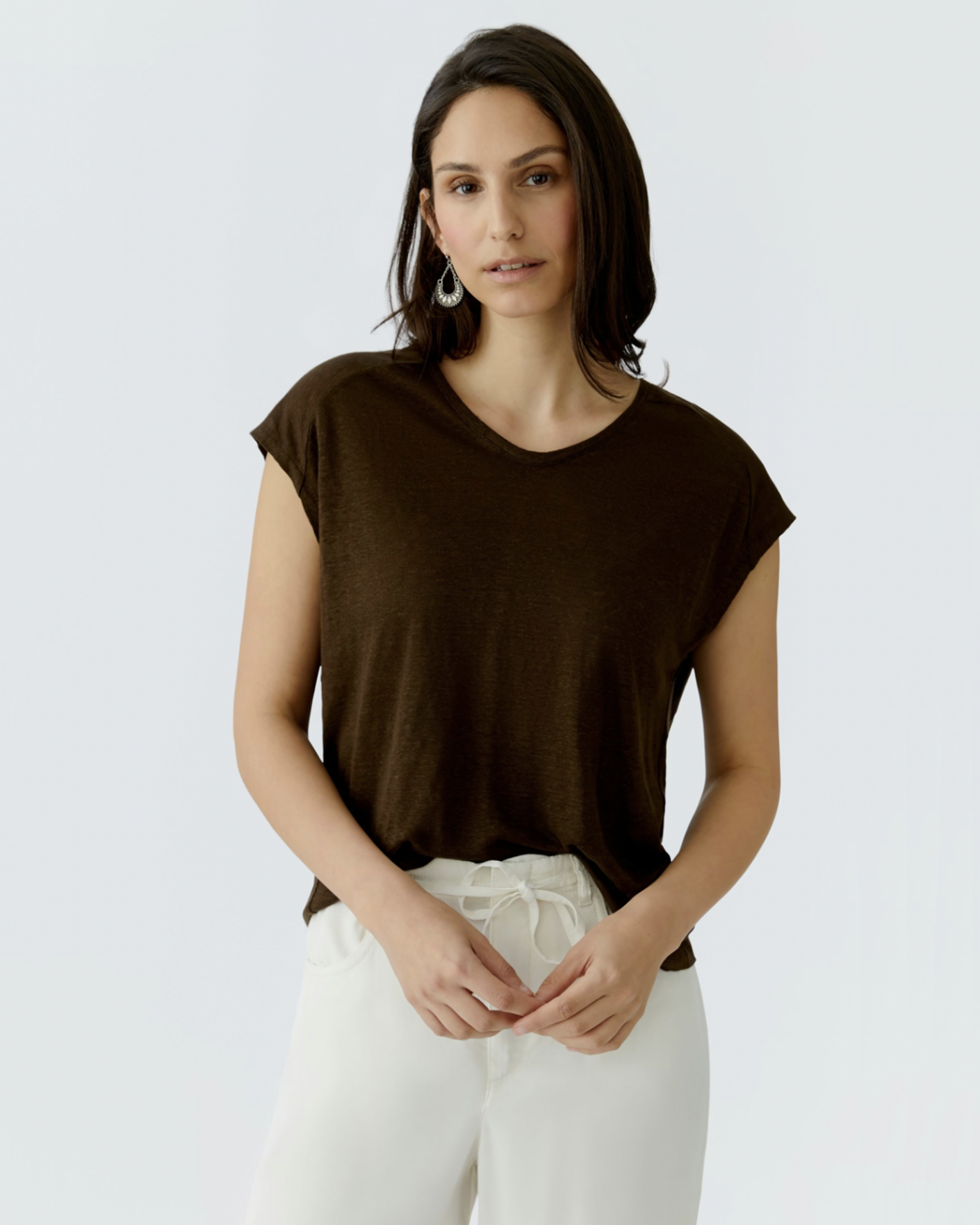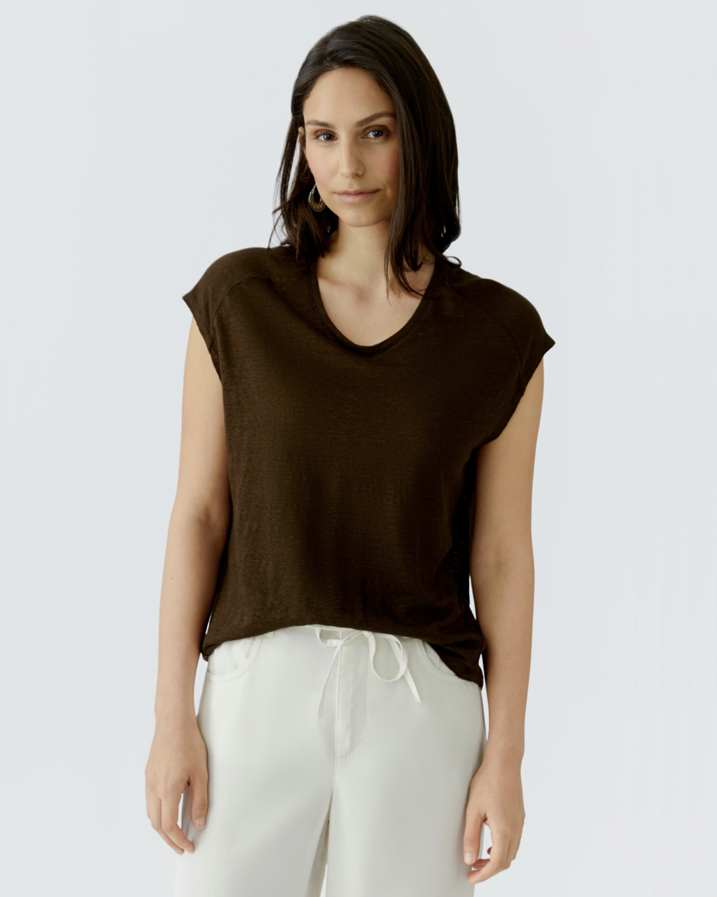 Свободная майка OUI коричневого цвета. Модель из 100% льна, V-образный вырез, спущенная линия плеча. Майка станет идеальным спутником в жаркий день.