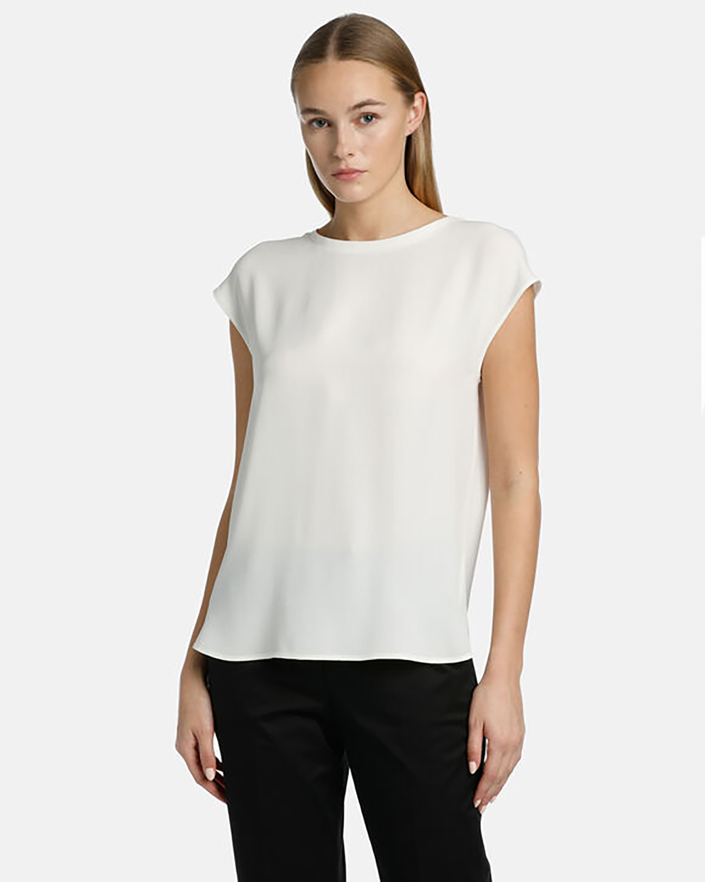 Топ Luisa Spagnoli белого цвета. Модель с круглым вырезом, спущенная линия плеча без рукавов. Топ можно сочетать с кардиганом, жакетом, юбкой и брюками.
