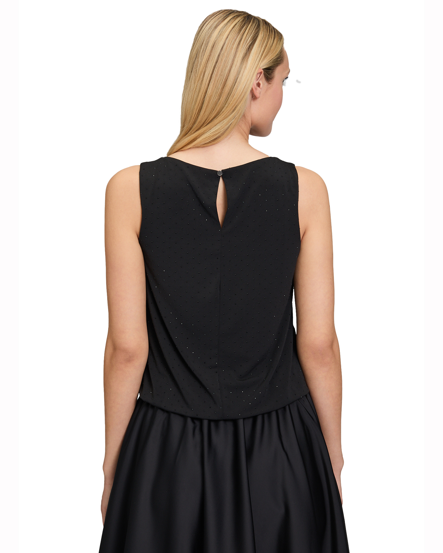 Свободный топ Vera Mont черного цвета с декором в виде страз. Модель с круглым вырезом и небольшим каплевидным разрезом сзади на пуговице. Топ отлично впишется в ваш гардероб.