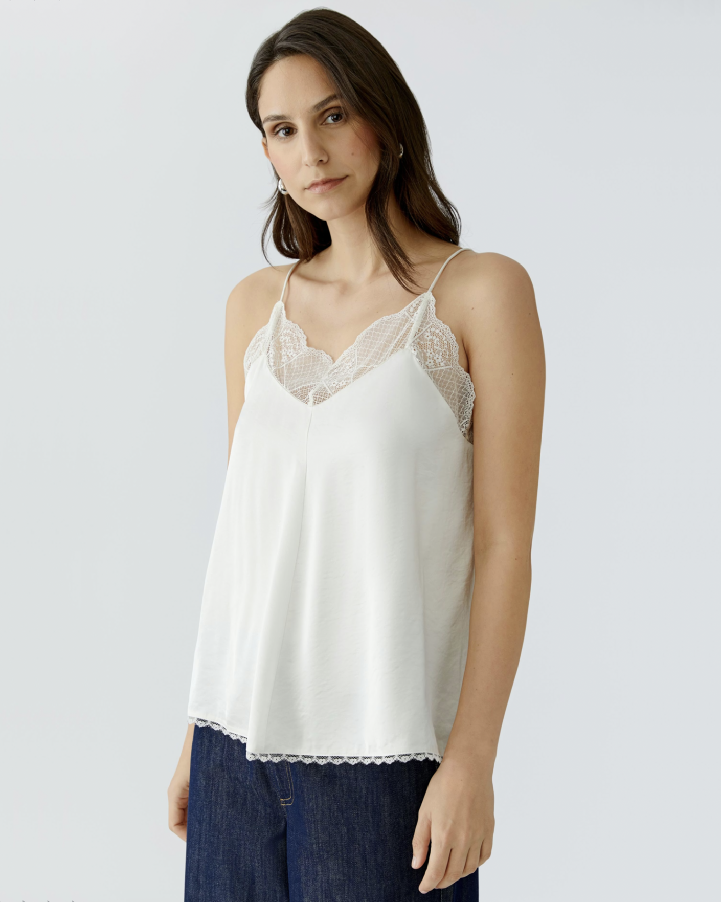 Топ OUI белого цвета. Модель с декором в виде кружева по краю. Тонкие бретели. Топ отлично сочетается с любым гардеробом.