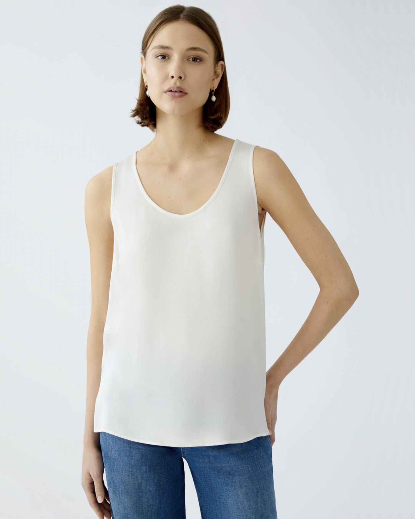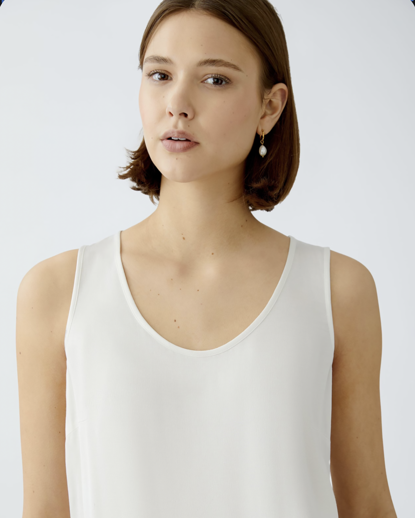 Свободный топ OUI белого цвета. Модель с овальным вырезом на широких лямках. Топ можно сочетать с жакетом, кардиганом, юбкой и брюками.