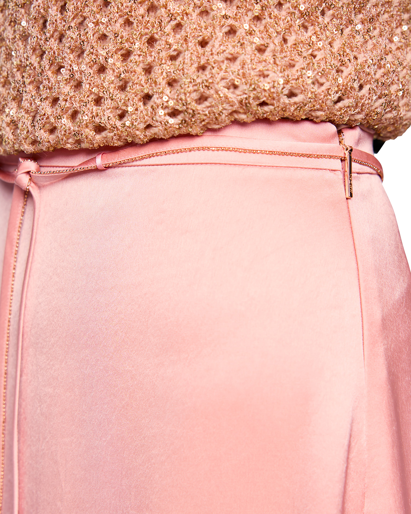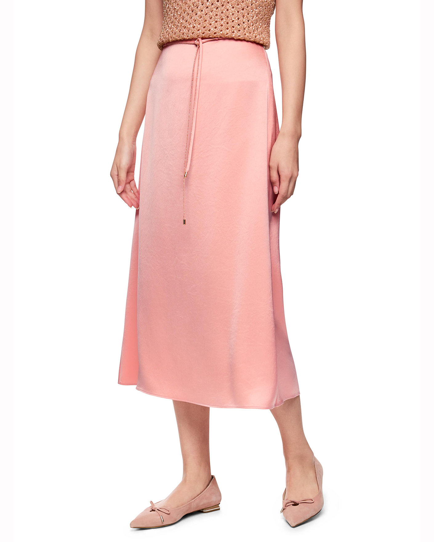 Юбка Marc Cain Collection бежево-розового цвета с атласным блеском. Модель А-силуэта, высокая посадка с застежкой на потайную молнию сзади. Имеется аккуратный пояс-шнурок в тон. Длина миди. Юбку можно сочетать с топом, джемпером, кардиганом, жакетом.