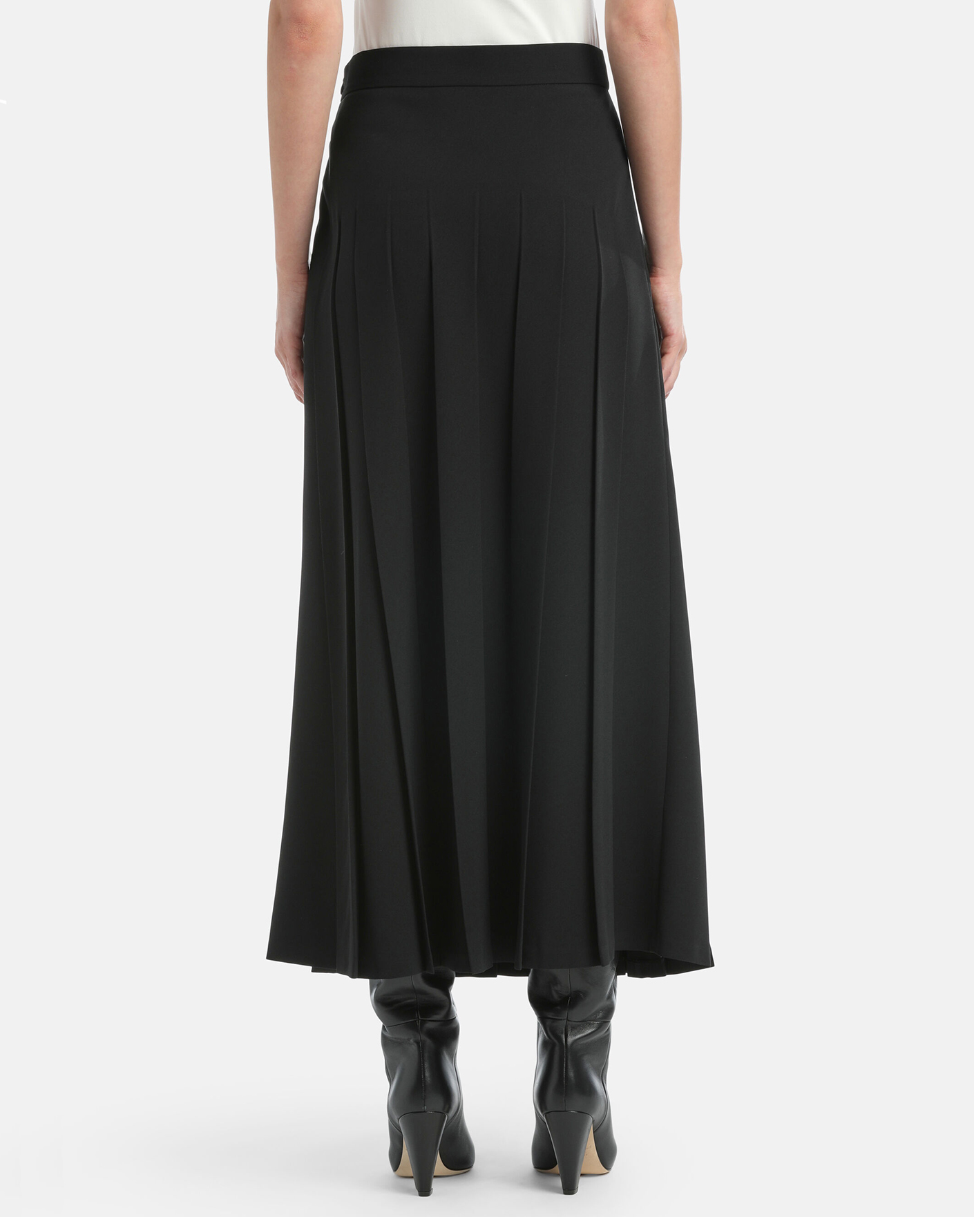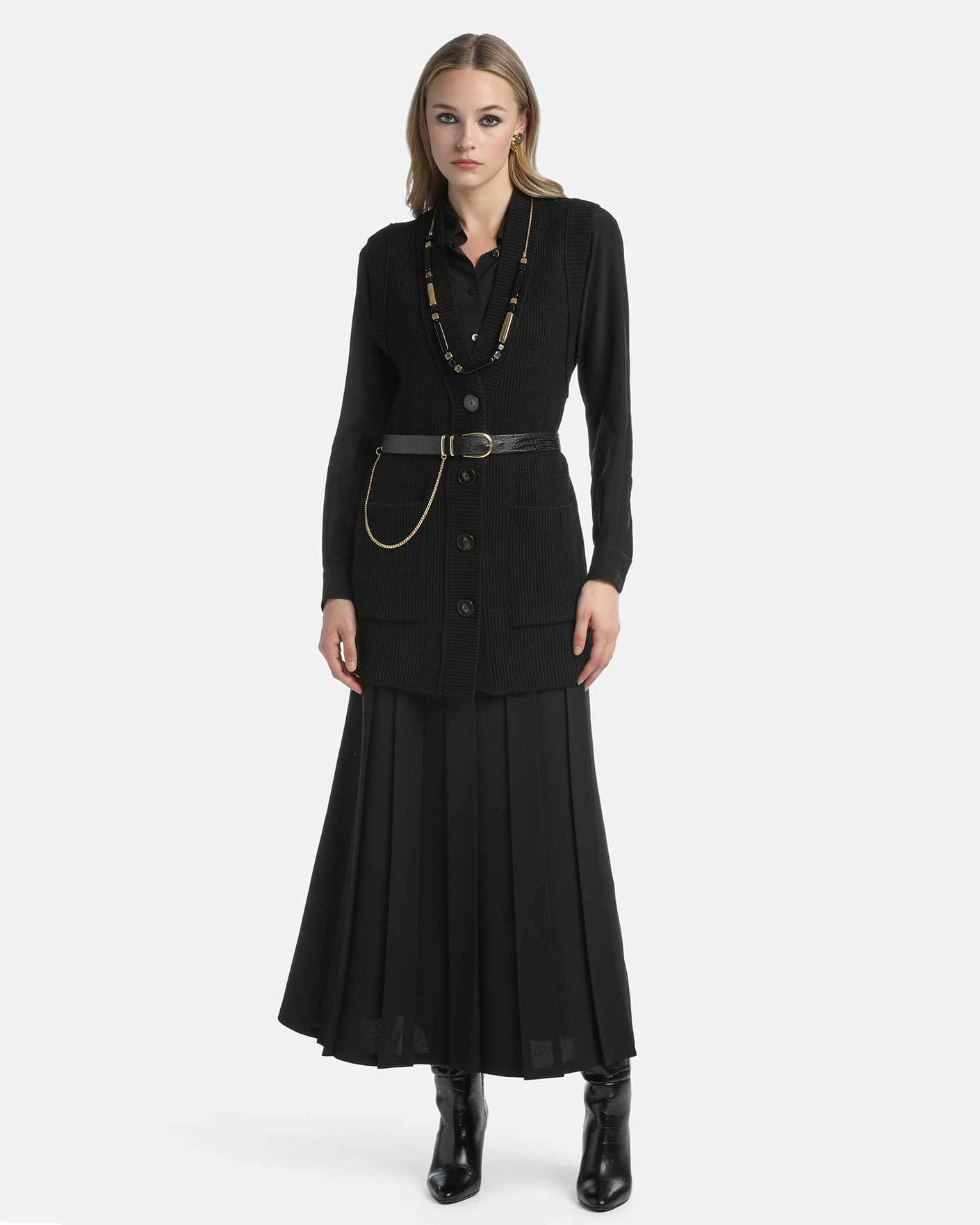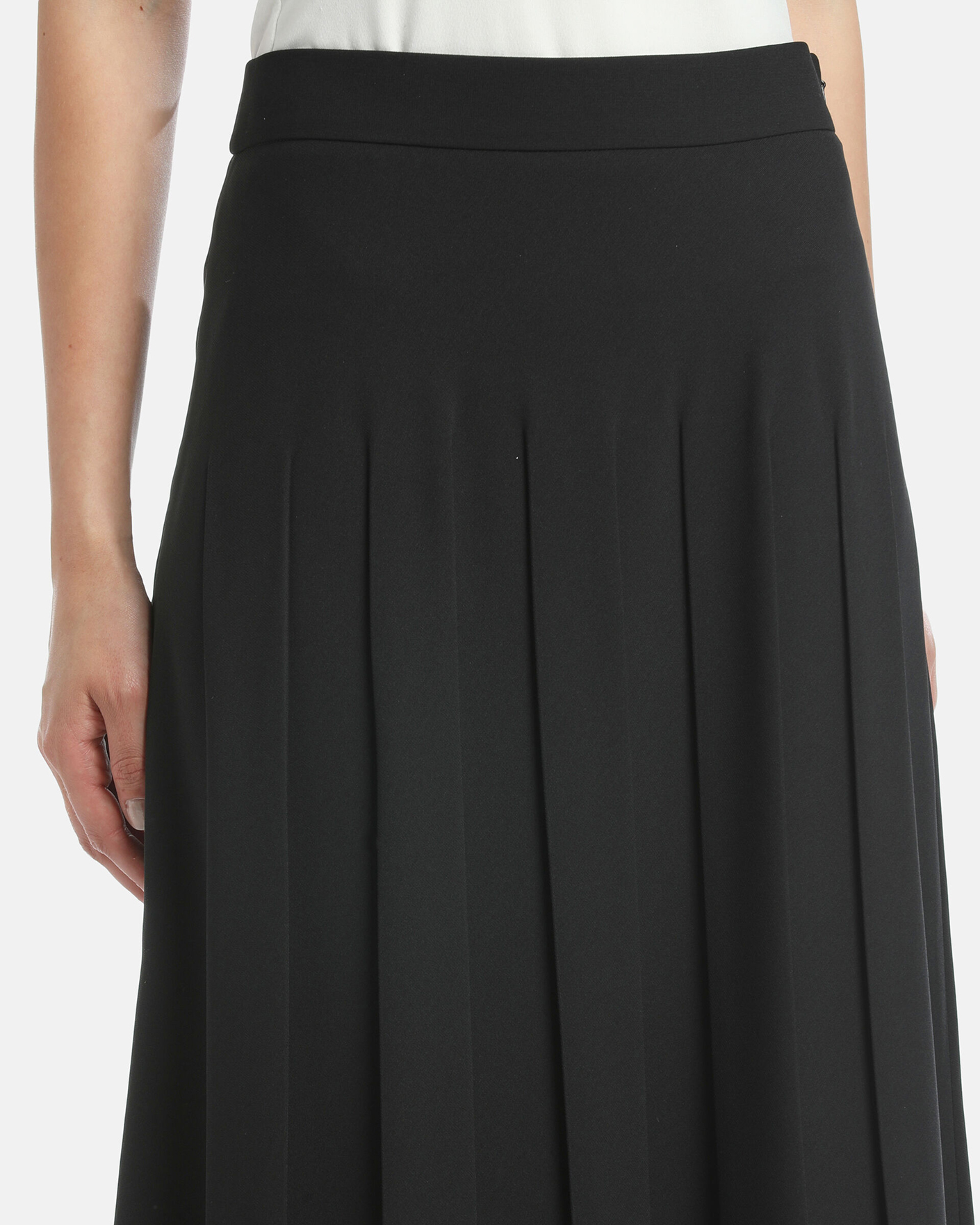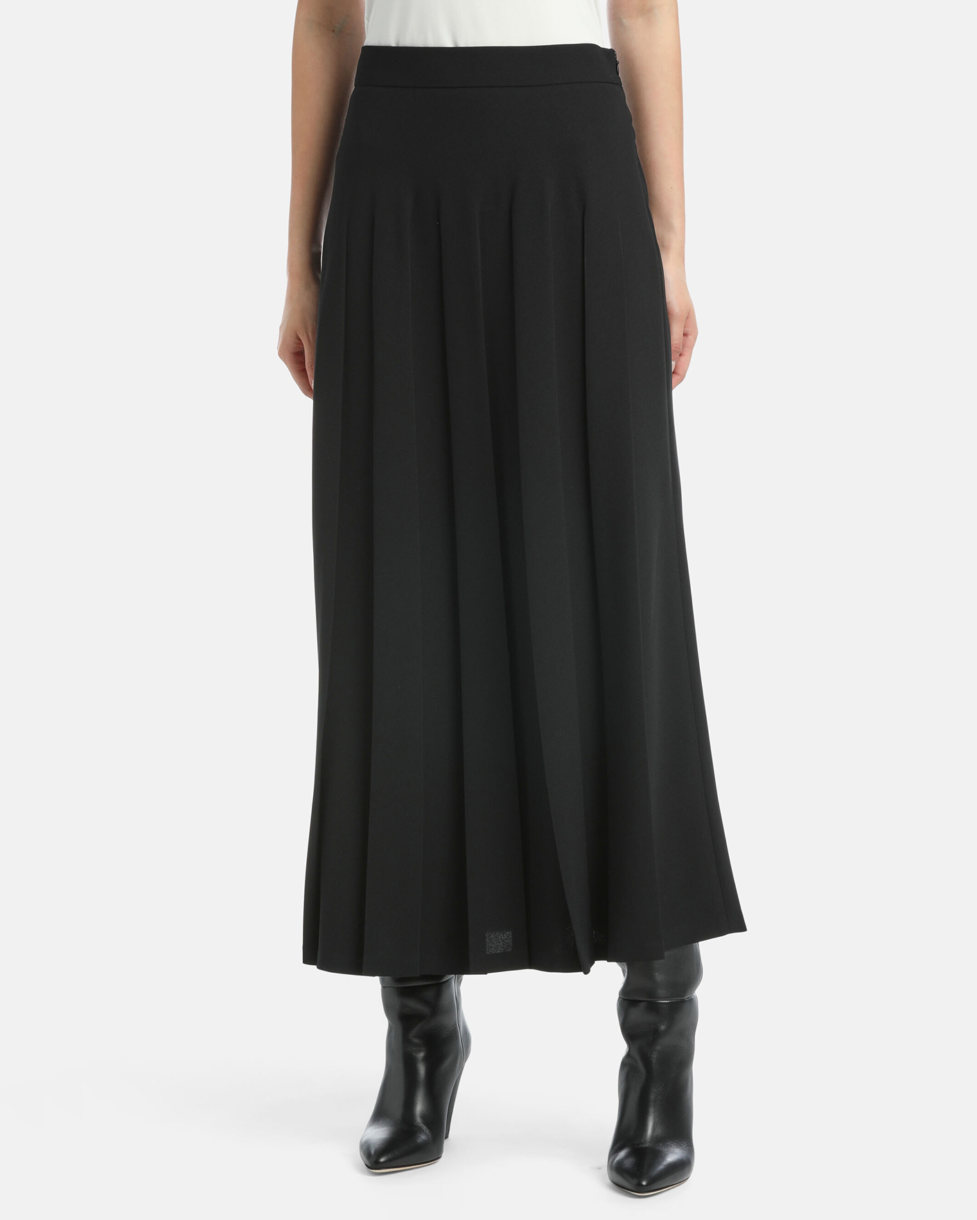 Идеальная юбка Luisa Spagnoli черного цвета в складку. Модель высокой посадки, застежка на потайную молнию сбоку, длина миди. Юбку можно сочетать с рубашкой, блузой, кардиганом, джемпером, жакетом.