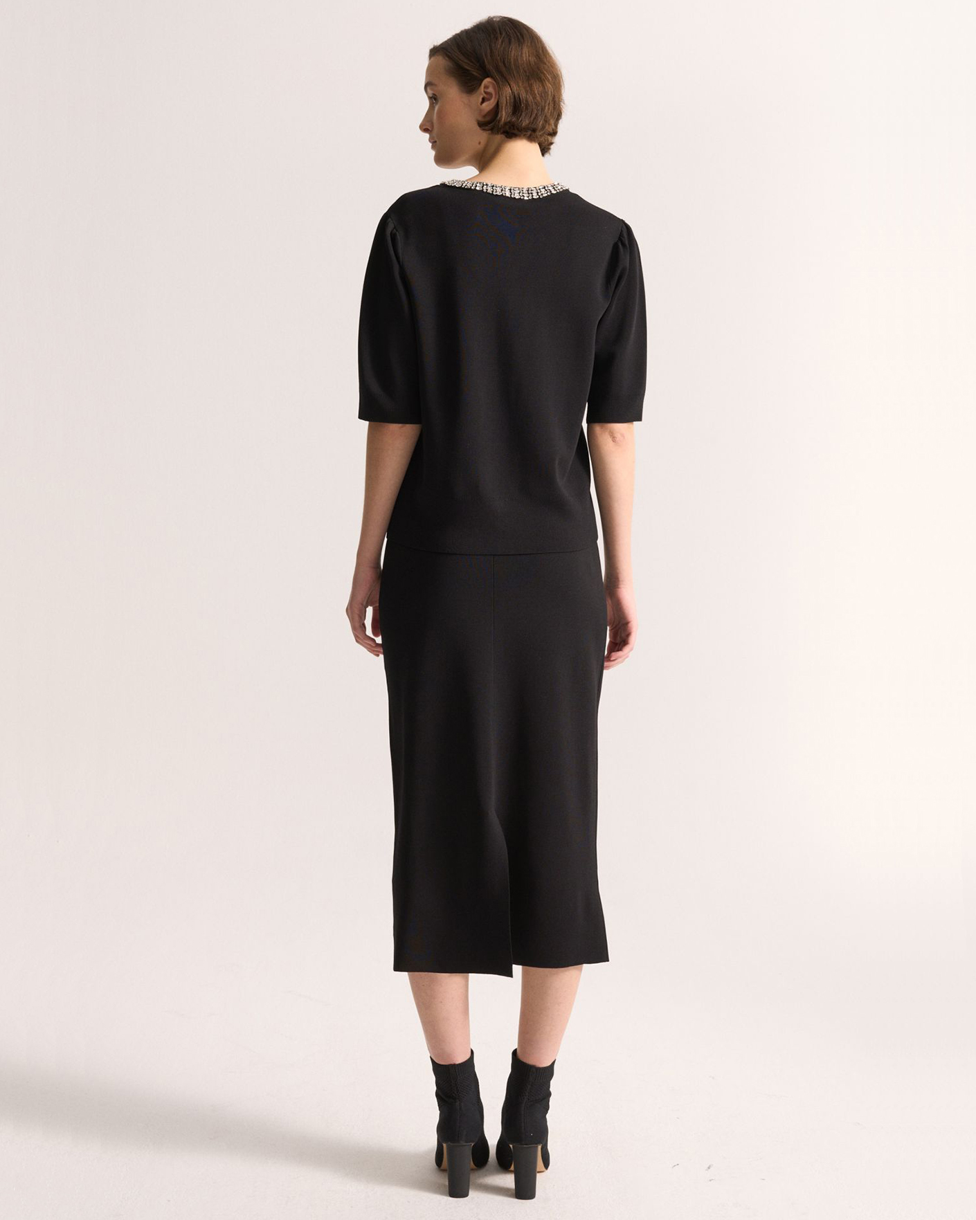Юбка-карандаш UNQ черного цвета в строчный рисунок. Модель высокой посадки на эластичном поясе, длина миди. Идеальная юбка станет фаворитом вашего гардероба.